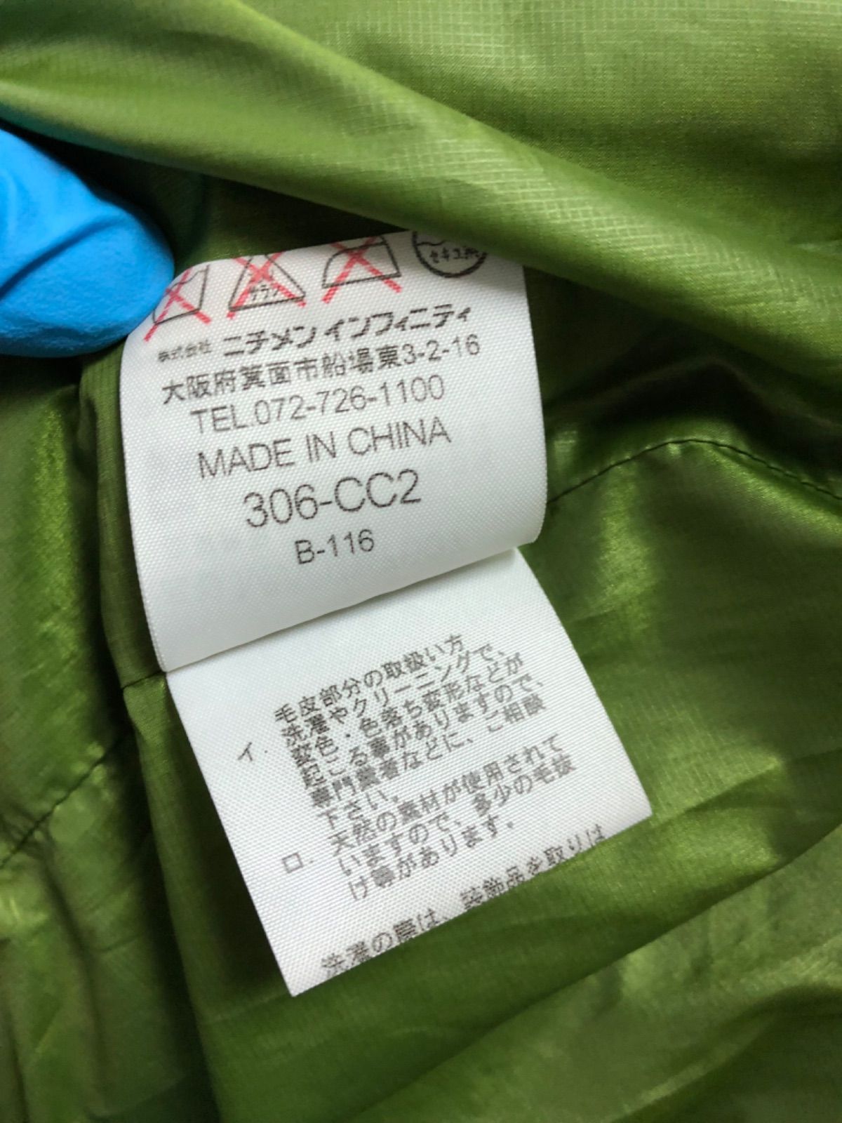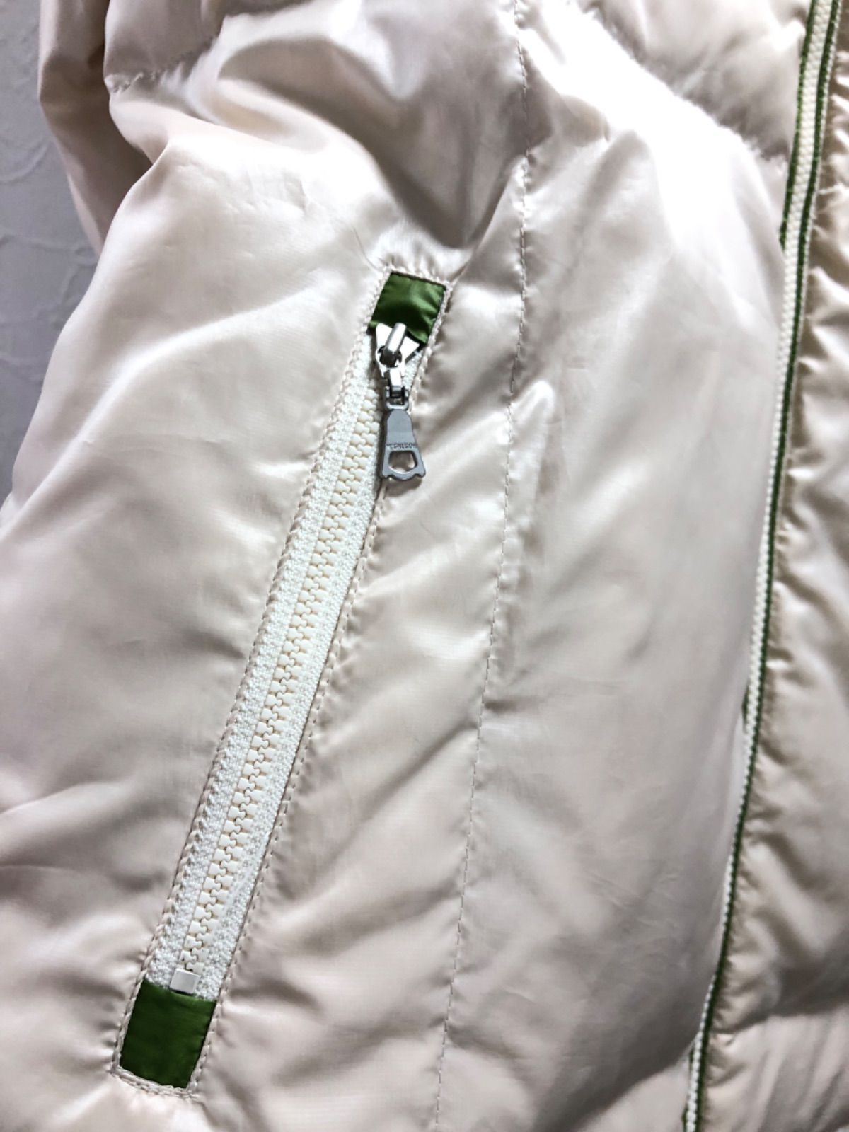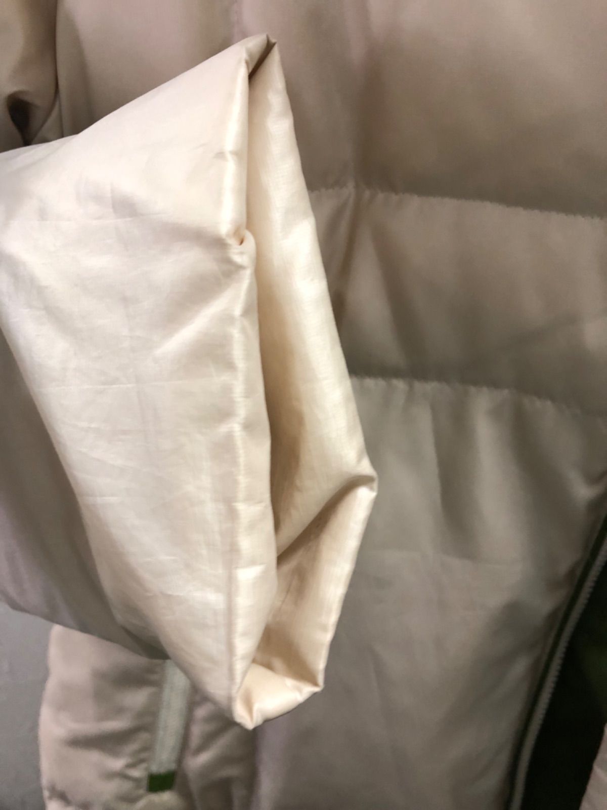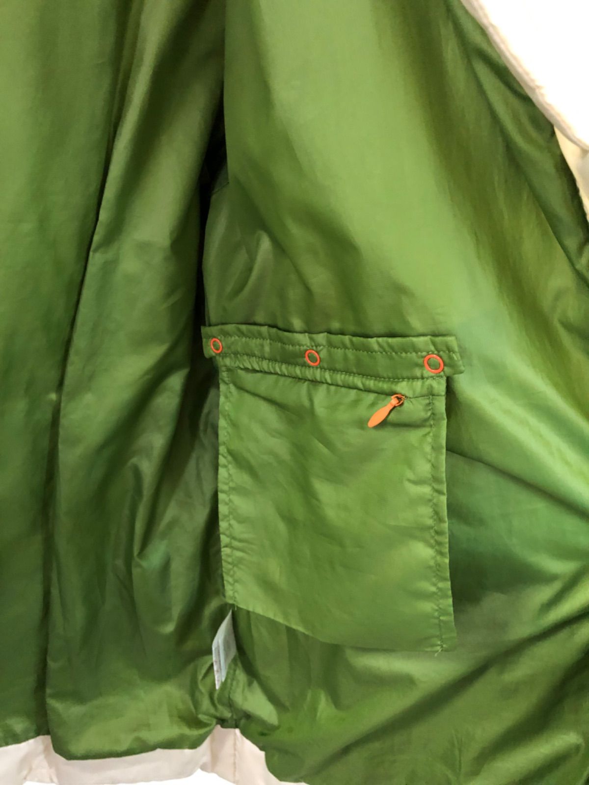 色も綺麗なベージュで軽くて着心地は良いです。中は鮮やかな黄緑色で素敵なダウンジャケット 二の腕部分にロゴのワッペンがありおしゃれポイントです。内ポケット一つありいざという時に使えるポケットです。