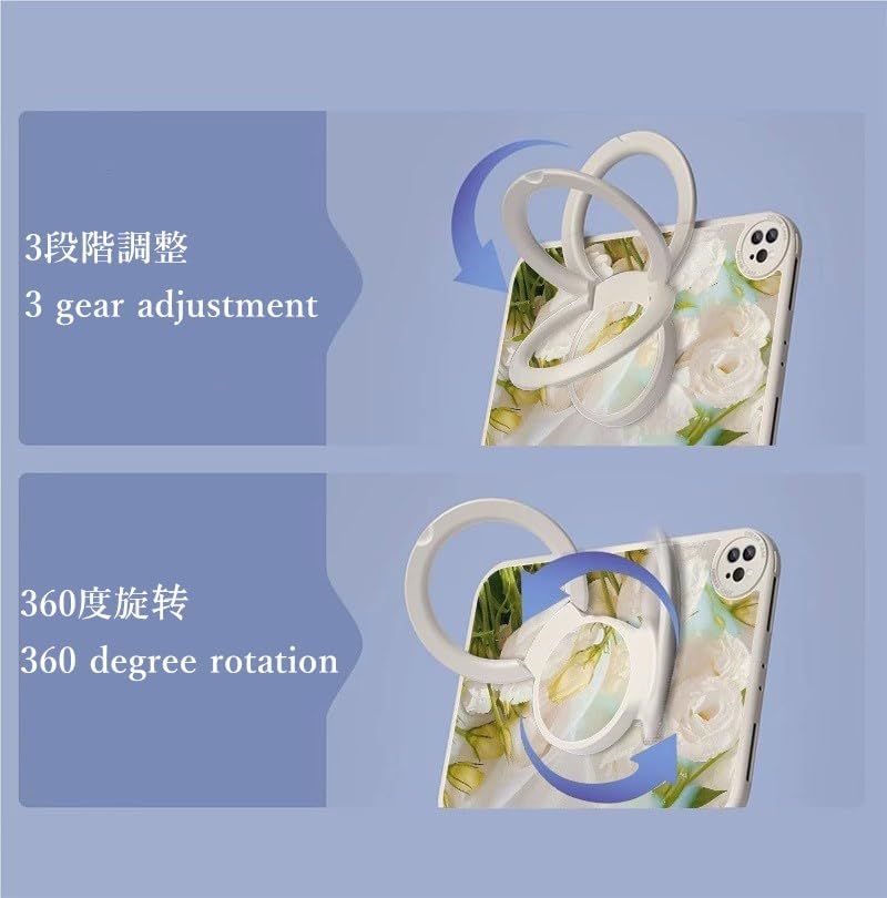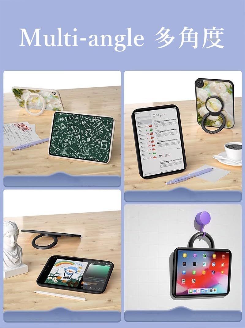 360°回転 + 縦置き対応 :本体背面には360度自由に回転できるリングスタンドを搭載。縦置き・横置きともに安定して使用でき、動画視聴、オンライン授業、読書などがより快適になります,使い勝手が抜群。