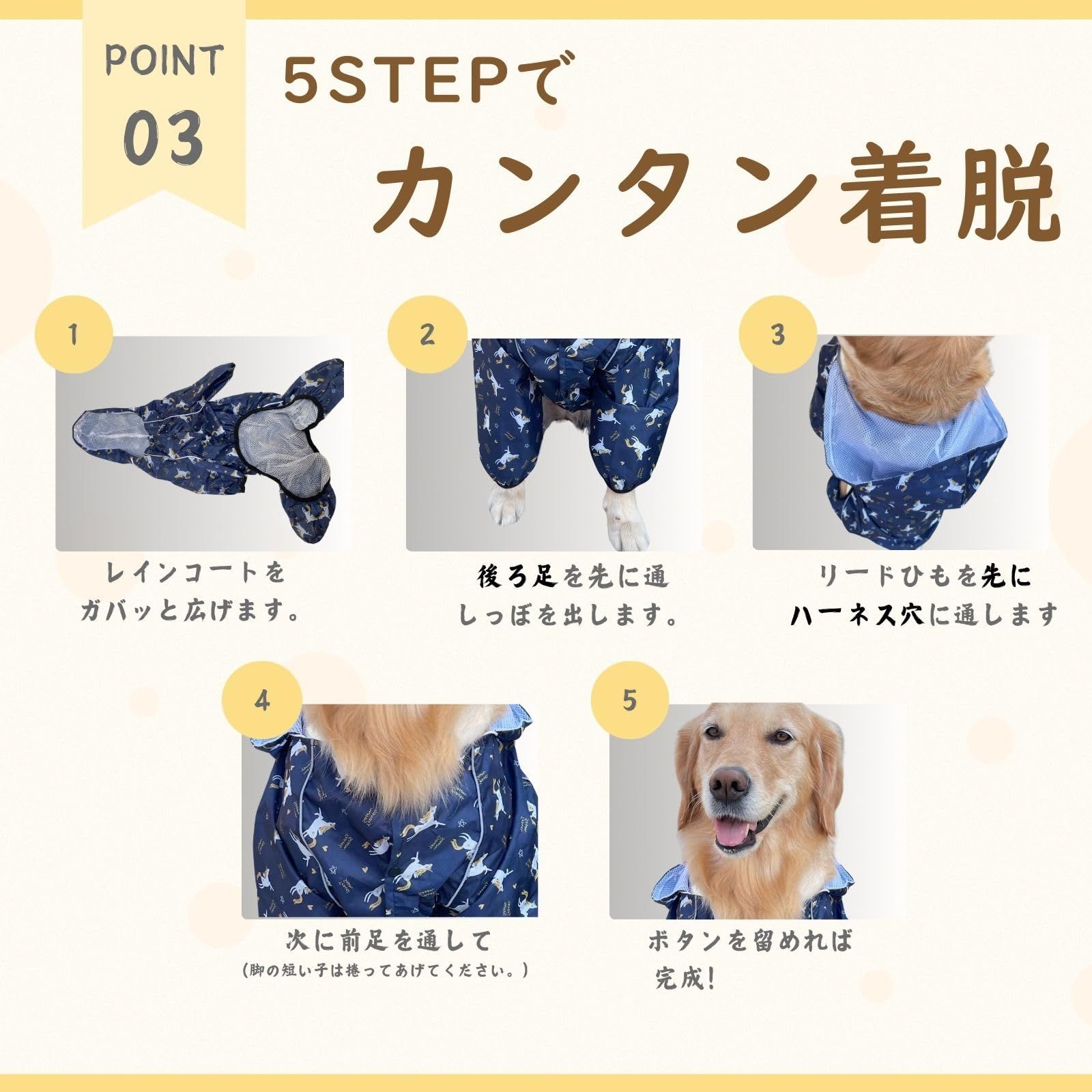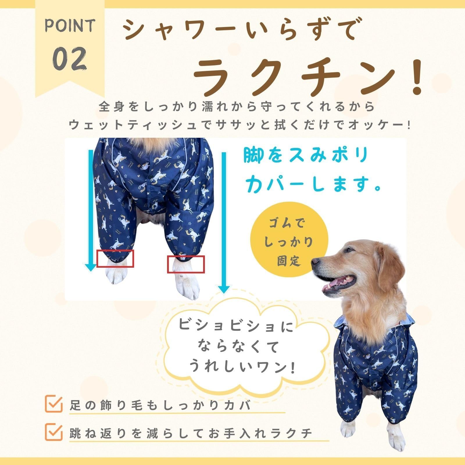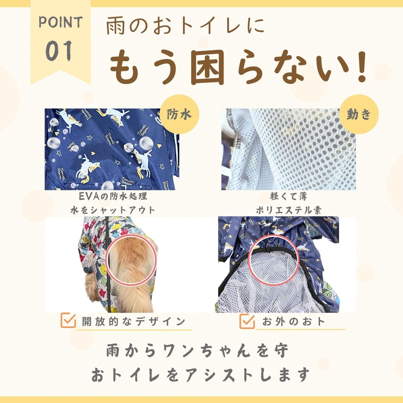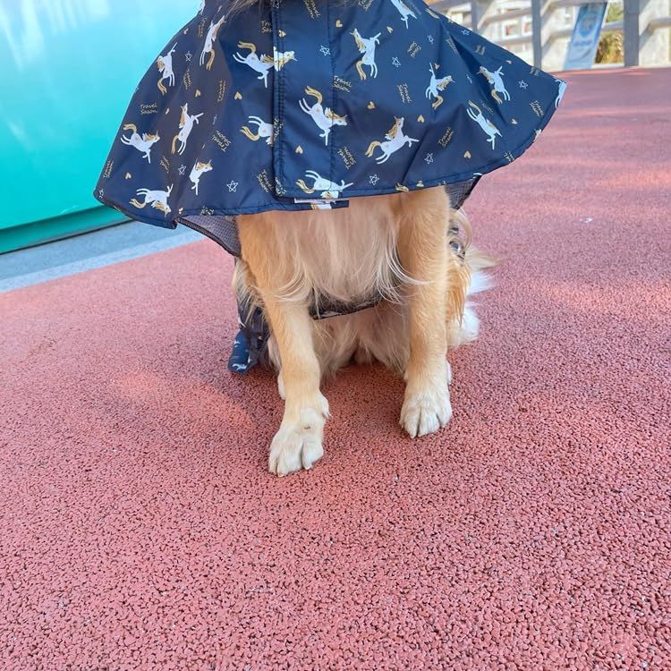 【梅雨時期のお散歩に】 便利なリード穴付き、犬用リードと一緒に使うと、雨の日でも愛犬との散歩することができます。全身を覆ってくれるレインコートです。お腹も脚も、しっかりカバーできます。帽子はドローコードで調整可能で、頭ブルブルを振っても外れにくいですよ。