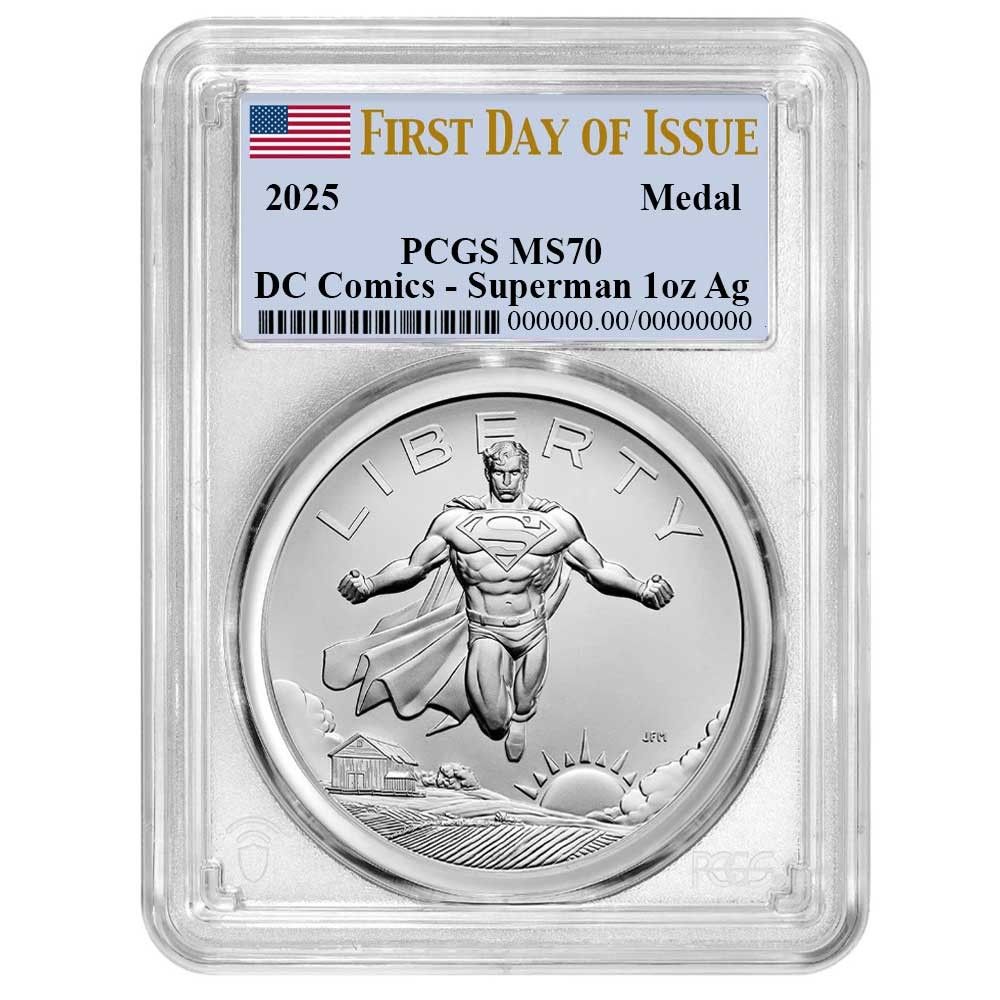 2025年 スーパーマン DCコミックス 1オンス シルバーメダル PCGS MS70 FDOI フラッグラベル2025 Superman DC Comics 1 oz Silver Medal PCGS MS70 FDOI Flag Label