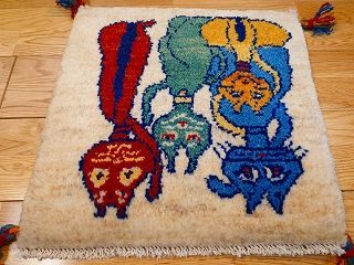イラン・シラーズ地方の遊牧民(カシュガイ族)が、下絵を元にせず、羊やテント、動物や自然等をモチーフに、自分のインスピレーションで織り描く素朴な手織り絨毯です。基本的に、世界に1枚しかない一枚です。