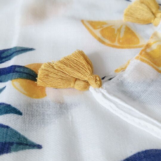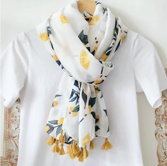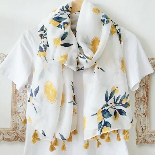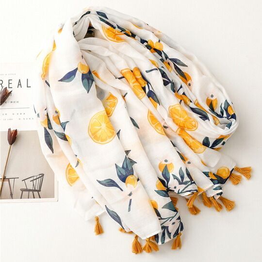 鮮やかなレモンのプリントが爽やかで新鮮な印象を与え、夏の装いにぴったり。薄手で肌触り良く、首元をすっきりと彩ります。