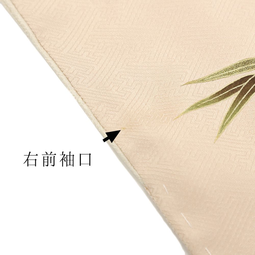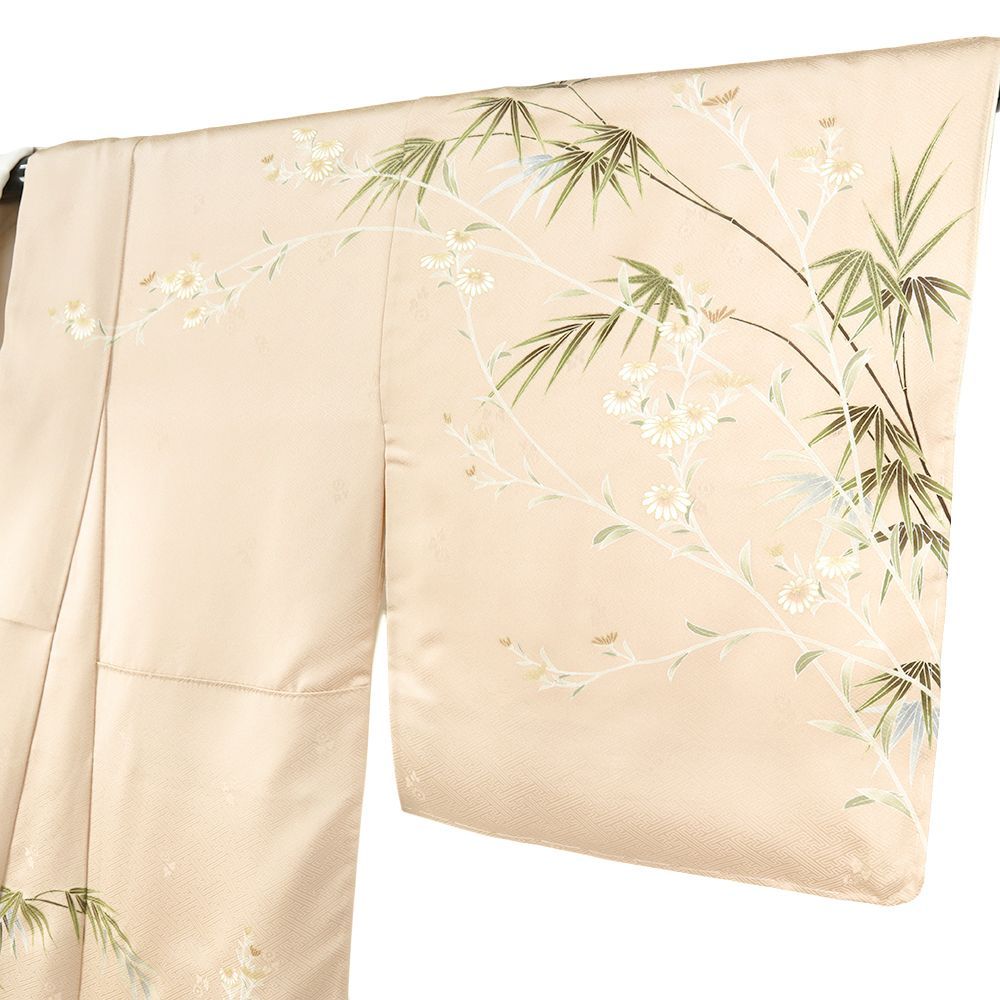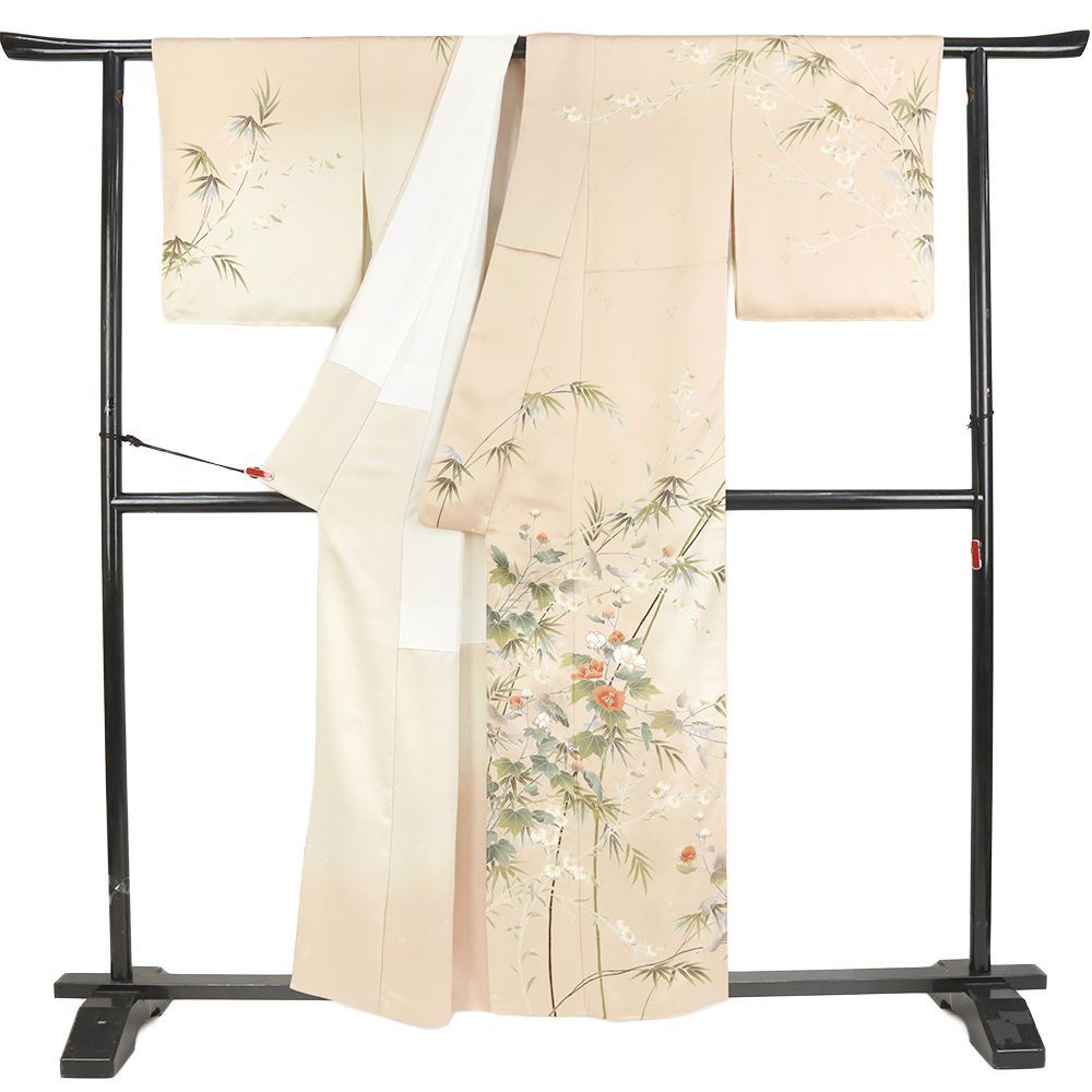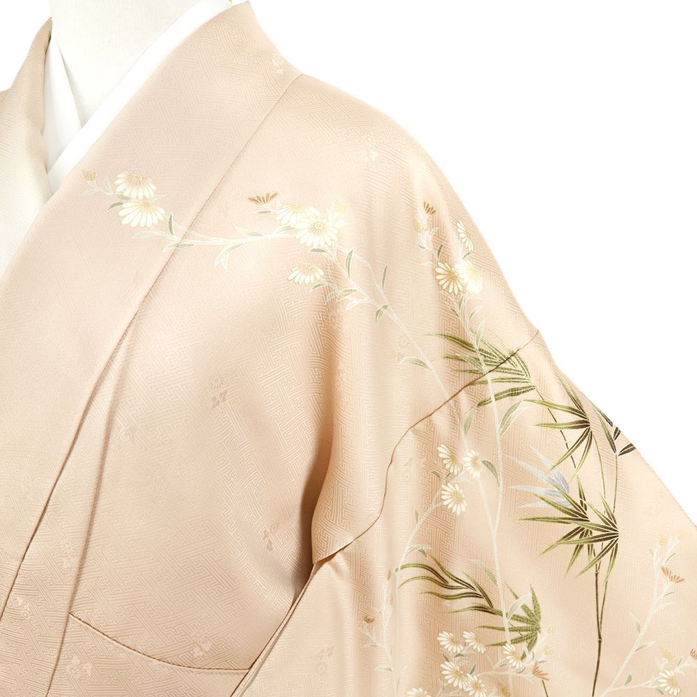【 中古 】 訪問着 正絹 七五三 ピンクベージュ 芙蓉 菊 笹 紗綾形 金駒刺繍 着物 新古品 身丈162.2cm 裄66cm Mサイズ 友禅染 縮緬 綸子 仕立て上がり リサイクル お洒落 セミフォーマル 礼装用 結婚式 No.i3-0963