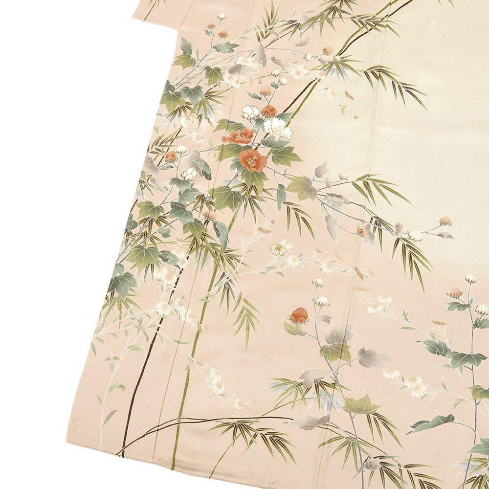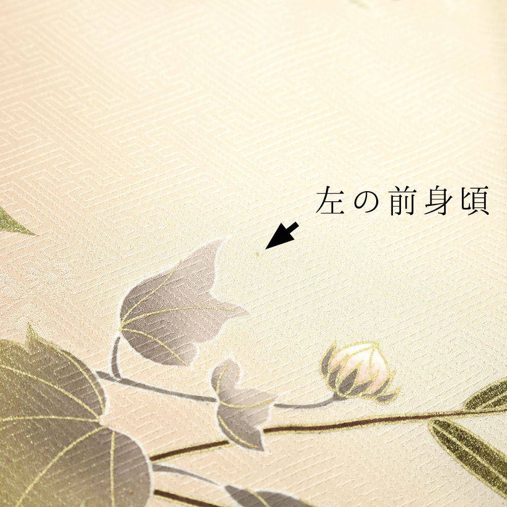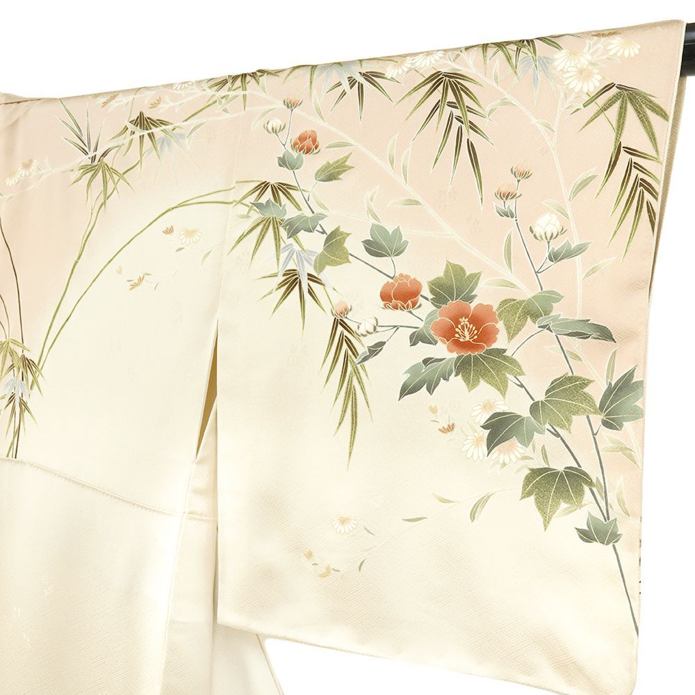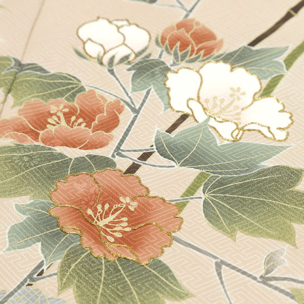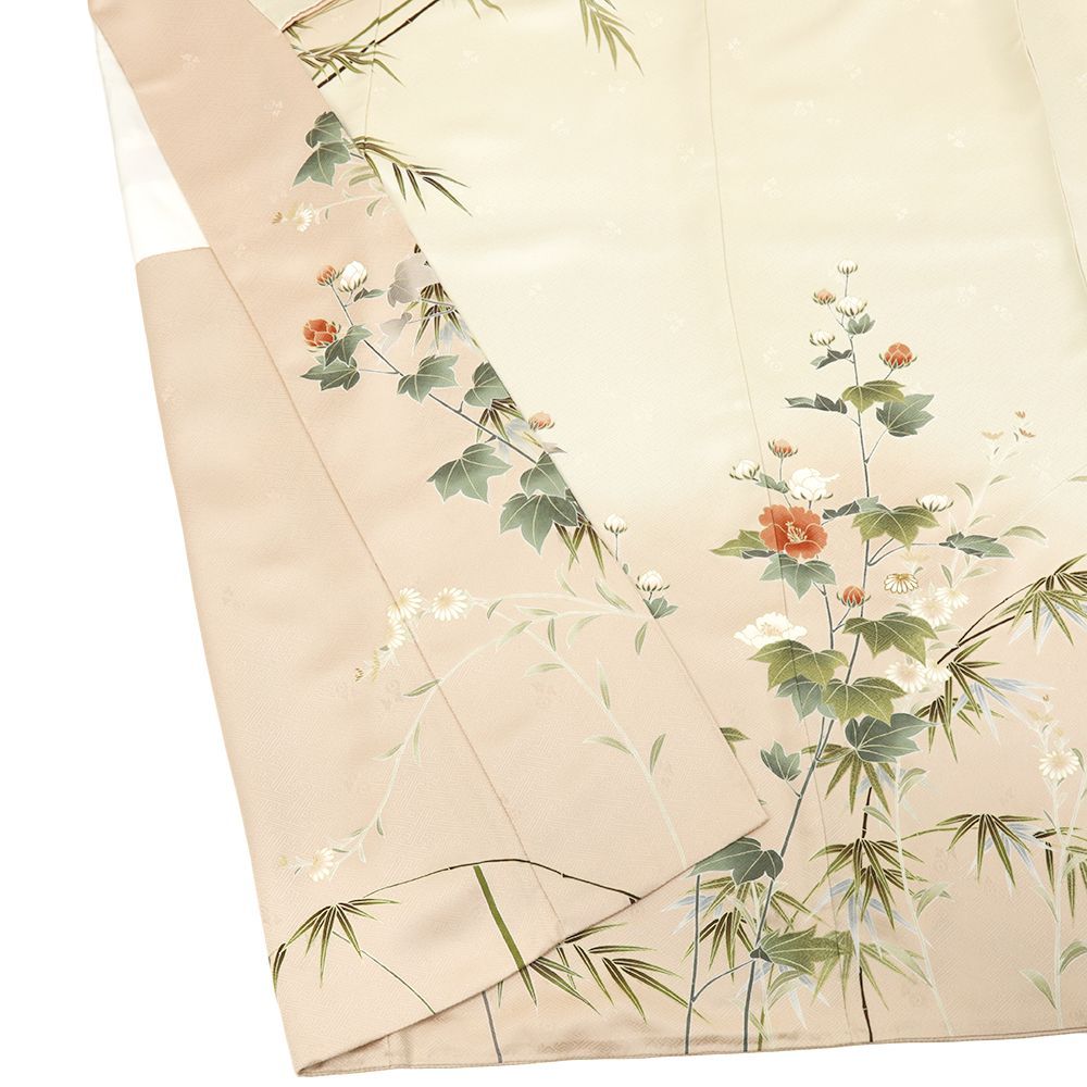 ピンクベージュと生成りの地に芙蓉や菊が上品に咲き誇りました。