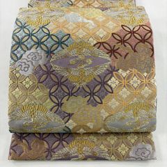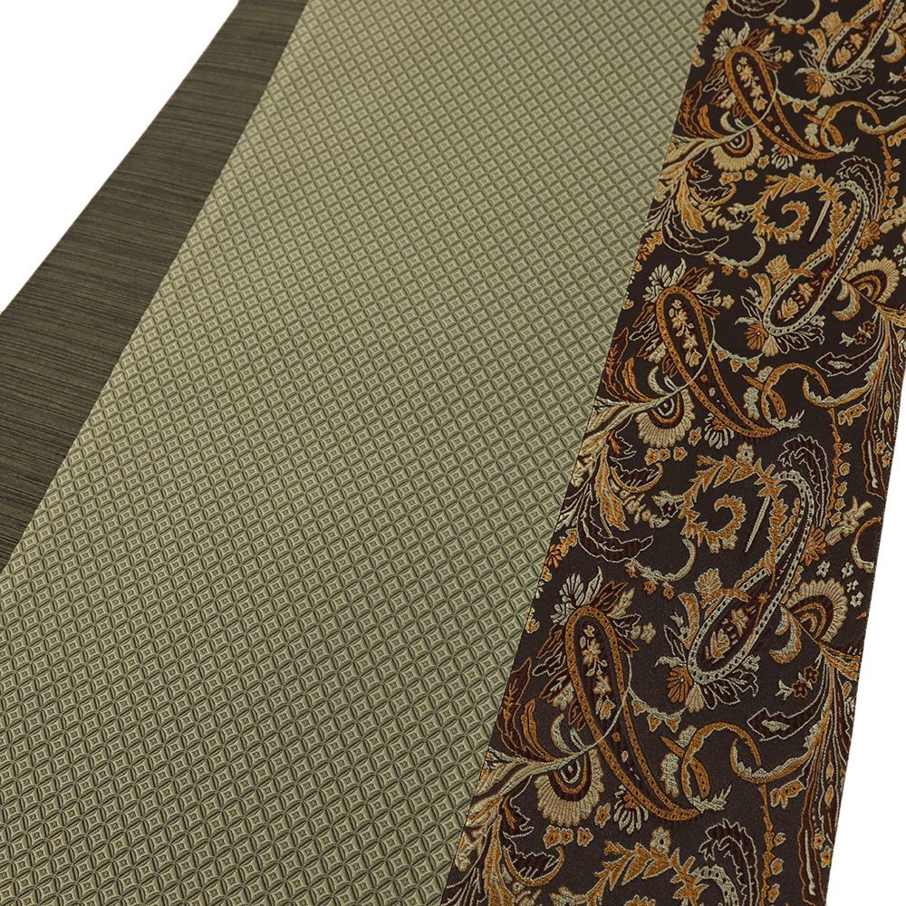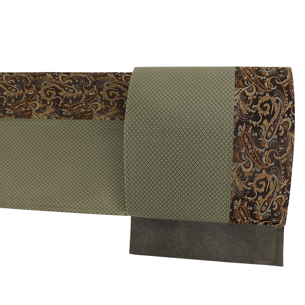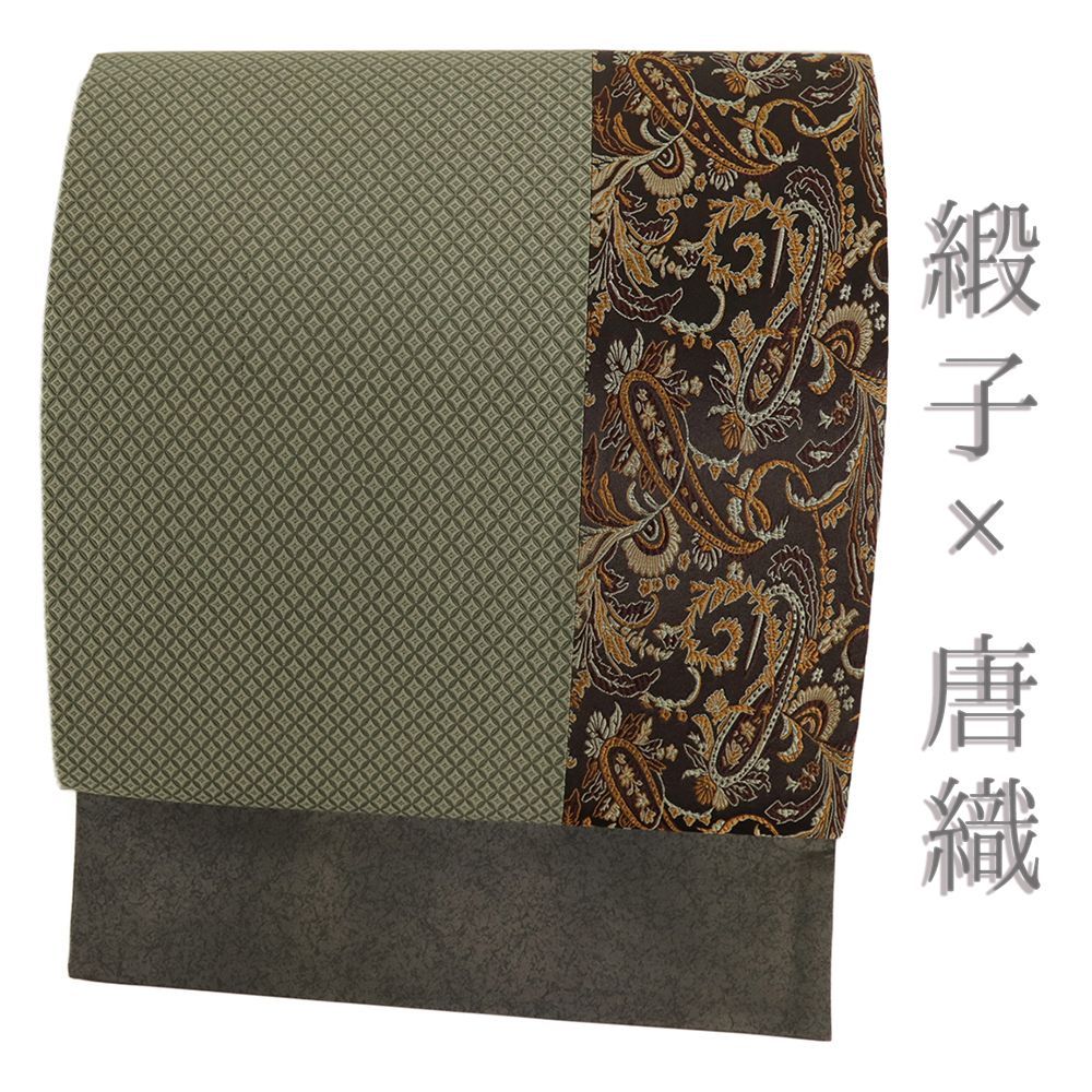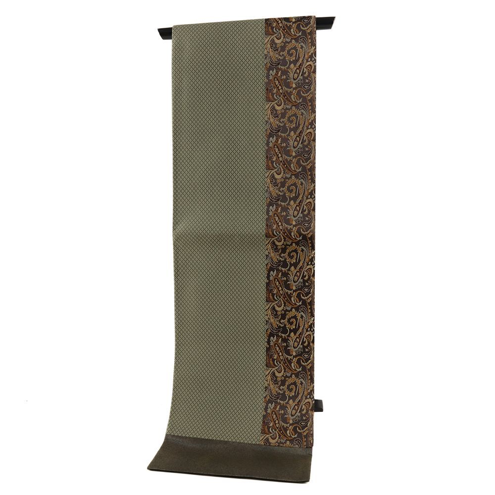 袋帯 正絹 緞子 茶 緑 ペイズリー 七宝 帯 カジュアル 着物 仕立て上がり No.i6-2511