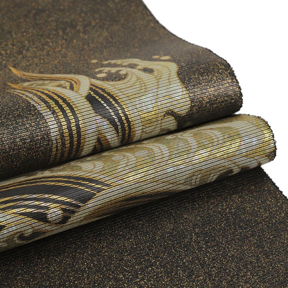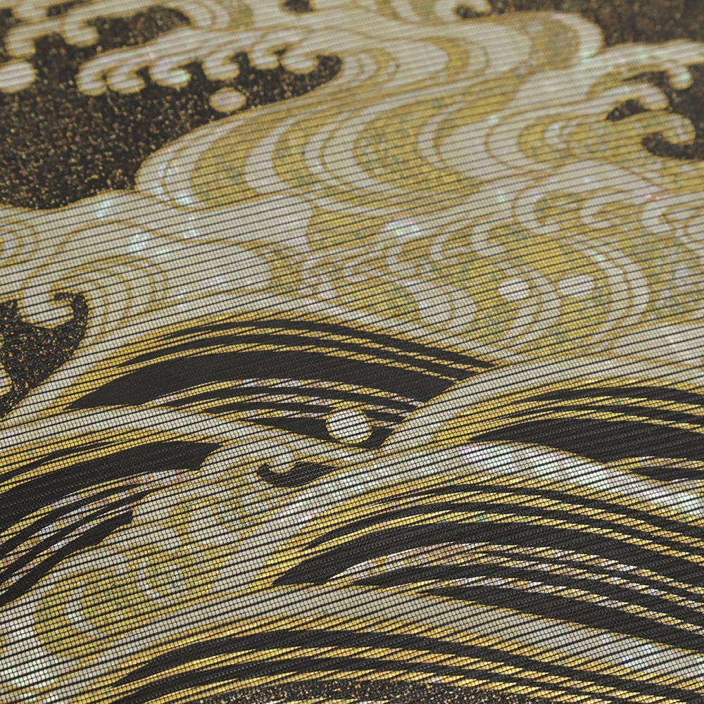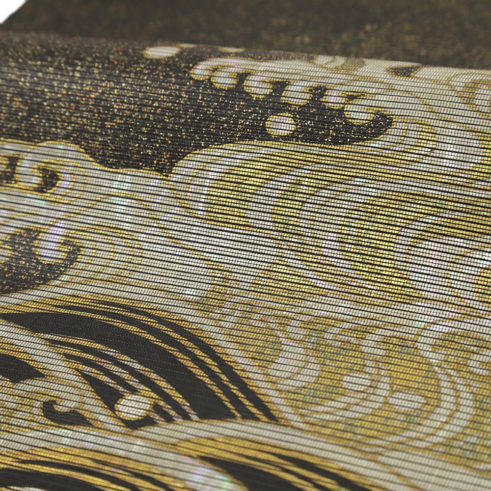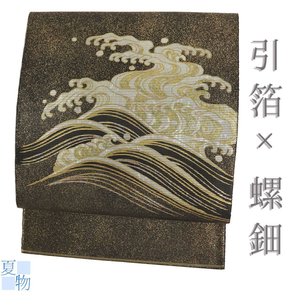 金通しの地に引箔、螺鈿のアクセントが美しく、凛としたたかな表情の夏帯です。