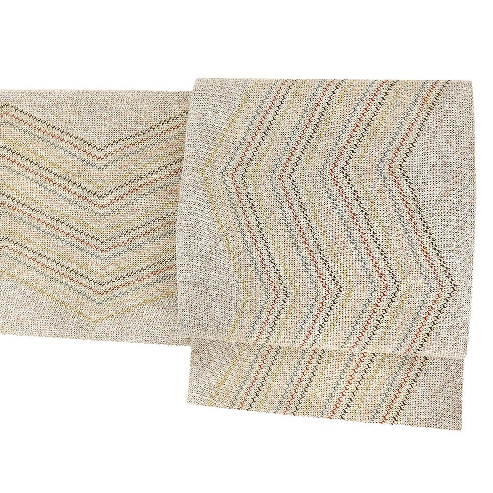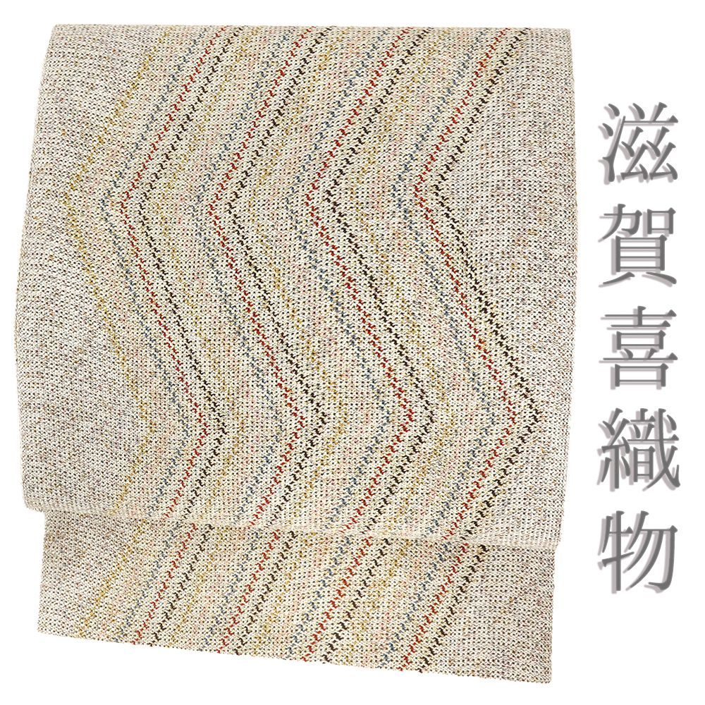 【 中古 】 名古屋帯 滋賀喜織物 正絹 新古品 白 生成 赤 幾何学 リサイクル カジュアル お洒落 仕立て上がり 八寸 No.i6-2529