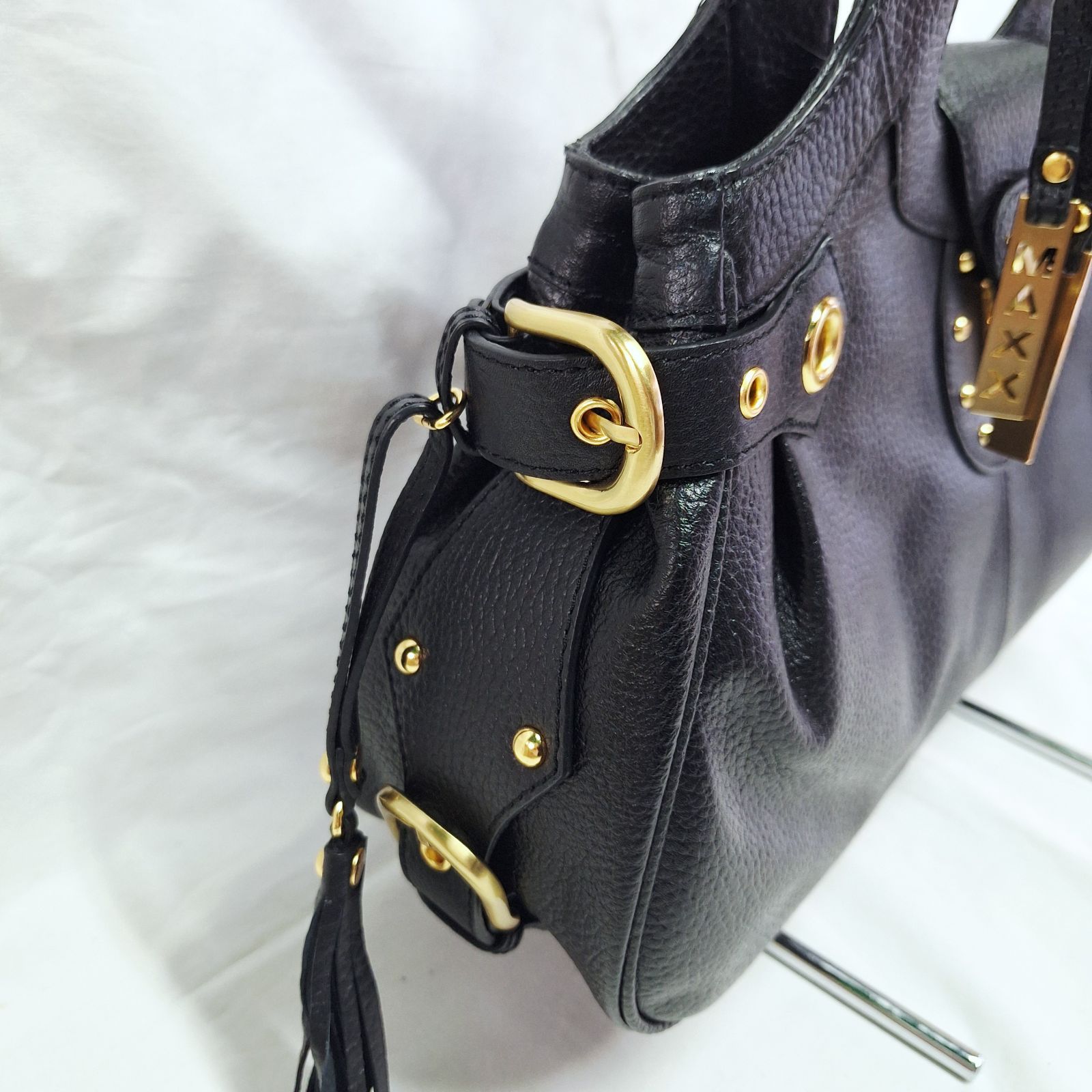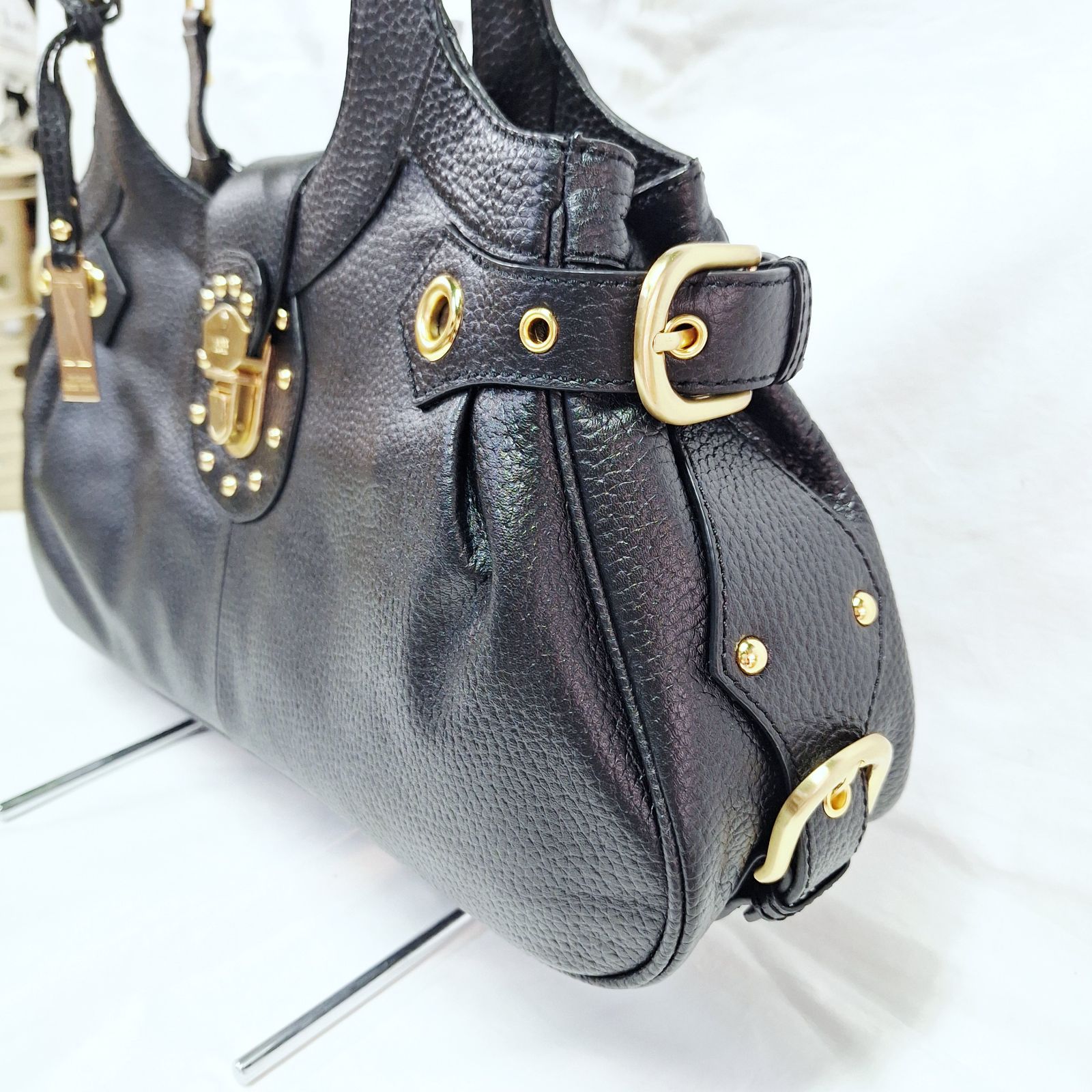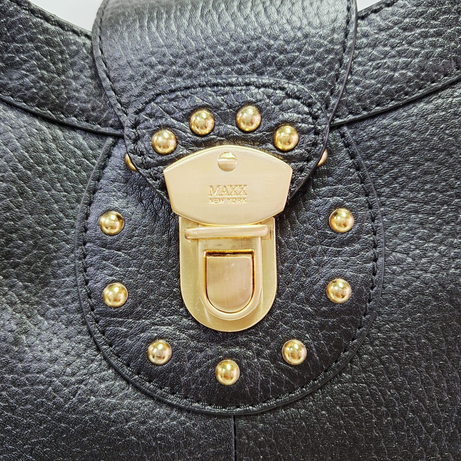 レザー調のハンドバッグです。中生地はペイズリー柄で見えない部分も拘って作られております。ゴールドのスタッズやプレートなので見た目強めなデザインですが丸みのあるフォルムが上品でとても高見えします。当店女性スタッフも欲しい!!と声を上げるほどとにかく現物がかわいいです。しっかりマチがありますし長財布も入るくらいの幅が十分にあります。持ち手27cmで窮屈感なく肩掛け可能。金具がジャラジャラ鳴りますが好きな方にはたまらない音です♡Y2Kファッションを好む方にもオススメです♪