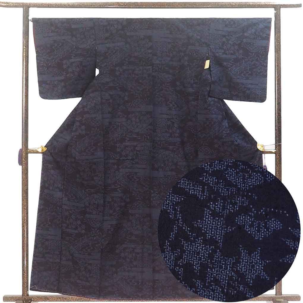 正絹の袷真綿紬着物です。結城紬の可能性が高いですが証紙がございませんので詳細不明です。濃紺地に霞や花柄でカジュアル用途にお召しいただけます。身長156cm-166cm程度、標準体型からややふくよかな方にお勧めサイズです。広衿仕立。裄の縫い代は5cm程度ありそうです。