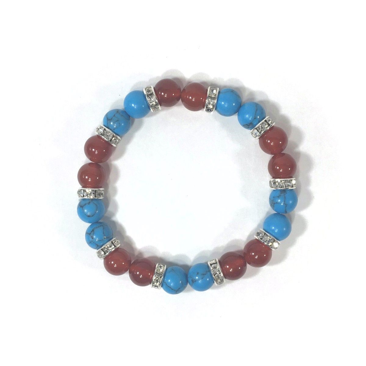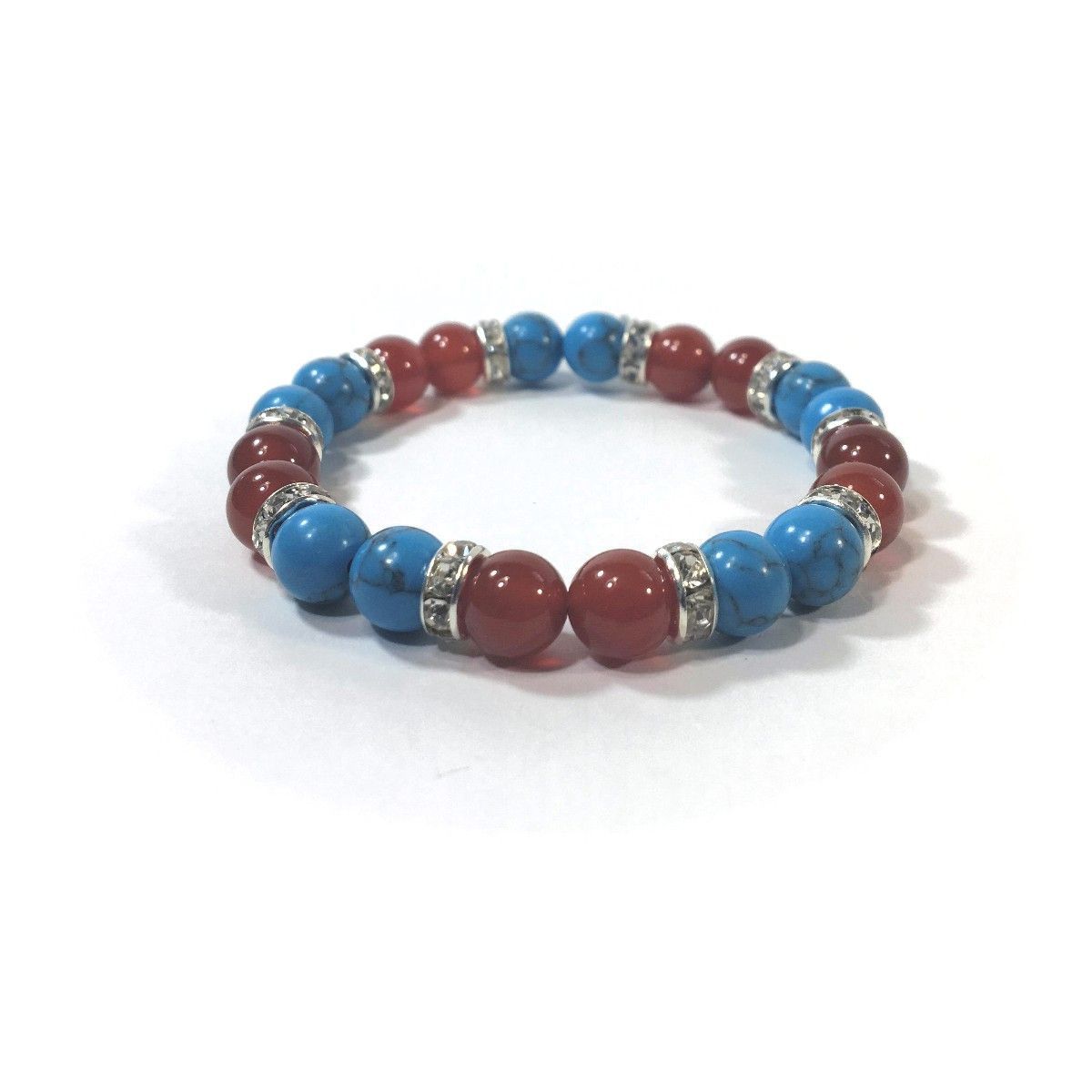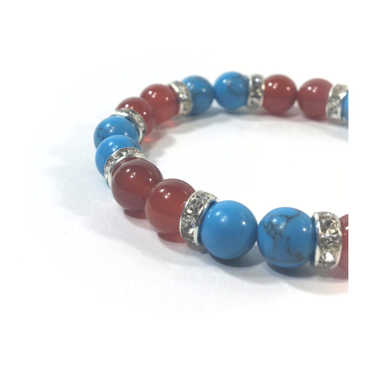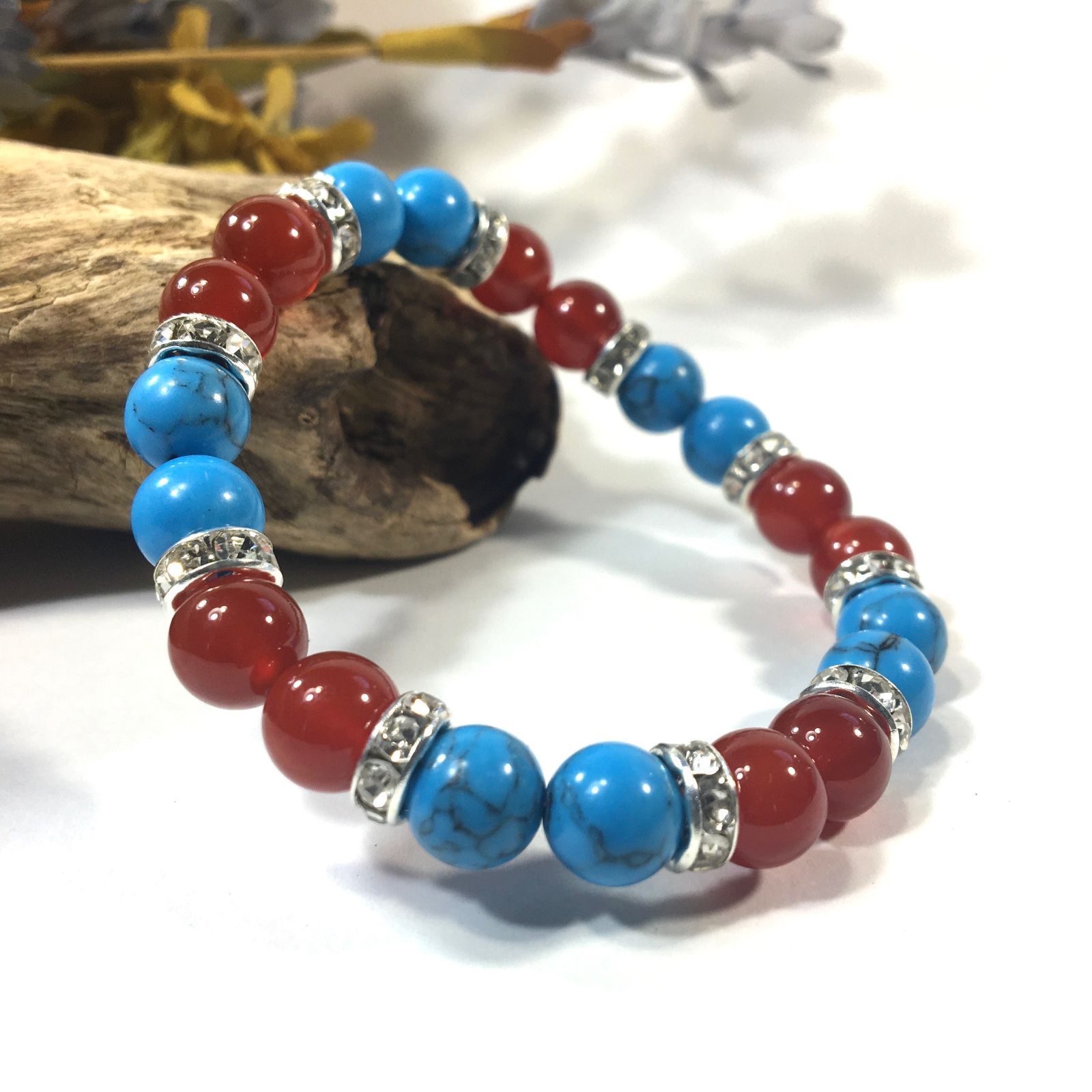 こちらは、8mm玉のターコイズと赤メノウを使ったパワーストーンブレスレットです。シンプルなデザインでどんなコーディネートにも合わせやすいデザインに仕上げています。サイズは内周約15cmです。気になる方は是非この機会にどうぞ。