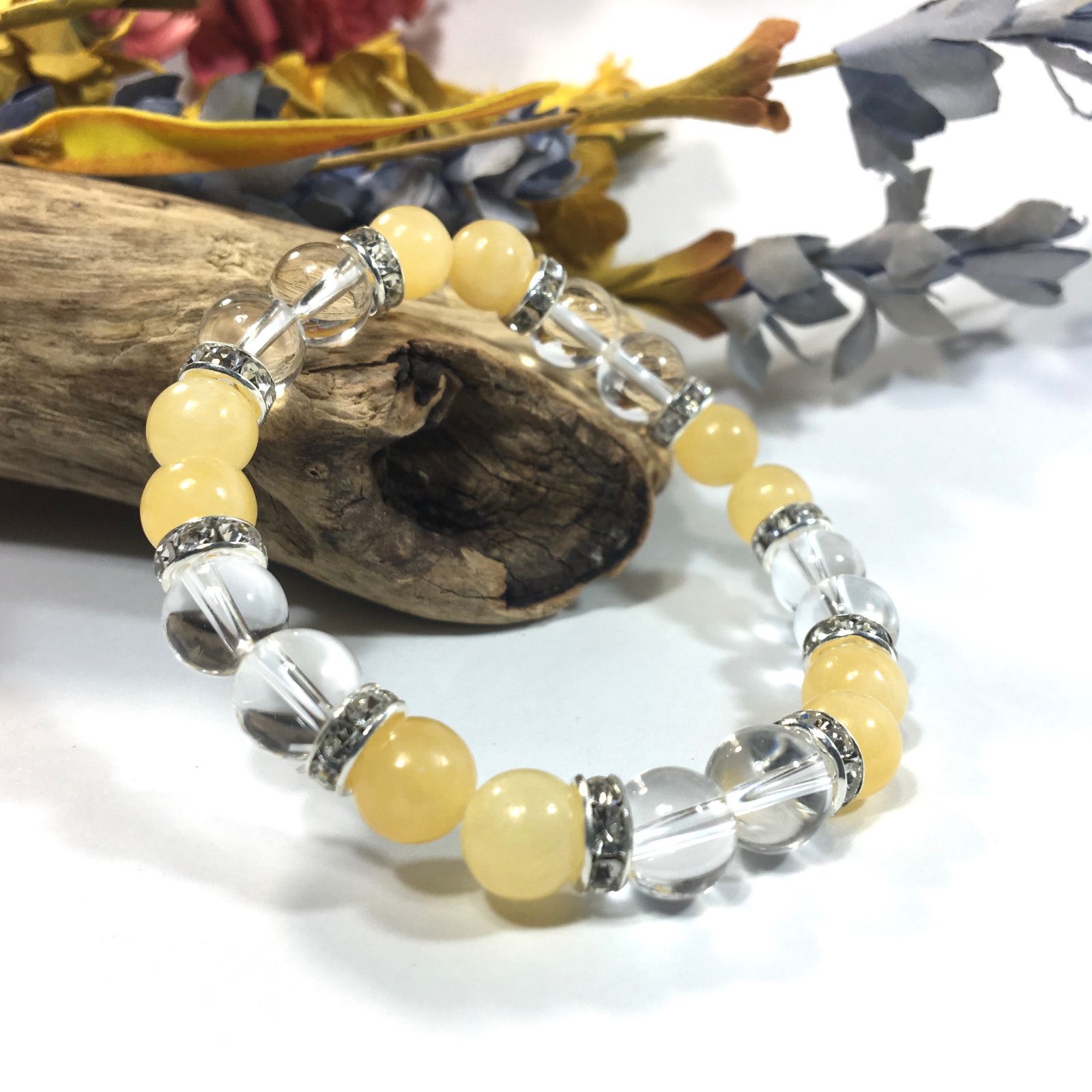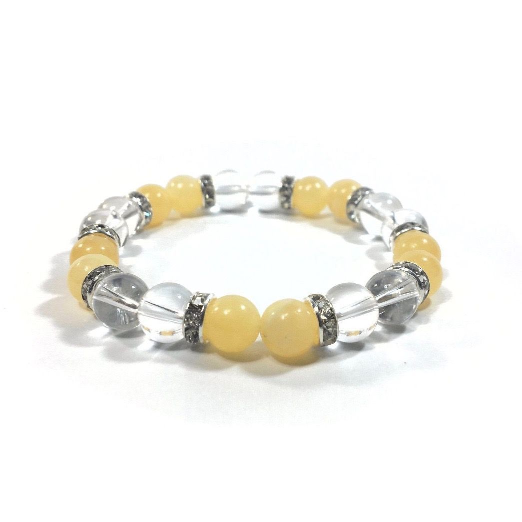 こちらは、8mm玉の水晶とアラゴナイトを使ったパワーストーンブレスレットです。シンプルなデザインでどんなコーディネートにも合わせやすいデザインに仕上げています。サイズは内周約15cmです。気になる方は是非この機会にどうぞ。