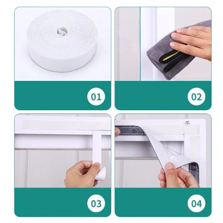 マジックテープの剥離紙をはがして窓枠に貼る。