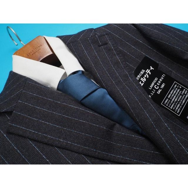水牛釦、本切羽、お台場仕立て、AMFステッチ、ラペル毛芯など、百貨店向けならではの上級仕立てで仕上げられております。ファブリックは1881年にイタリアのビエラで創業されたチェルッティ社のライトフランネル起毛ストレッチウール生地を使用しています。