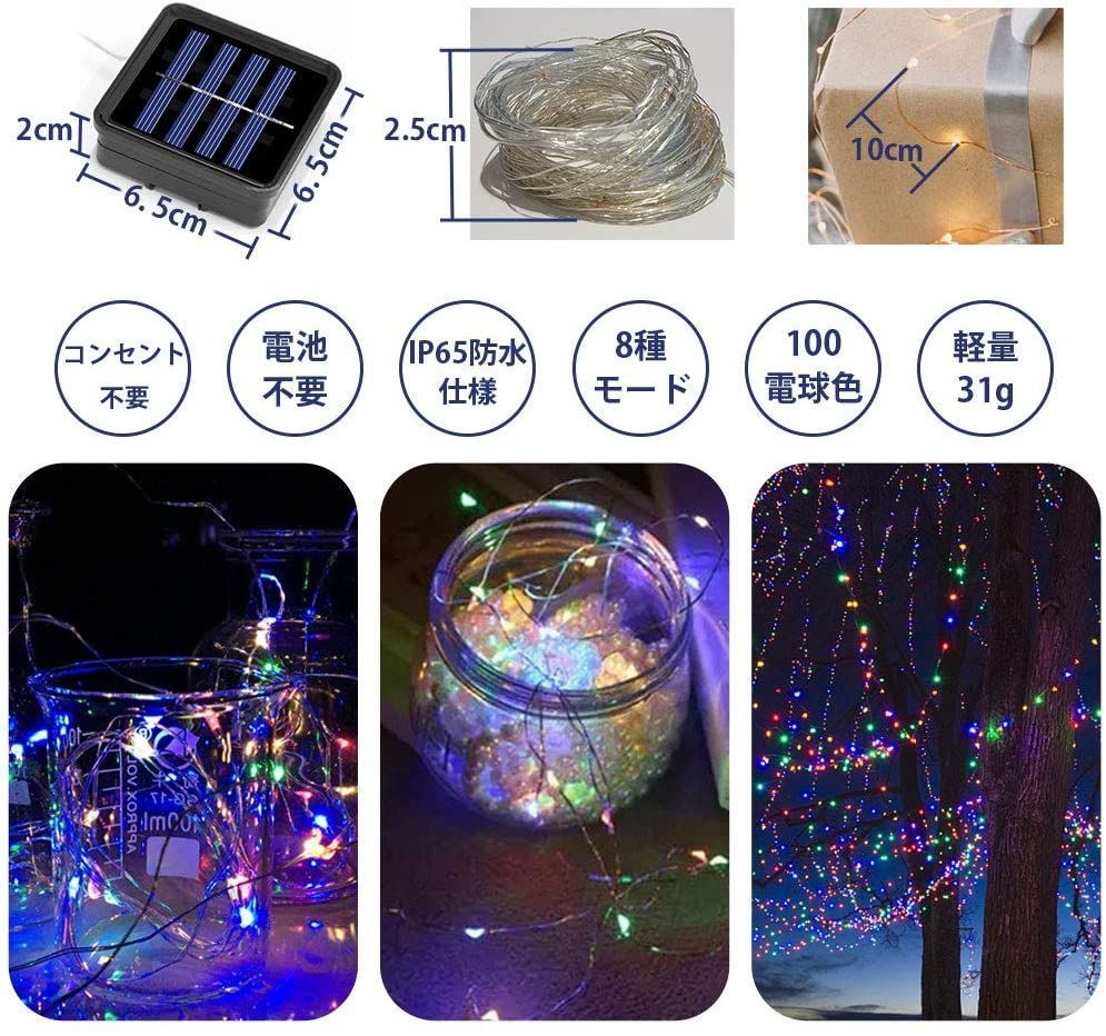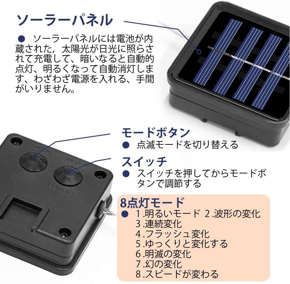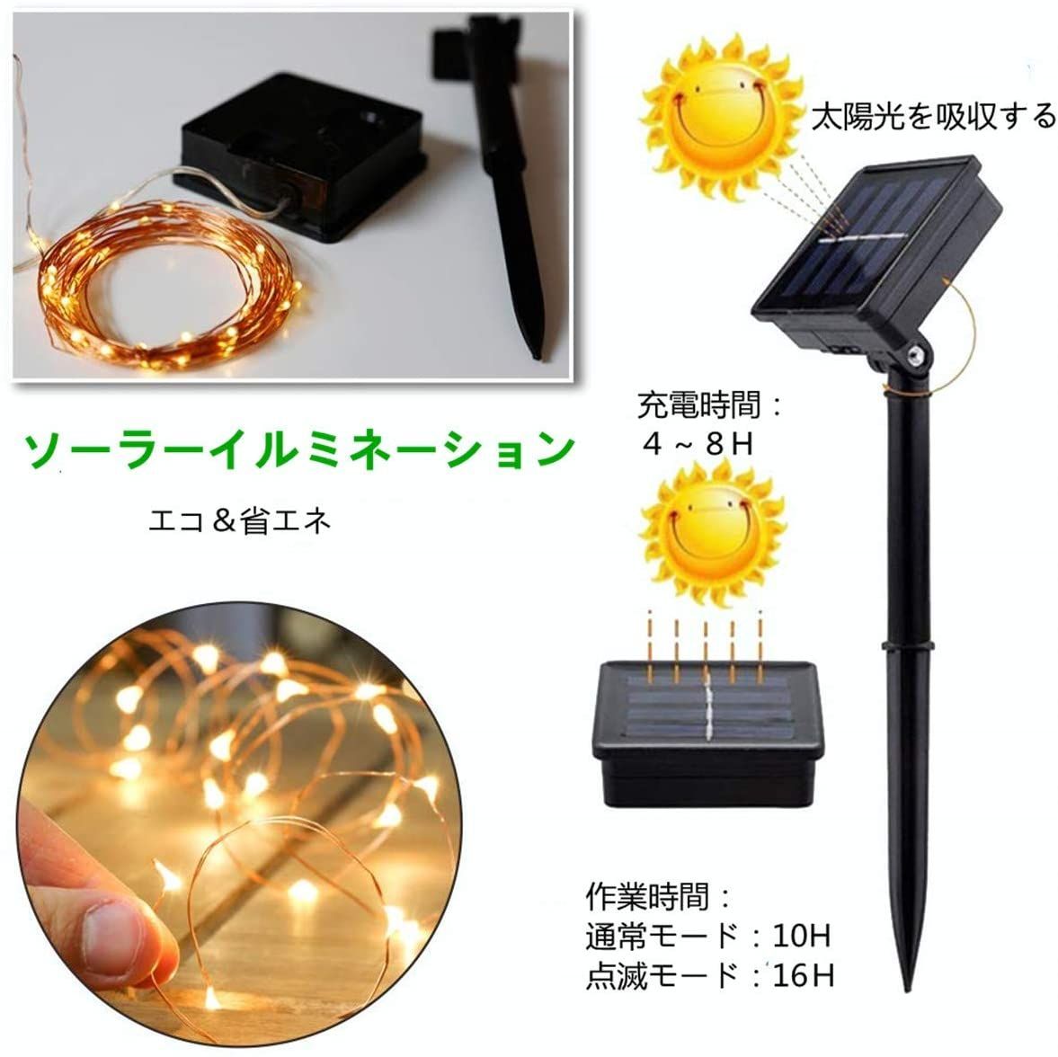 満充電状態で最大8時間光り続けます、配線が不要、電池不要省エネルギー、環境にも優しいのledイルミネーションライトです。