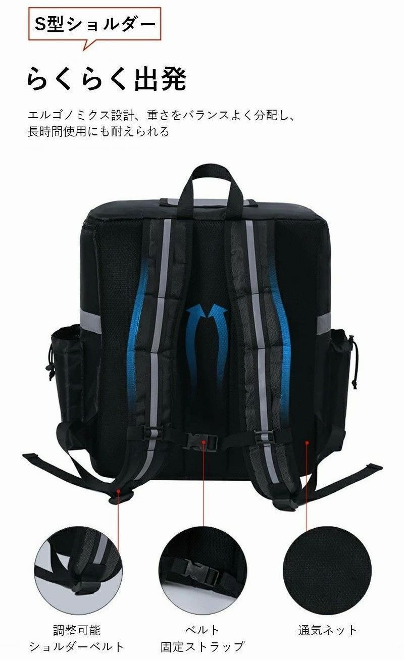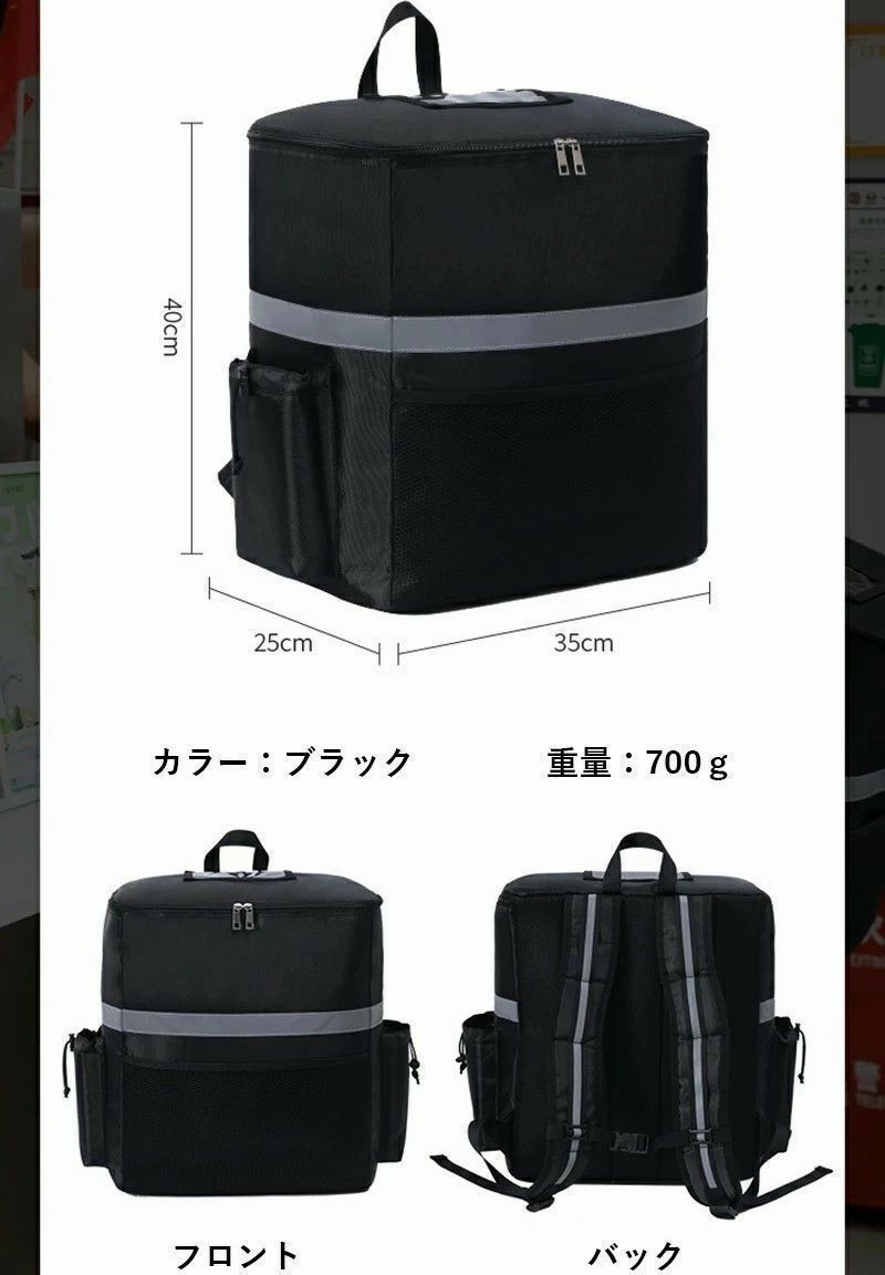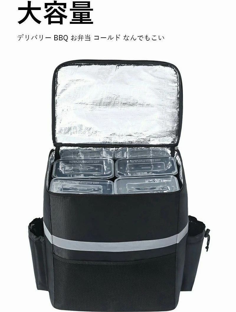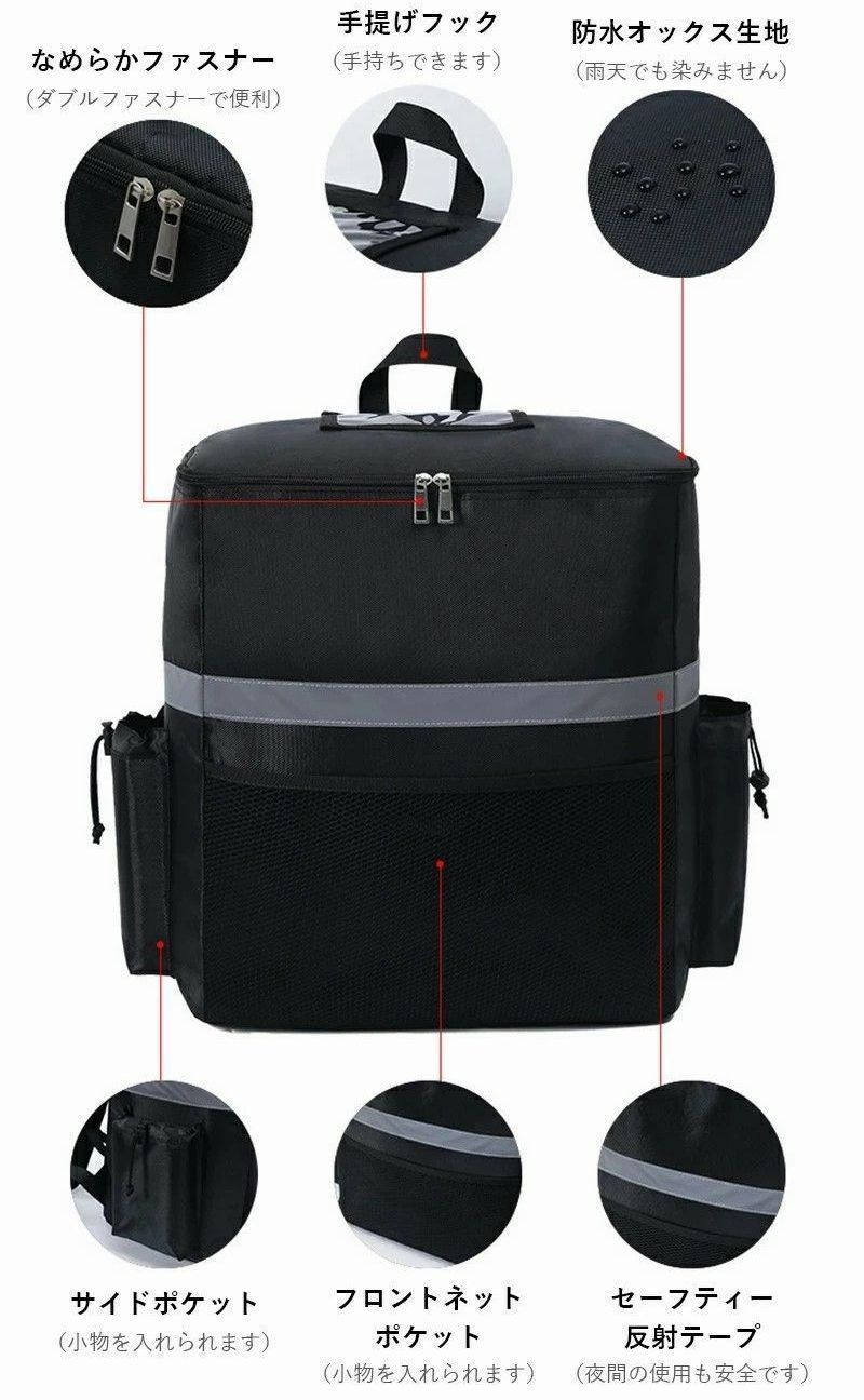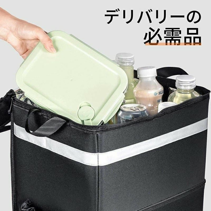 上面がファスナーで開く仕様、食べ物の出し入れが便利です。使用後は折りたためます、省スペース。パックの前面と側面の反射ストリップにより、暗闇でライト等の光を反射し、事故防止などの安全対策に使用できます 。夜、雨天、霧の日などでも安心して食べ物を配送できます。