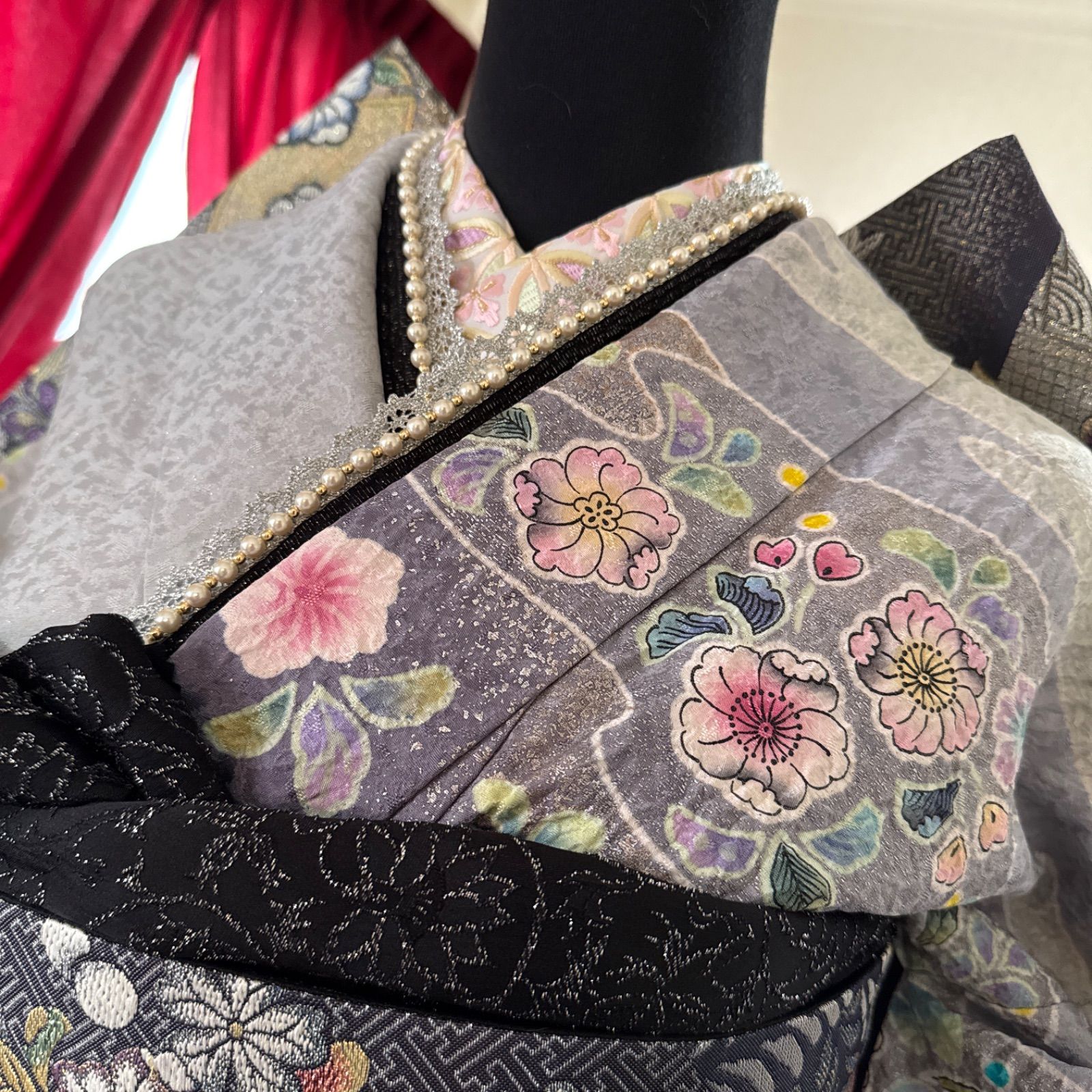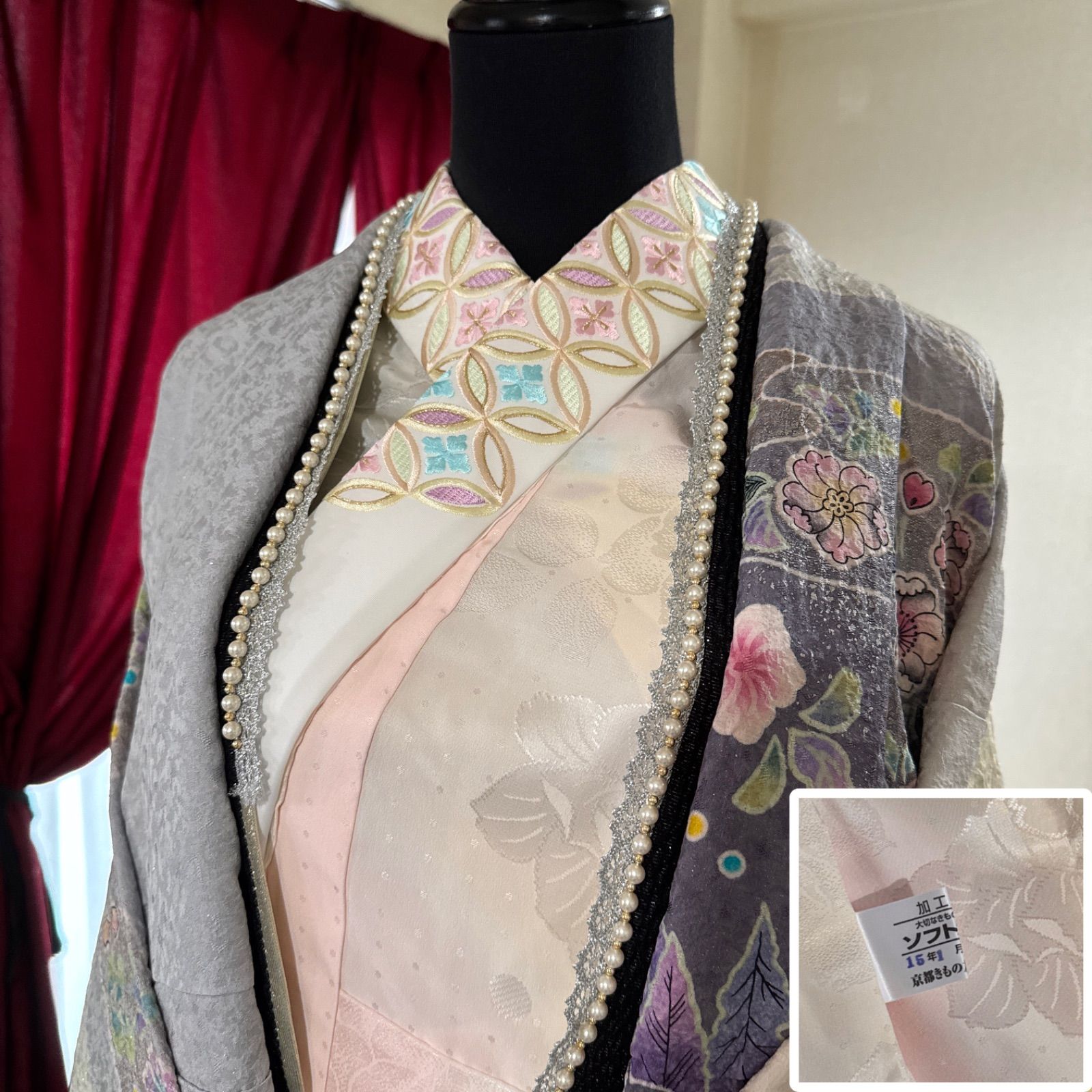 長襦袢も肌触りの良い高級な正絹(京都きもの友禅扱い・共誂・新品刺繍半衿縫い付け済み)をご用意。