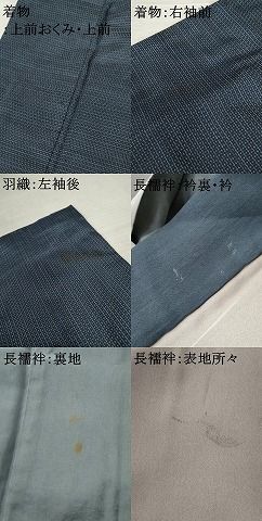 着物の状態は接写画像のように上前おくみ・上前・右袖前に薄い汚れがございます。