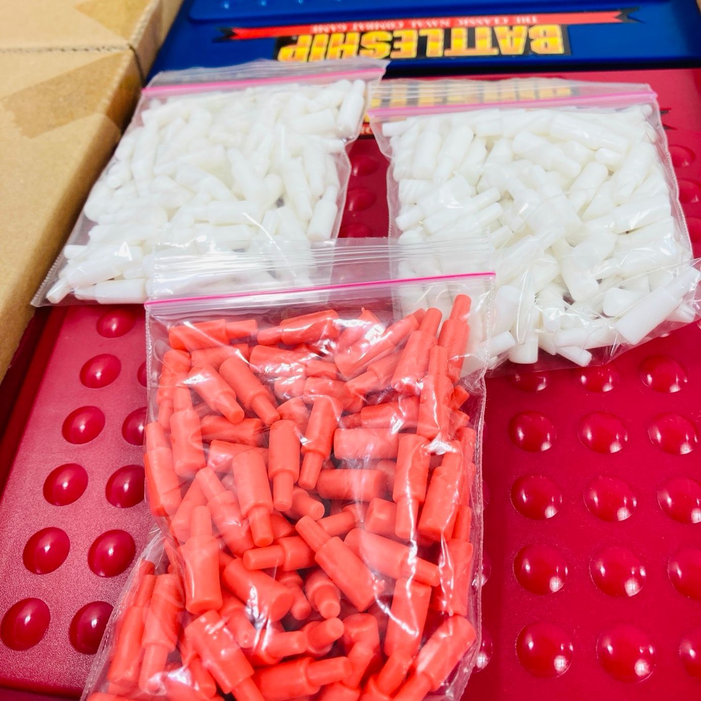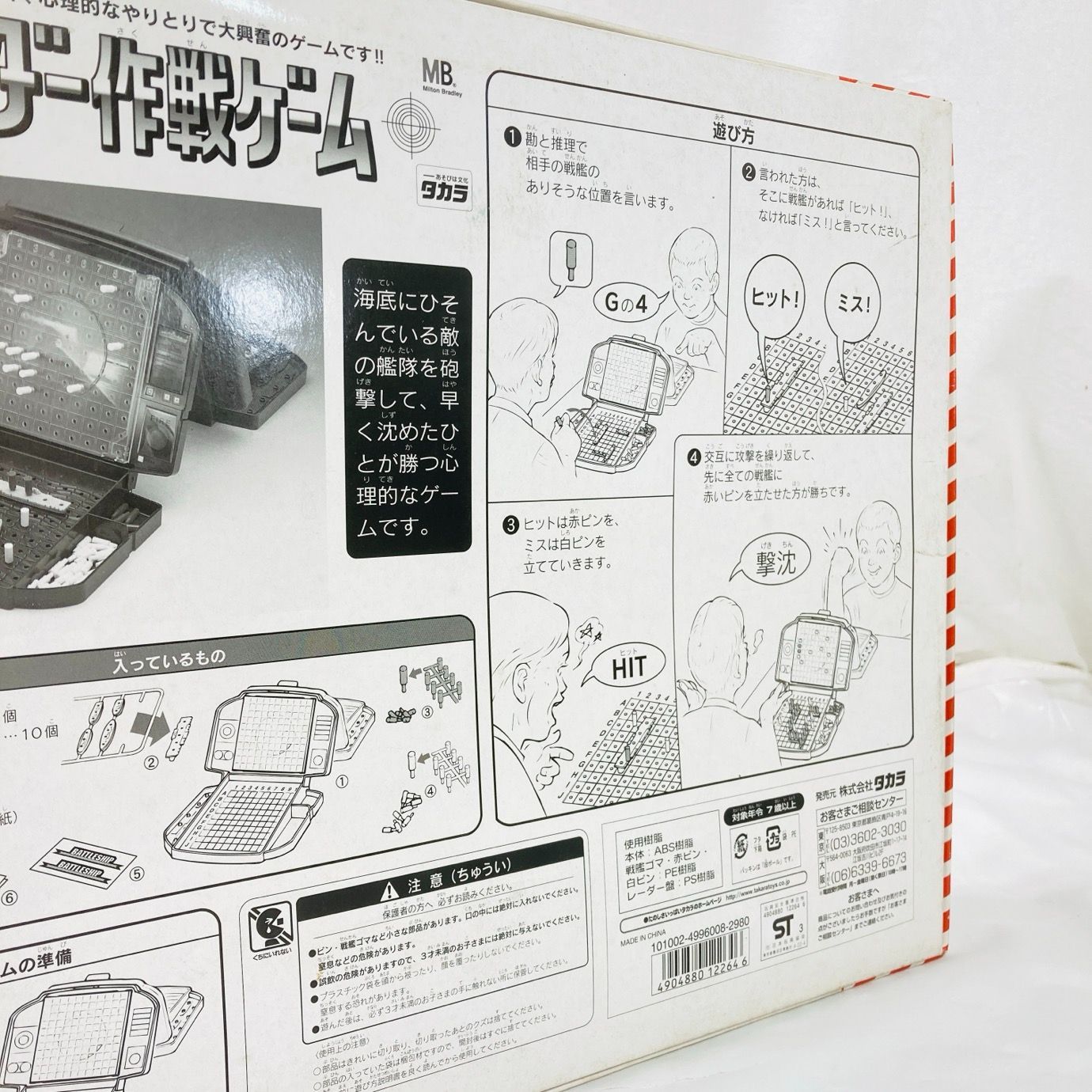 戦艦があれば「ヒット」を宣言しその位置に赤ピンを、なければ「ミス」を宣言しその位置に白ピンを立てていきます。