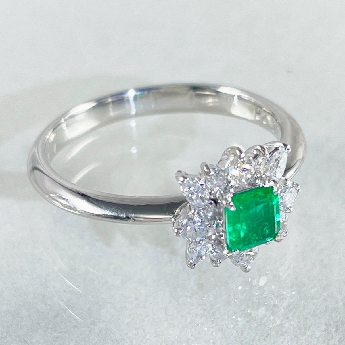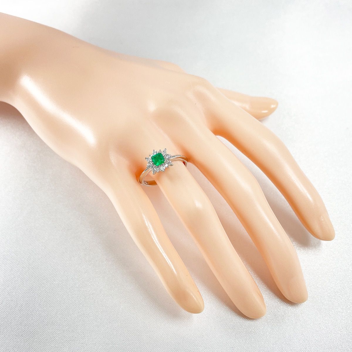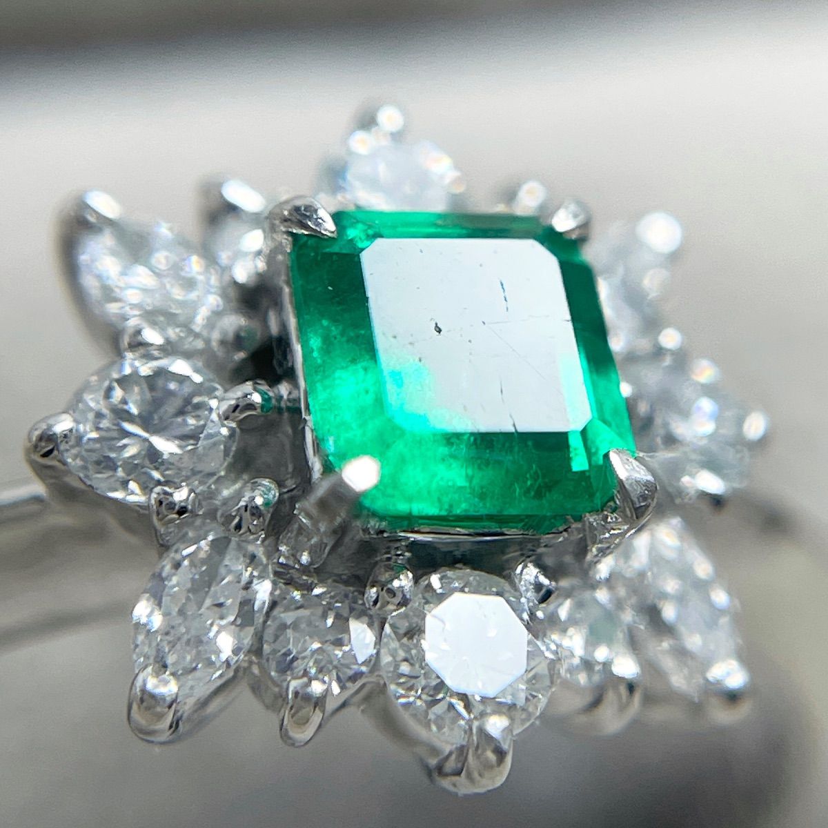 鮮やかなグリーンが目を惹くエメラルドを主役に、まわりをダイヤモンドで華やかに取り巻いたリング。