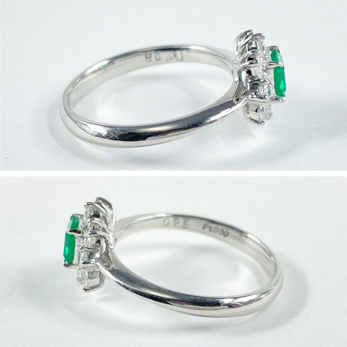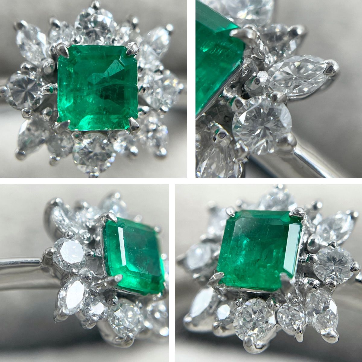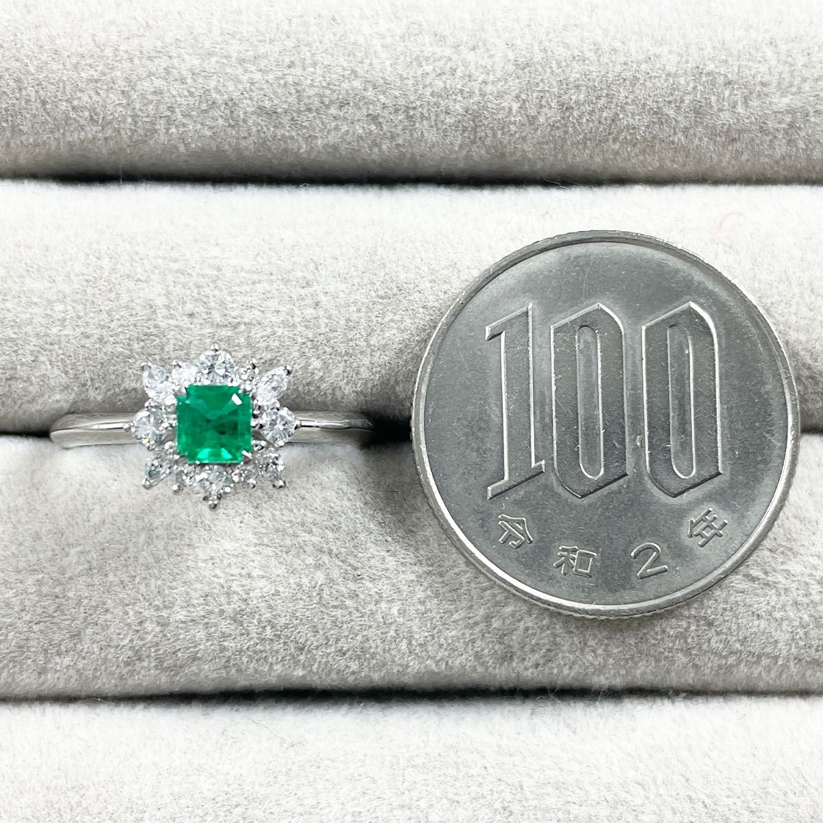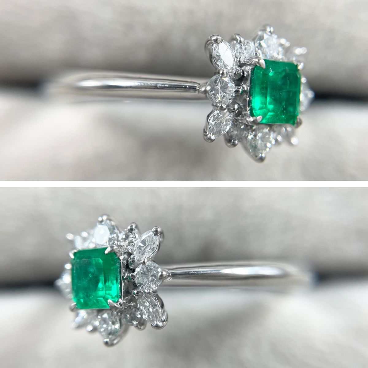 鮮やかなグリーンが目を惹くエメラルドを主役に、まわりをダイヤモンドで華やかに取り巻いたリング。