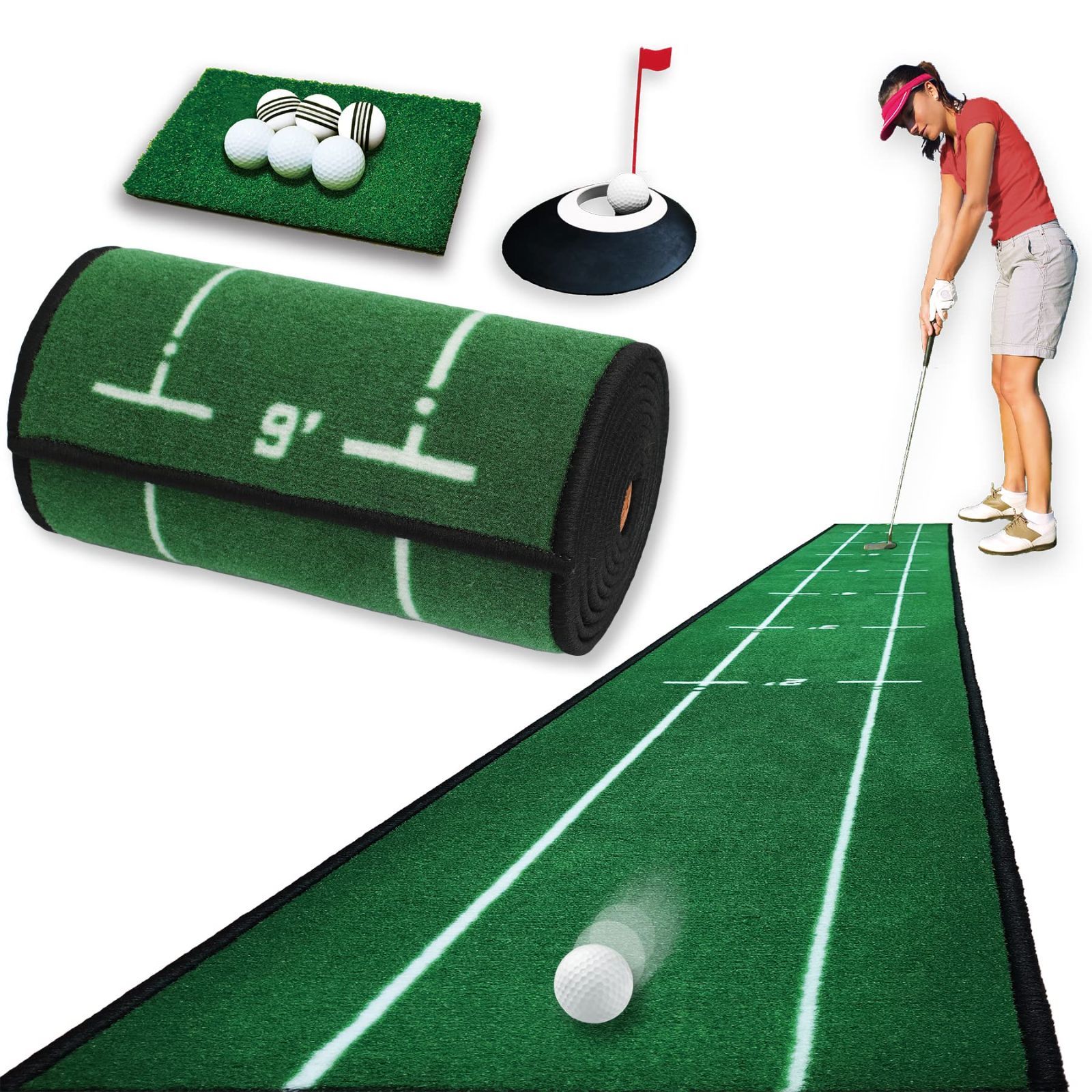 【セット内容】パターマット本体 / 上達パターカップ / ゴルフボール3個 / ショットマット / 練習用ボール 3個 計9点セット 【仕様】 パターマット: 30*280cm / パターカップ:外径 18*20cm 内径 10.8cm&7.6cm(2段階)/ ゴルフボール: 直径42.7mm 2ピース/ ショットマット: 20*30*2cm SBR製 / ゴルフ練習ボール: 直径42mm EVA製