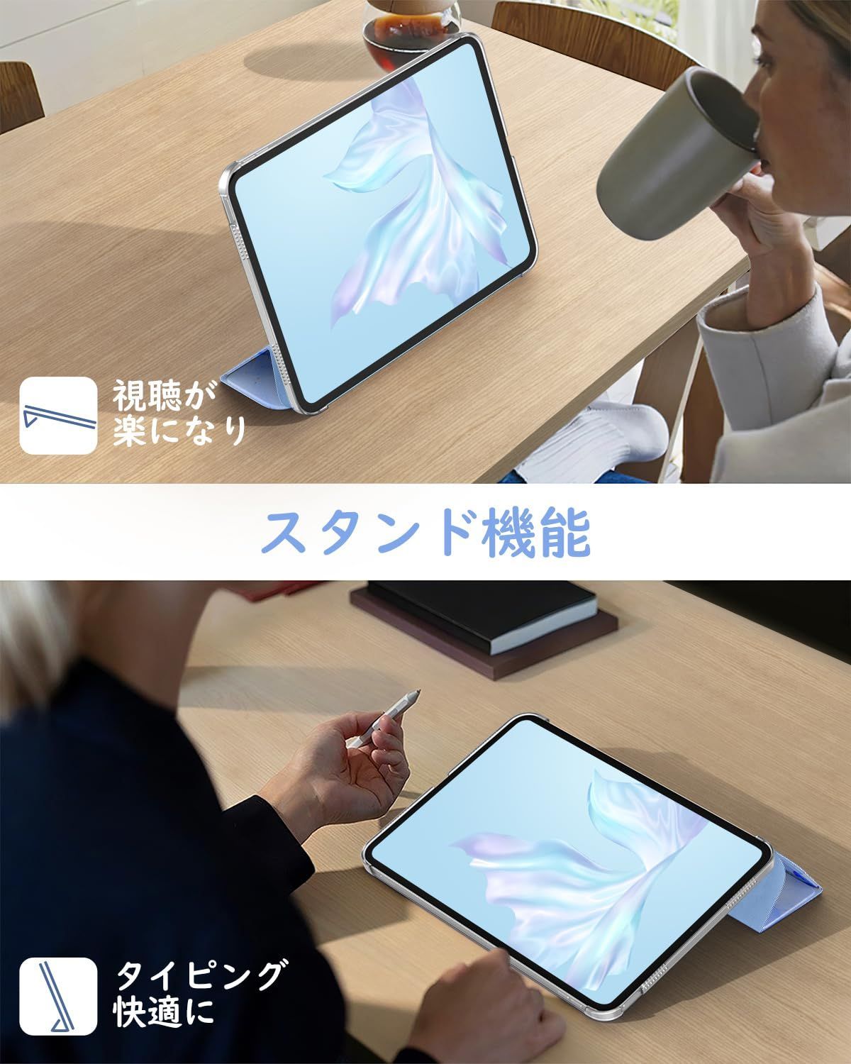 「前蓋PUレザー+背面半透明PC」 ケースの蓋は耐久性に優れた高級PUレザーで仕上げられて、インナーの素材は柔軟なマイクロファイバー製で、端末が摩擦により発生する擦り傷を和らげます。iPadをしっかりと保護できます。背面ケースはフロントカバーと同じ色合いの半透明PC製で薄型一体式手帳型全保護仕様となっており、優しい手触り感じがして、取付やすくなっています。