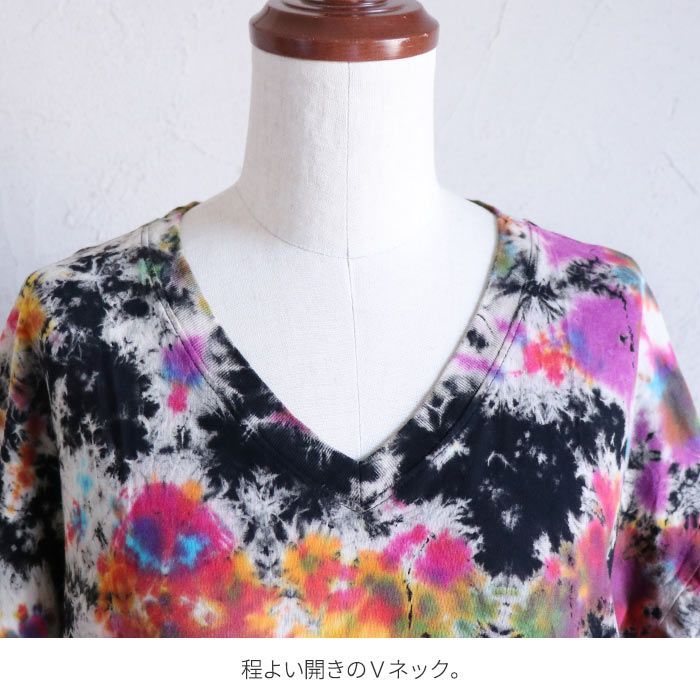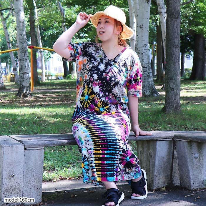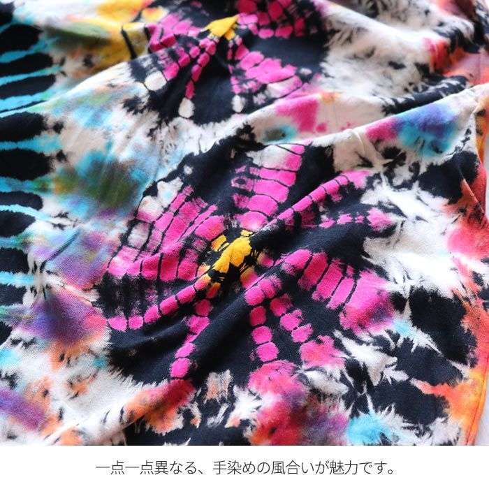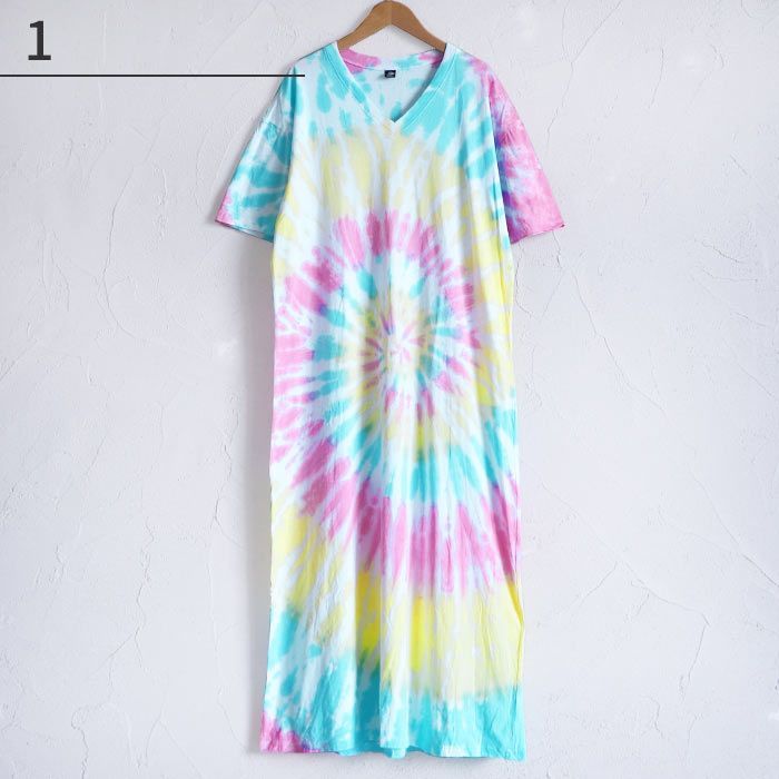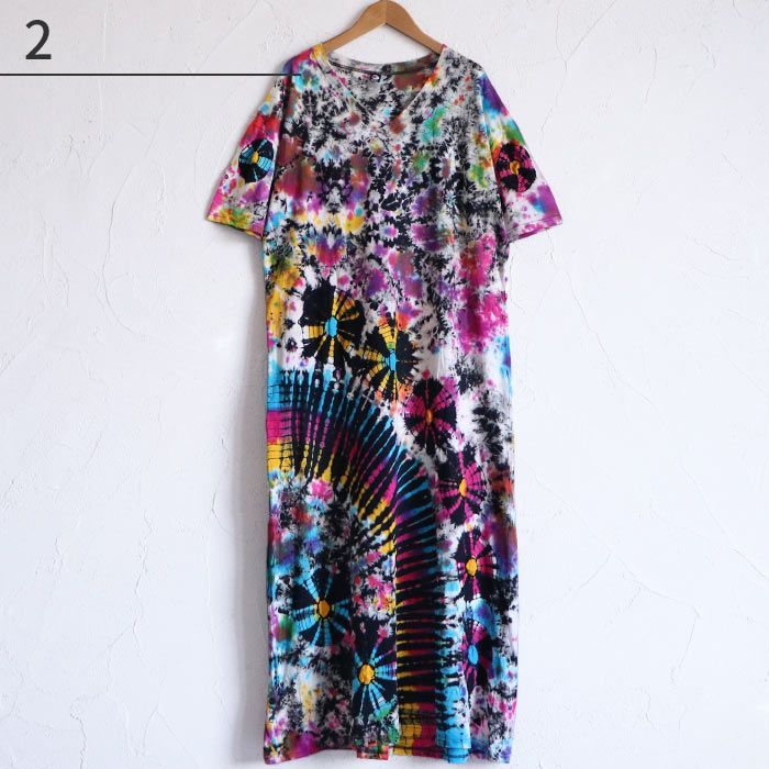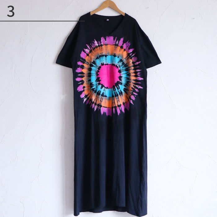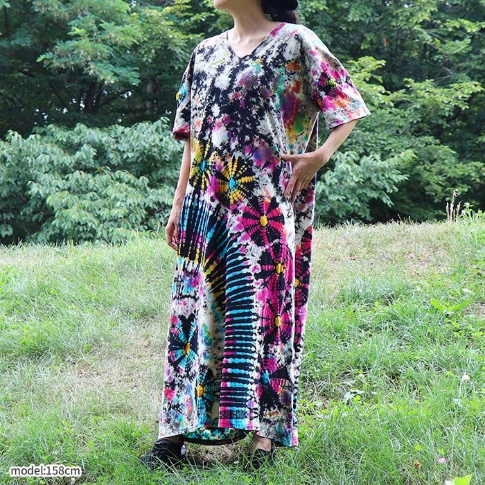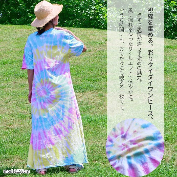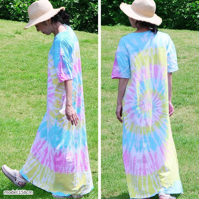 当店オリジナルのタイダイ染めロングワンピースが登場!絞り染め特有の鮮やかなグラデーションが目を引く、個性派ワンピース。一点ずつ表情が異なる手染めの風合いが魅力。風に揺れるゆったりとしたシルエットが涼やかさを演出し、おうち時間にもおでかけにも映えるアイテムです。綿100%の柔らかなTシャツ生地を使用し、着心地も抜群。Vネックが首元をすっきり見せてくれるのも嬉しいポイント。気軽にアジアンコーデを取り入れられて、ちょっぴり特別な気分になれる、そんなエスニックな魅力を詰め込んだ一枚です。