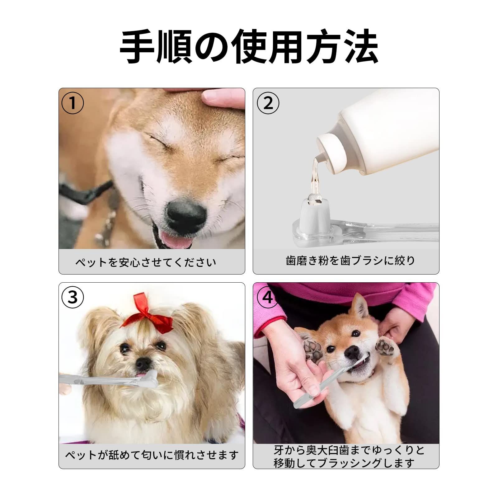 【犬用歯ブラシの使い方】 歯ブラシを使用する前に、ペットを安心させてください。ペットの口を触られることに慣れさせ、歯磨き粉を歯ブラシに絞り、ペットが舐めて匂いに慣れさせます。その後、牙から奥大臼歯までゆっくりと移動してブラッシングします。