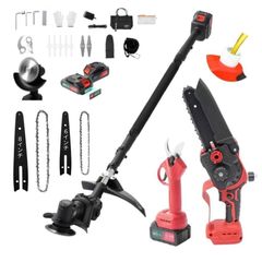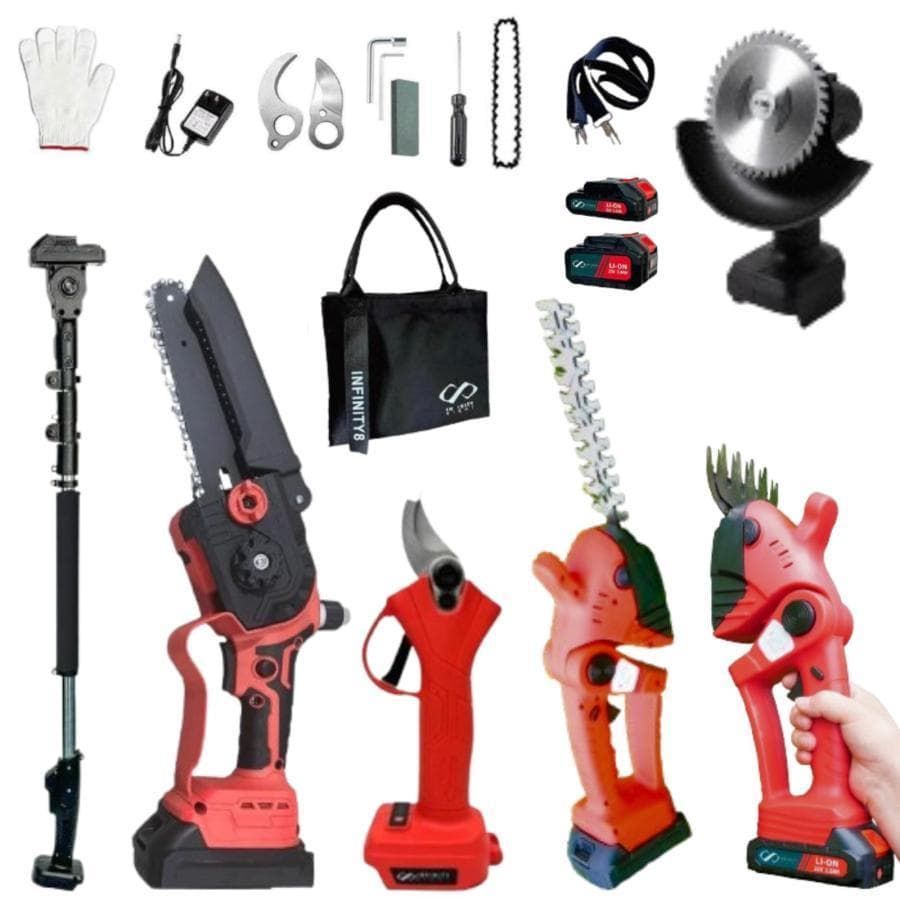 【6インチチェーンソー+ハサミ+草刈り機+バリカン+ヘッジトリマー+延長ポールのフルセット!】