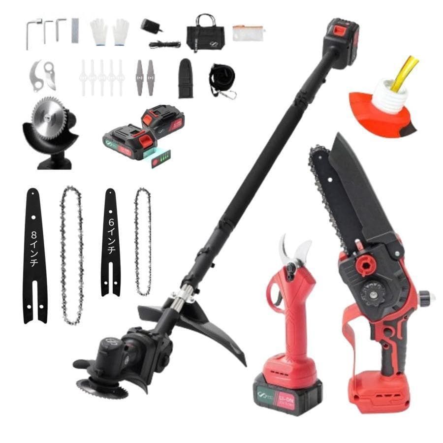 8インチチェーンソー+剪定バサミ+草刈り機+延長ポールのセット。