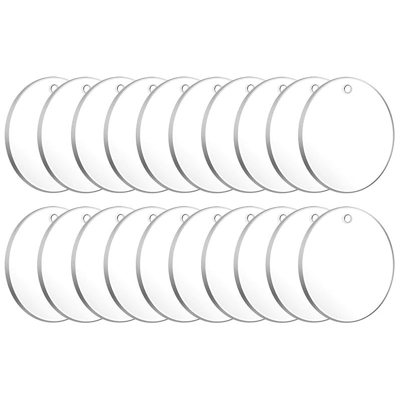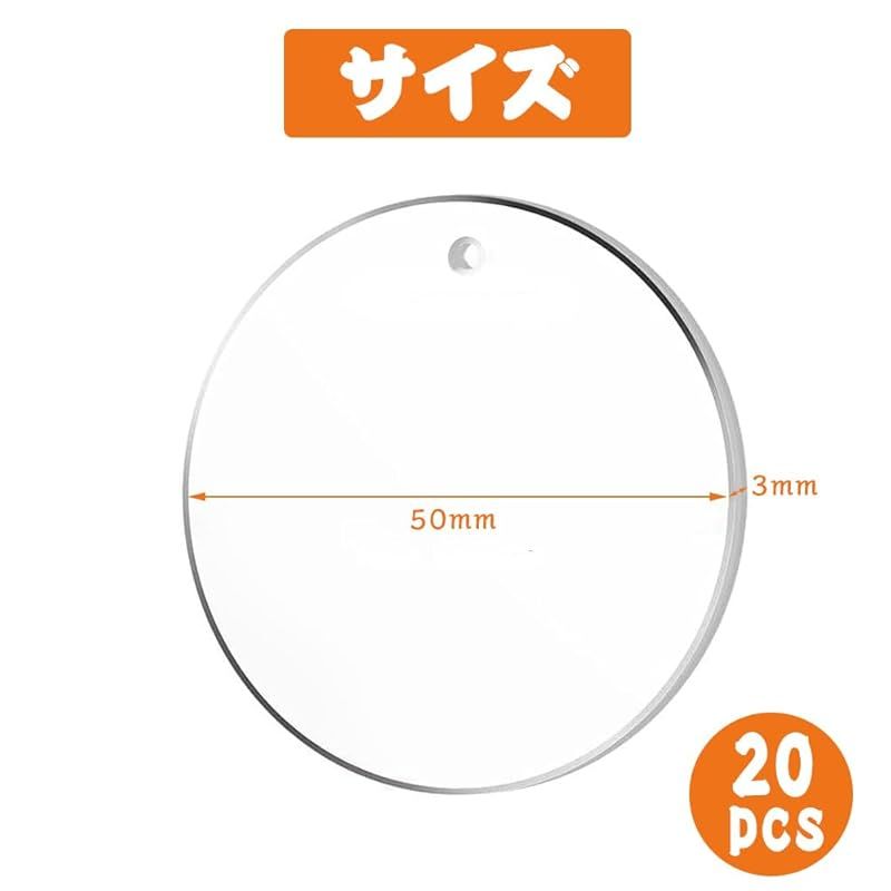 【商品仕様】丸型アクリル板20枚入り。サイズ:直径約50mm、厚さ3mm。