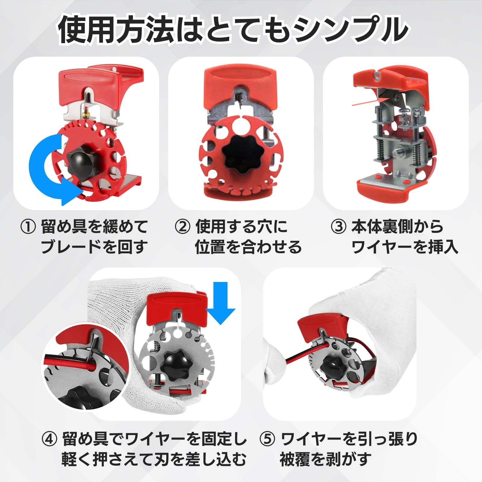 電線皮むき機の使用方法はシンプルで、ワイヤーを正しい穴に入れ、カッターを調整して作業を開始します。回転ブレードにより、水平方向と垂直方向の両方で迅速かつ正確にストリッピングが可能です。刃を直接手で触れることなく、事前にセットするだけで簡単にワイヤーの被覆を剥がせます。