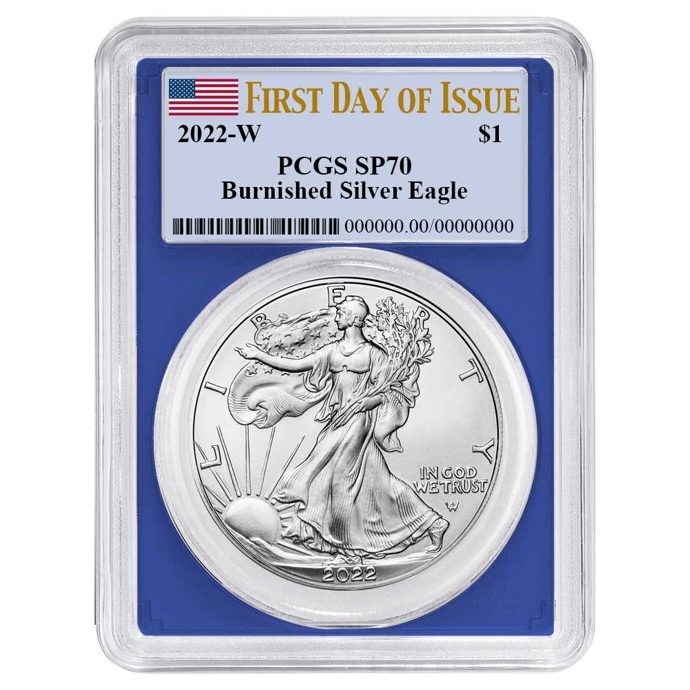 2022-W Burnished $1 American Silver Eagle PCGS SP70 FDOI Flag Label Blue Frame