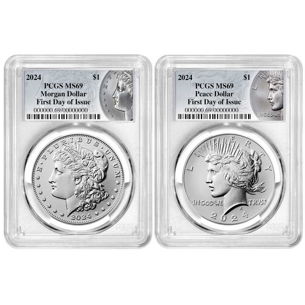 2024 $1 Morgan and Peace Silver Dollar 2pc Set PCGS MS69 FDOI Morgan
