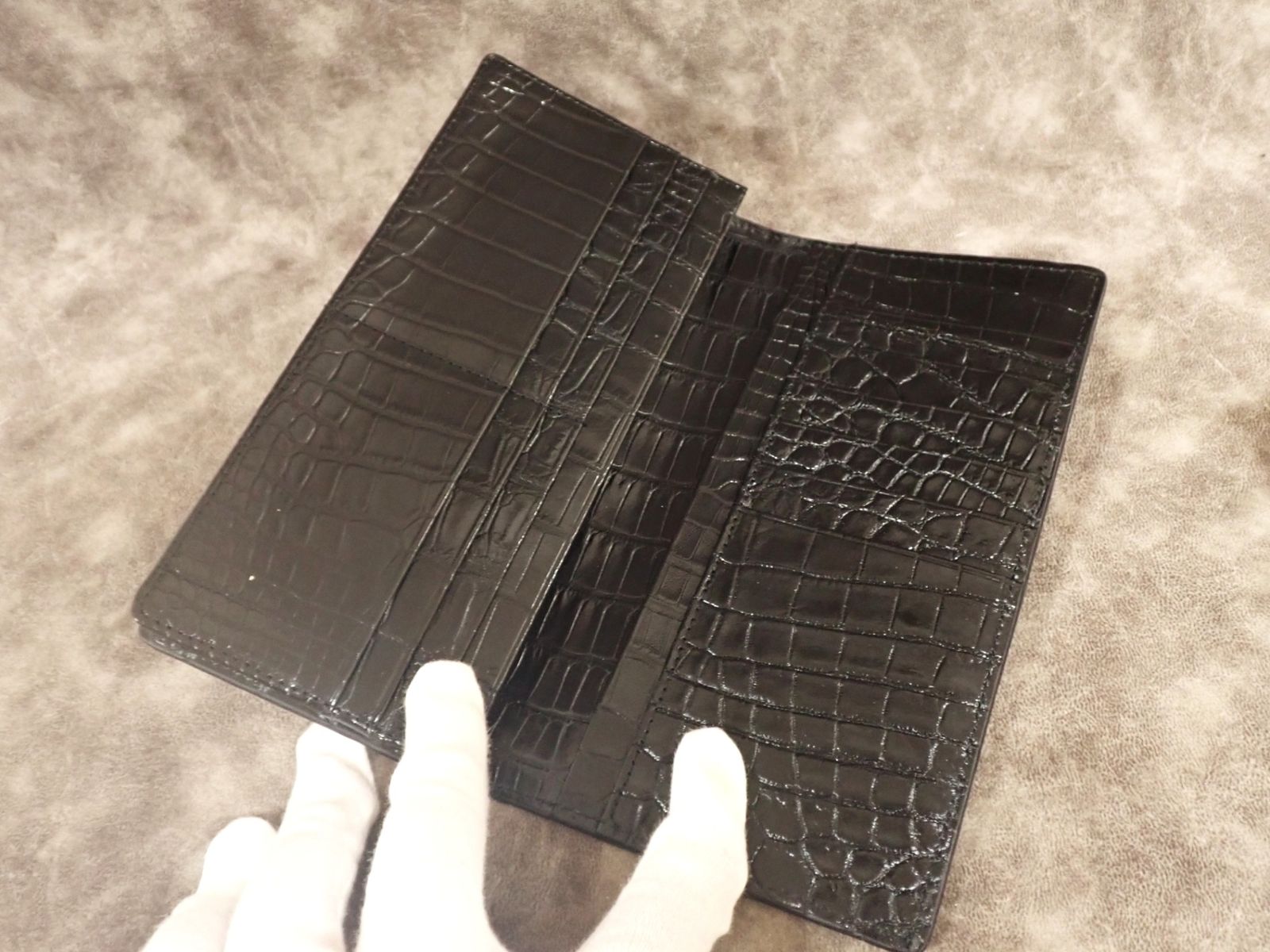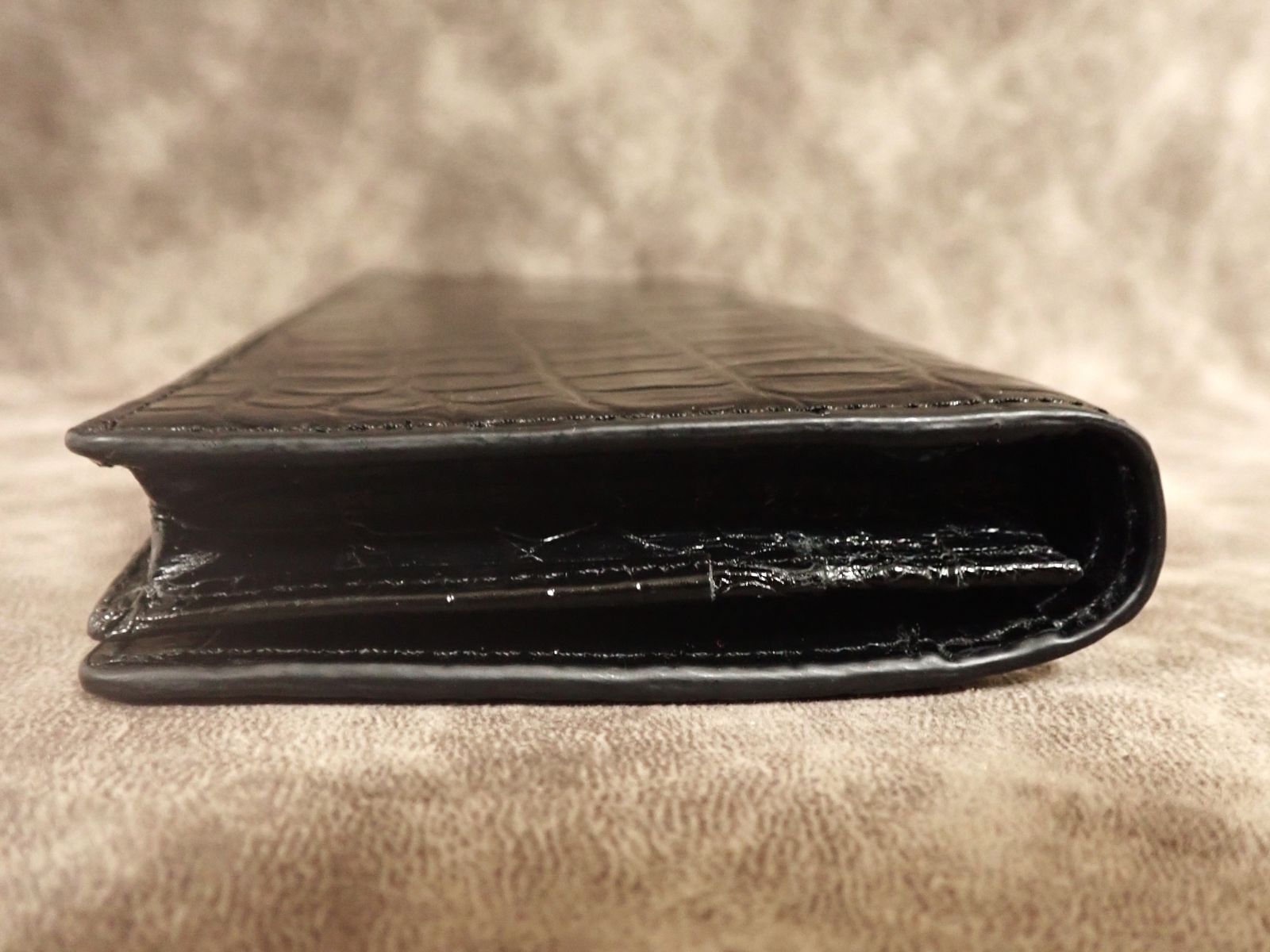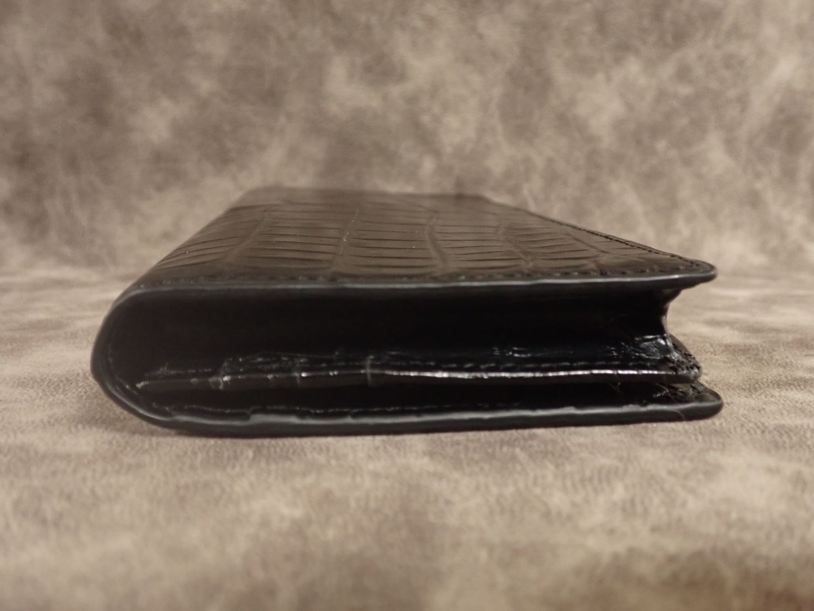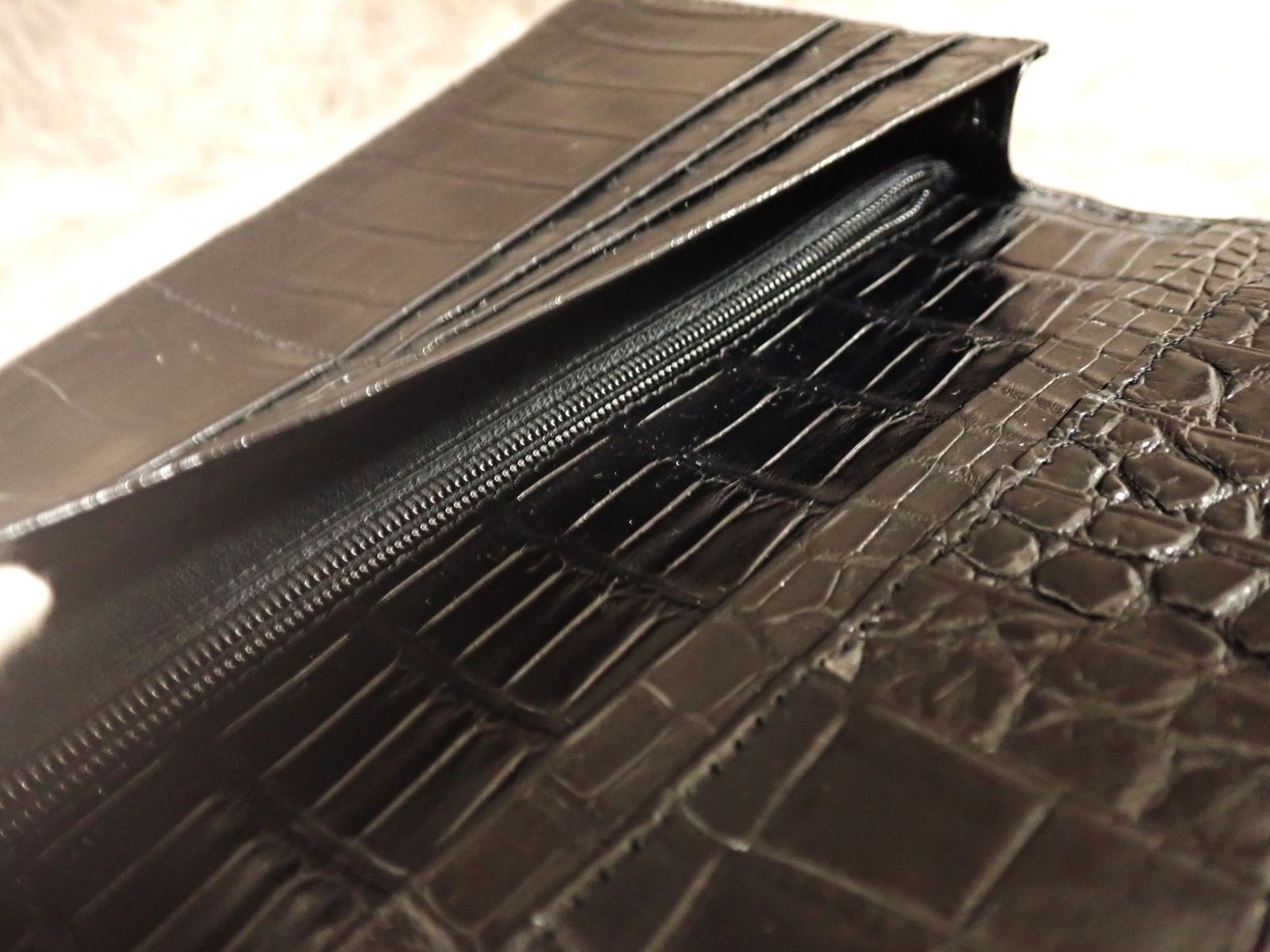 通常のクロコダイル財布は、外装のみクロコダイルを使用し、内側は牛革などの別素材を用いるのが一般的です。また、革の都合で背面で2枚革を縫い合わせる「背割り」仕様が多く見られます。