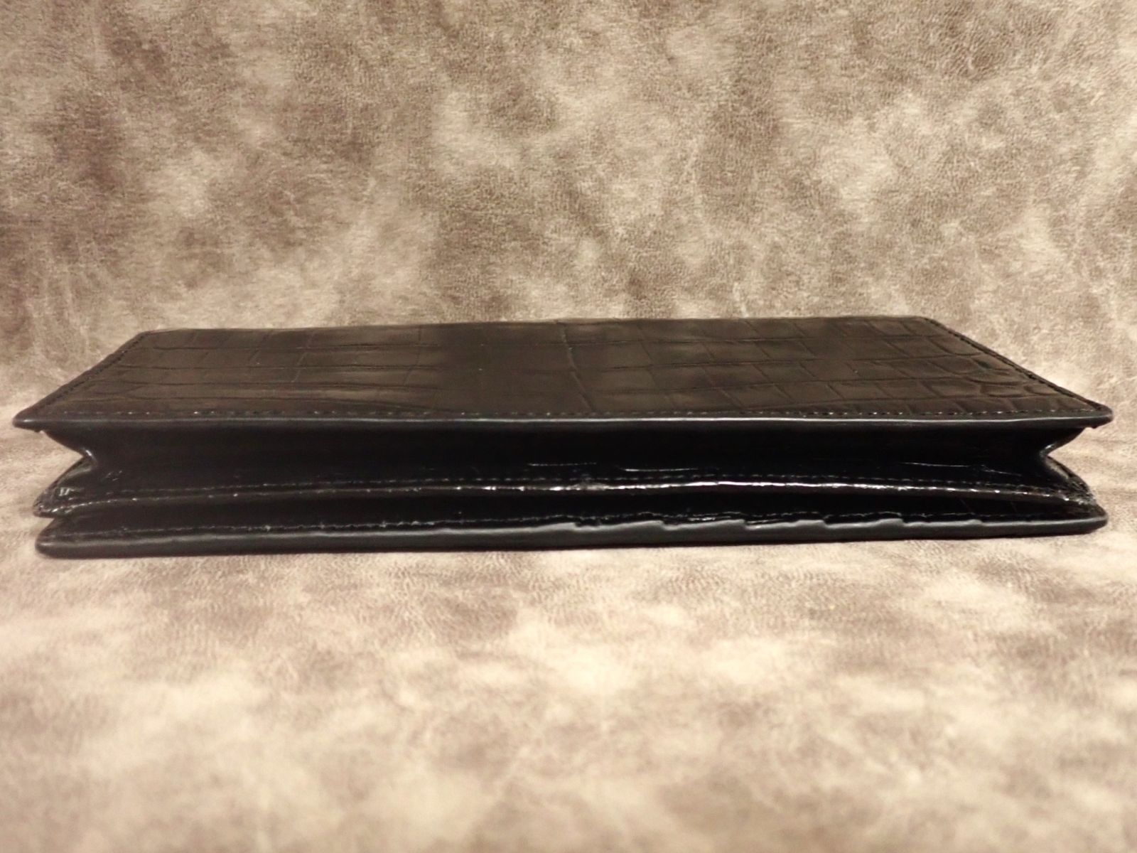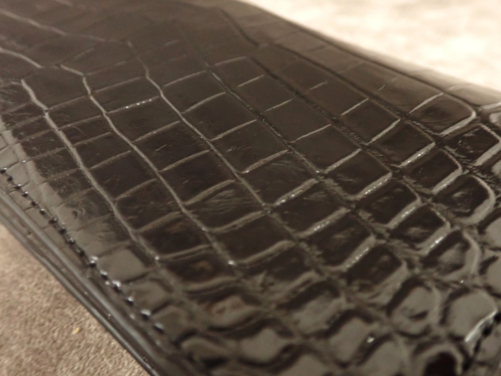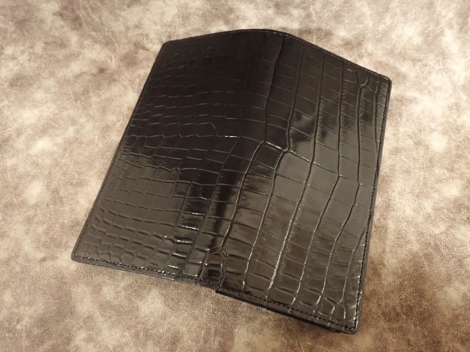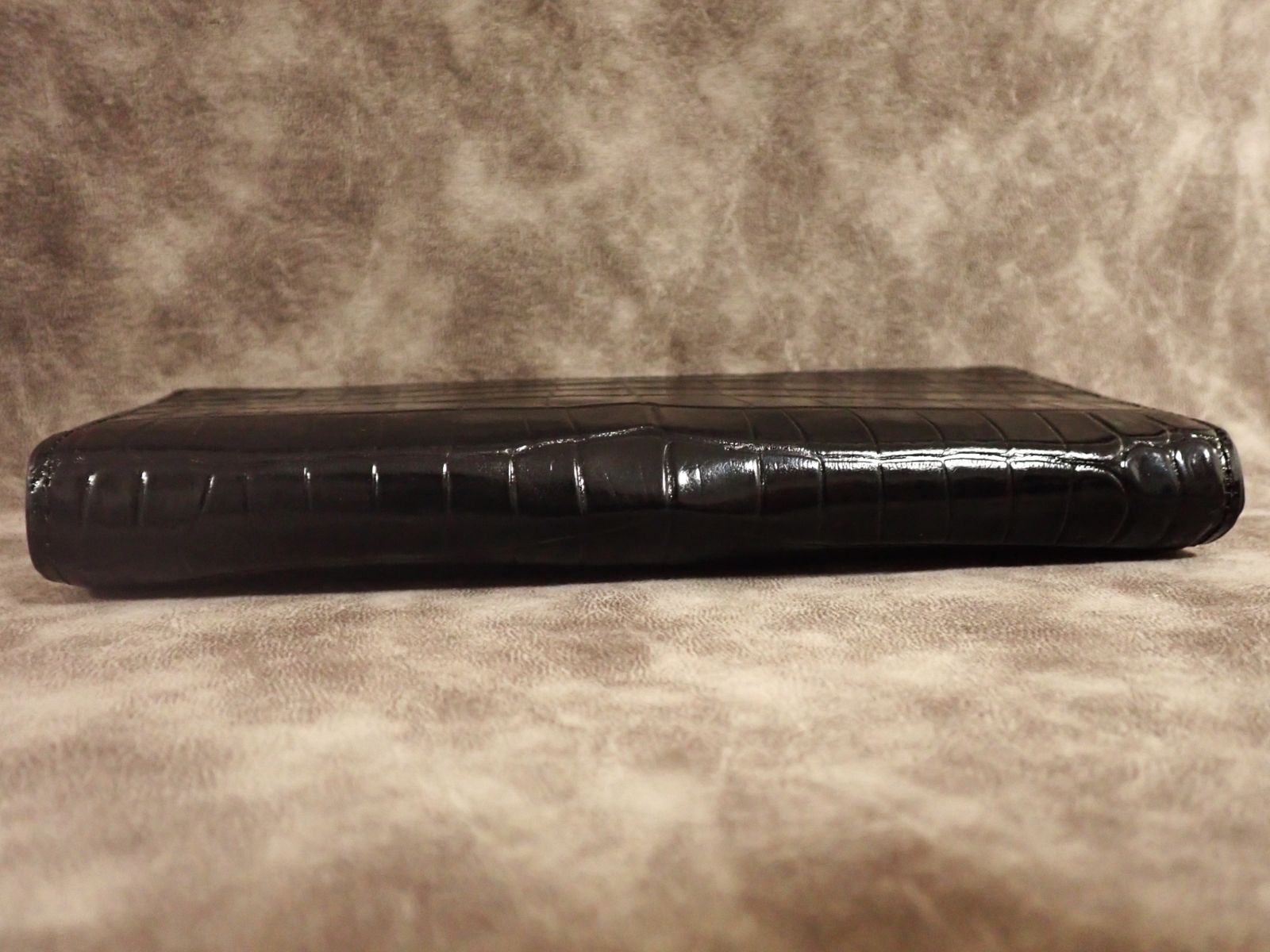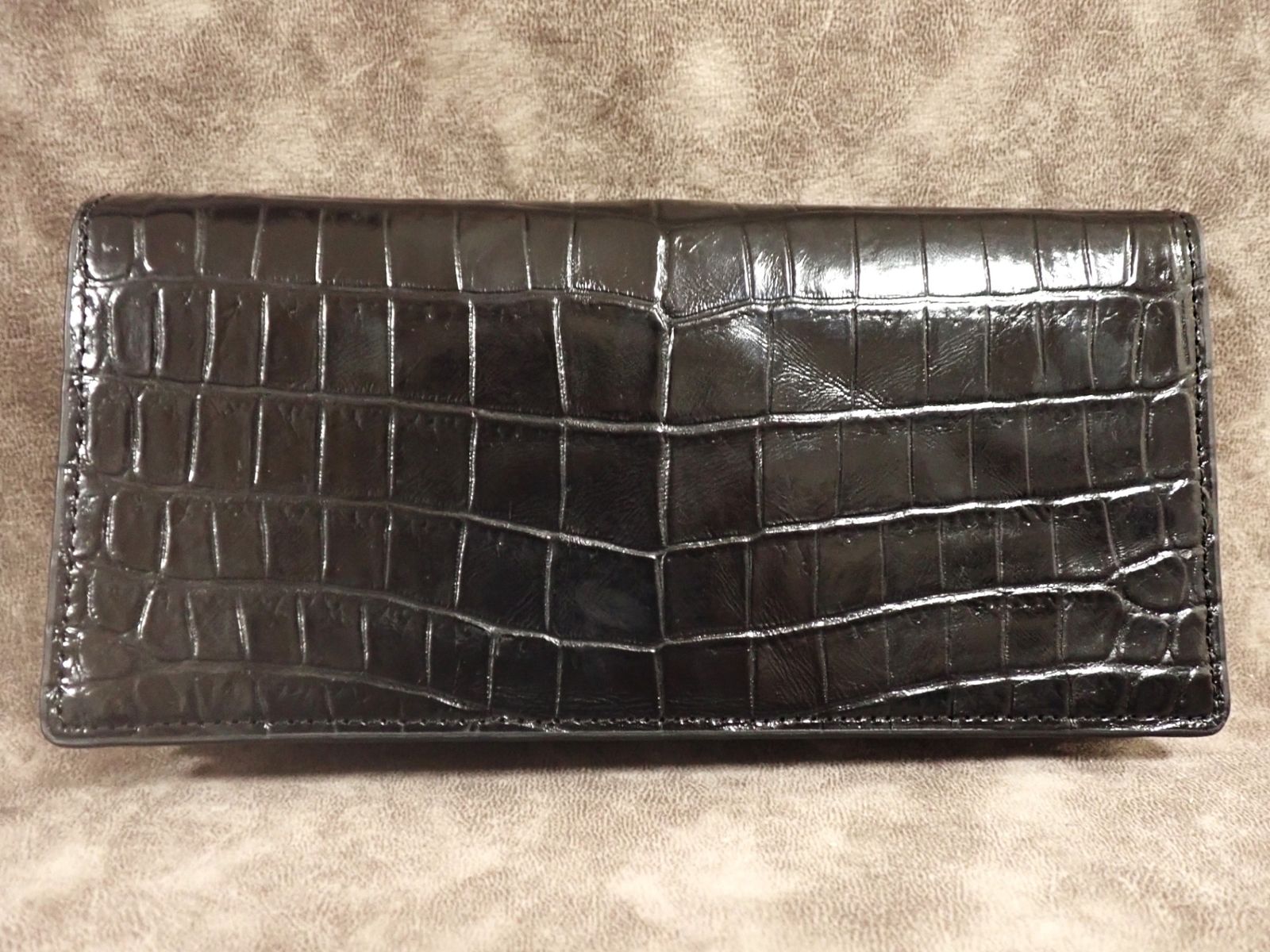 通常のクロコダイル財布は、外装のみクロコダイルを使用し、内側は牛革などの別素材を用いるのが一般的です。また、革の都合で背面で2枚革を縫い合わせる「背割り」仕様が多く見られます。