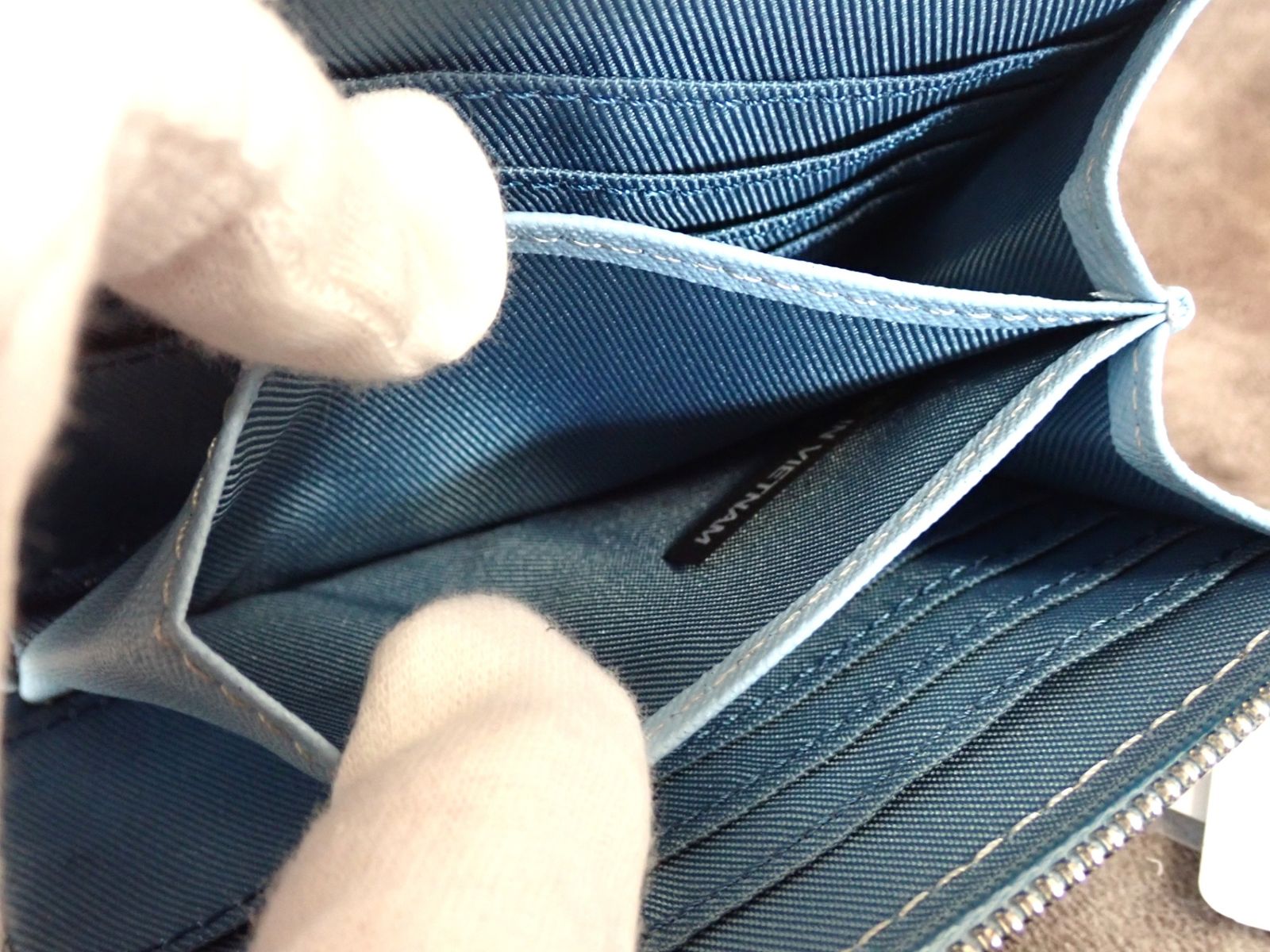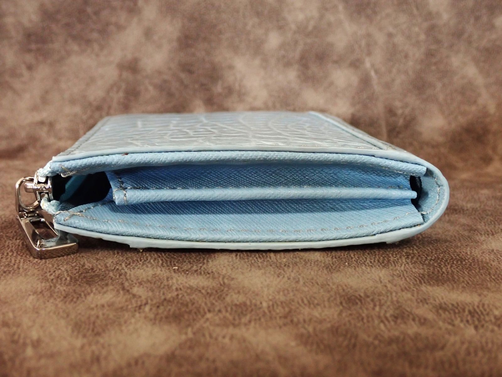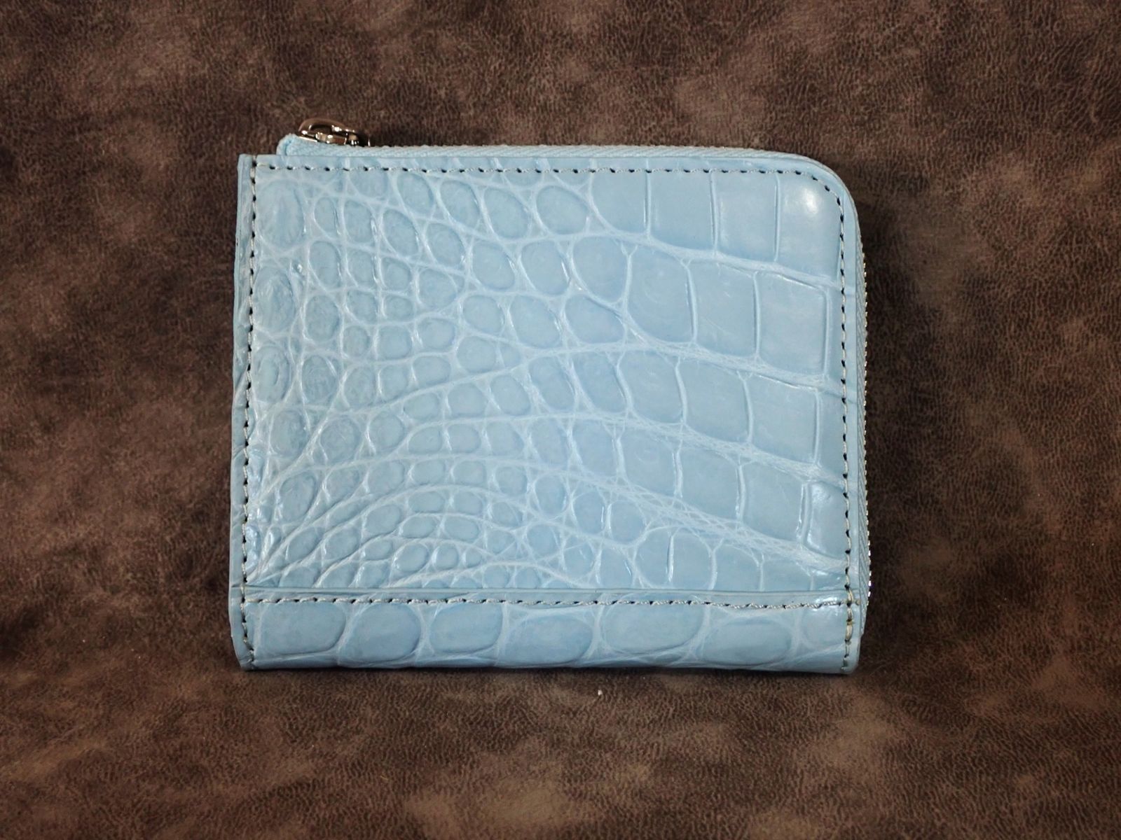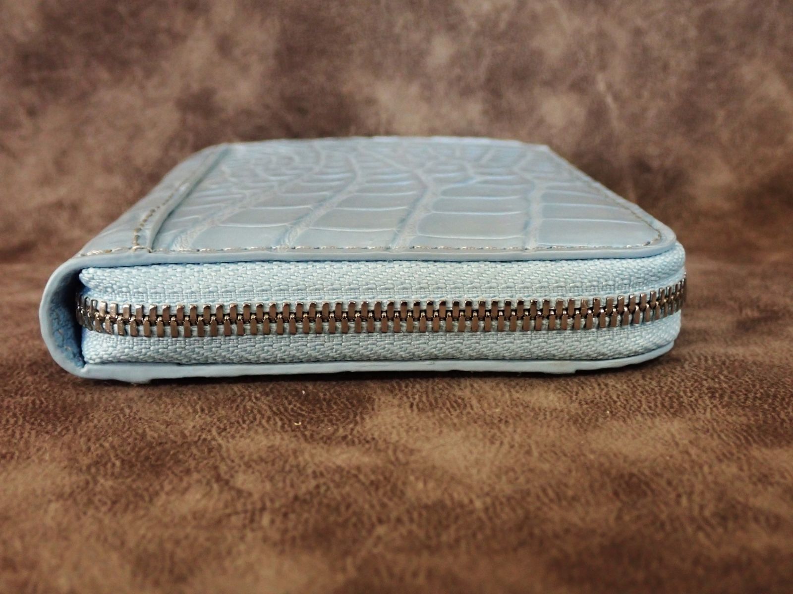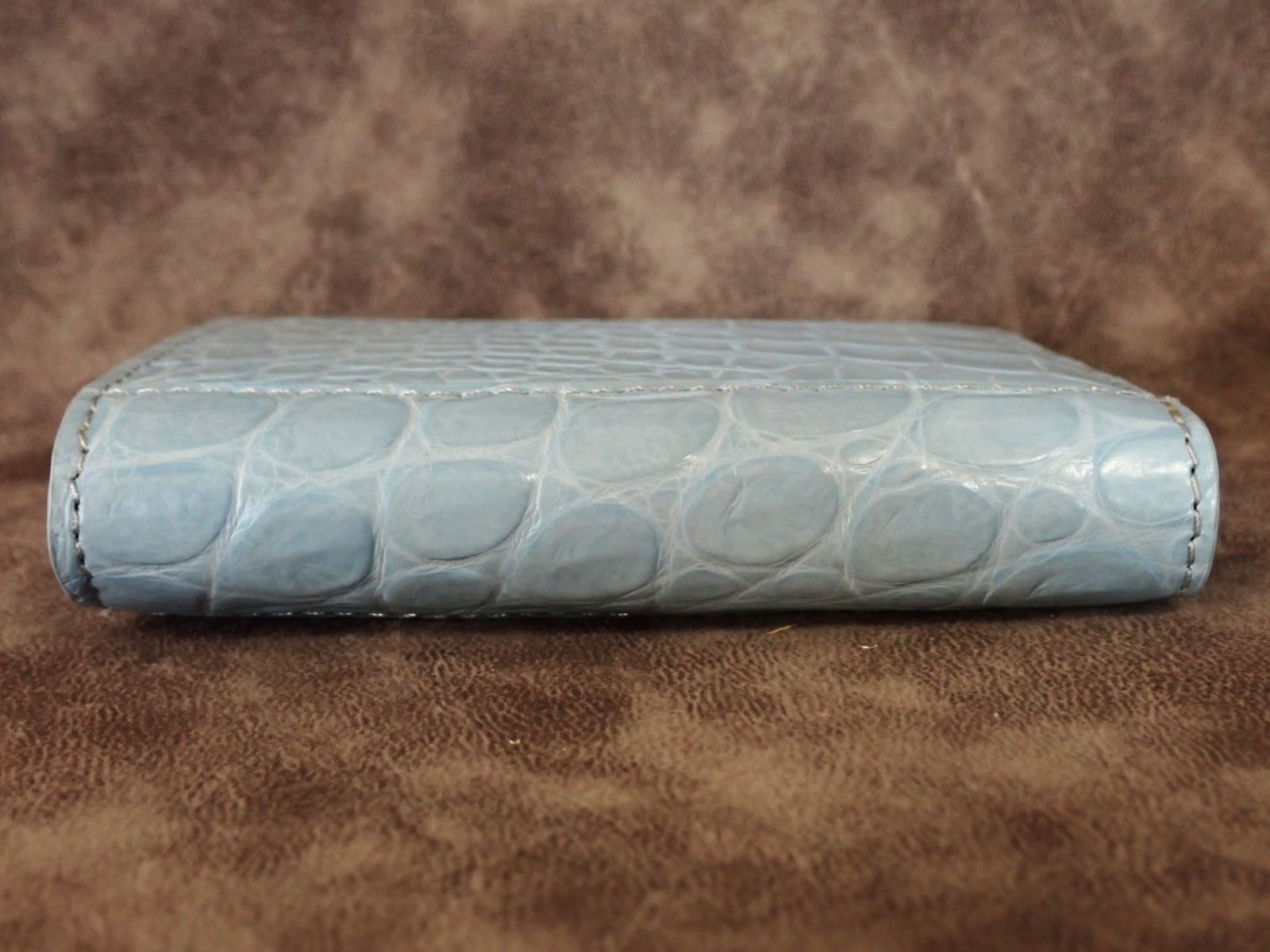 ヘンローン社製のクロコダイル革を使用したかわいらしい水色のコンパクト財布の出品です。
