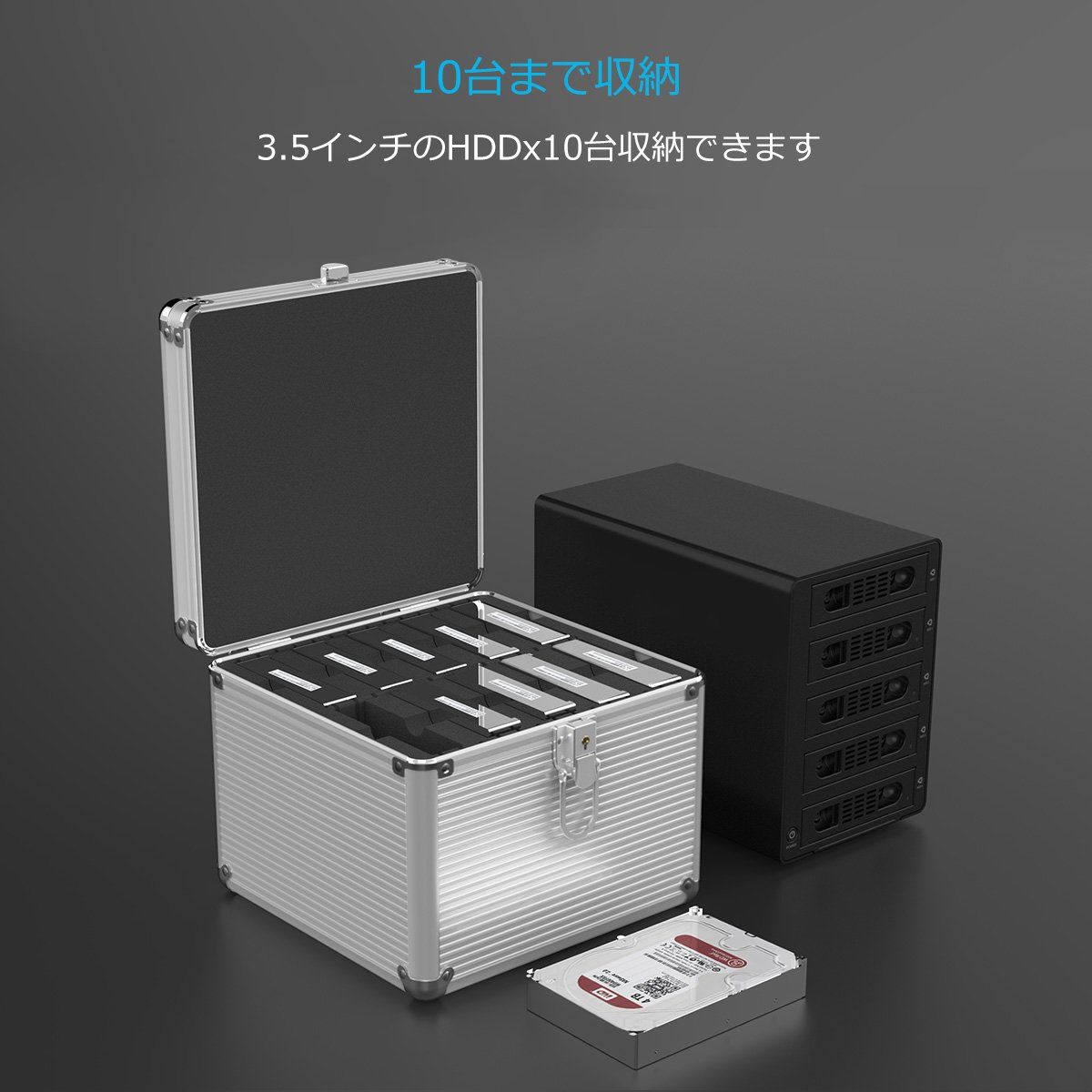 【パッケージ】1x ORICO 3.5インチHDD収納ケース(10台用)、1x ケース鍵、1x ユーザーマニュアル、1x サービスカード 。複数HDDを整理や持ち運びに便利なアルミ製収納ケースです,多くハードディスクを持ち人に最適です。