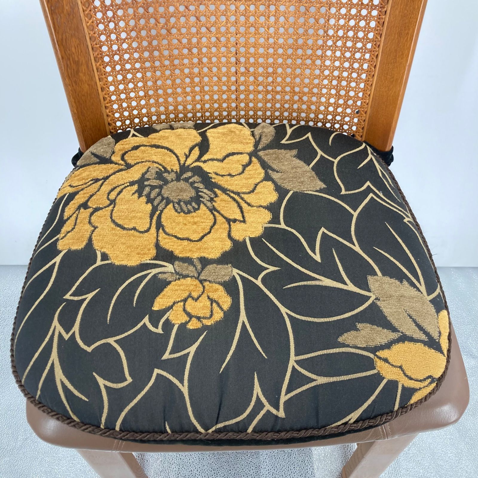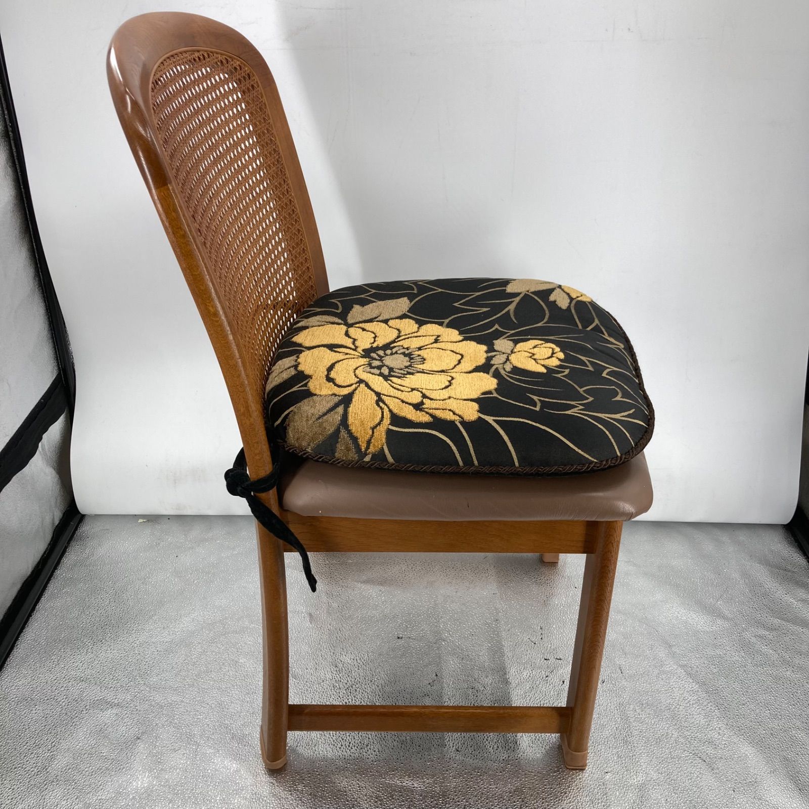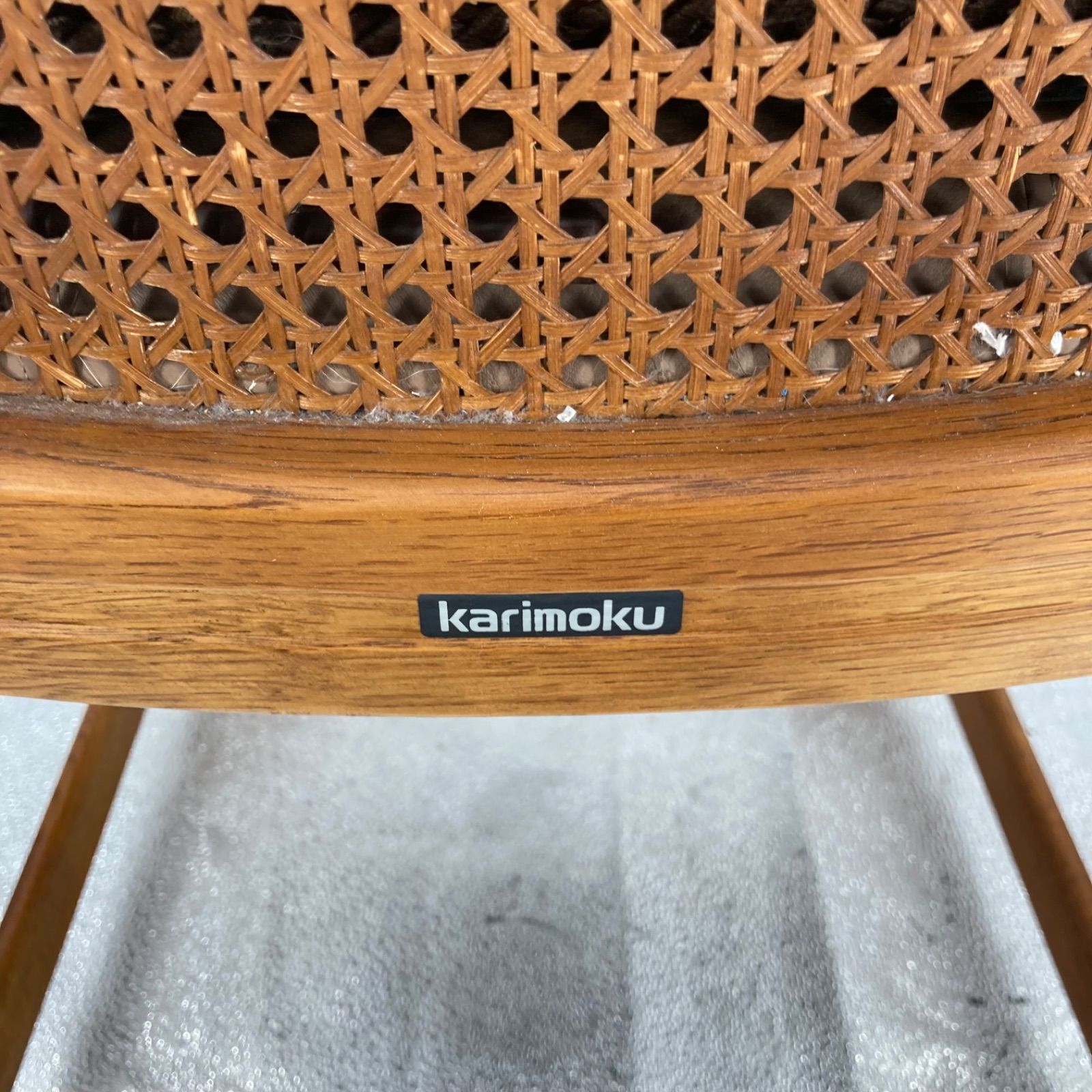 karimoku(カリモク)製の木製ダイニングチェアです。背もたれは籐張り仕様で、座面はクッション付き。昭和レトロな雰囲気があり、インテリアや店舗什器としてもおすすめです。