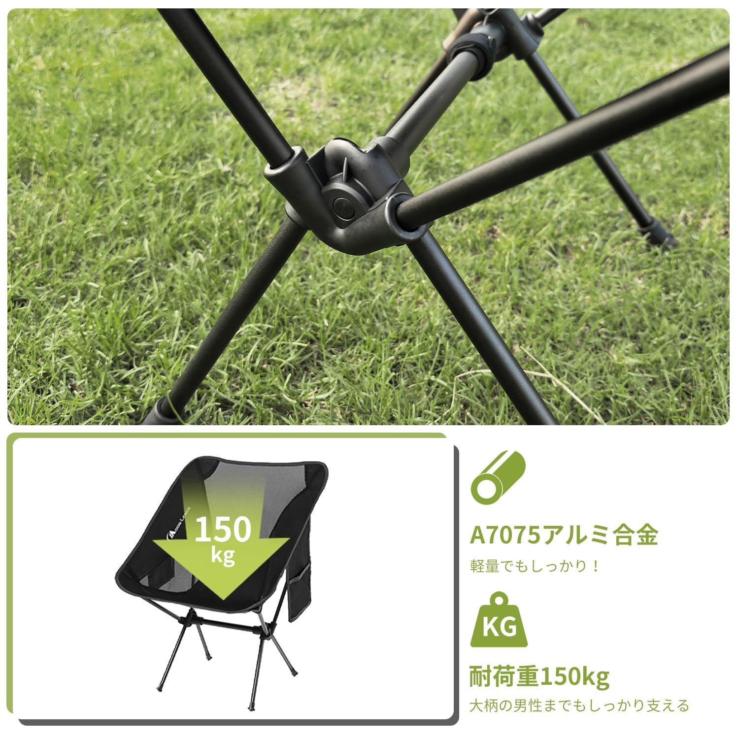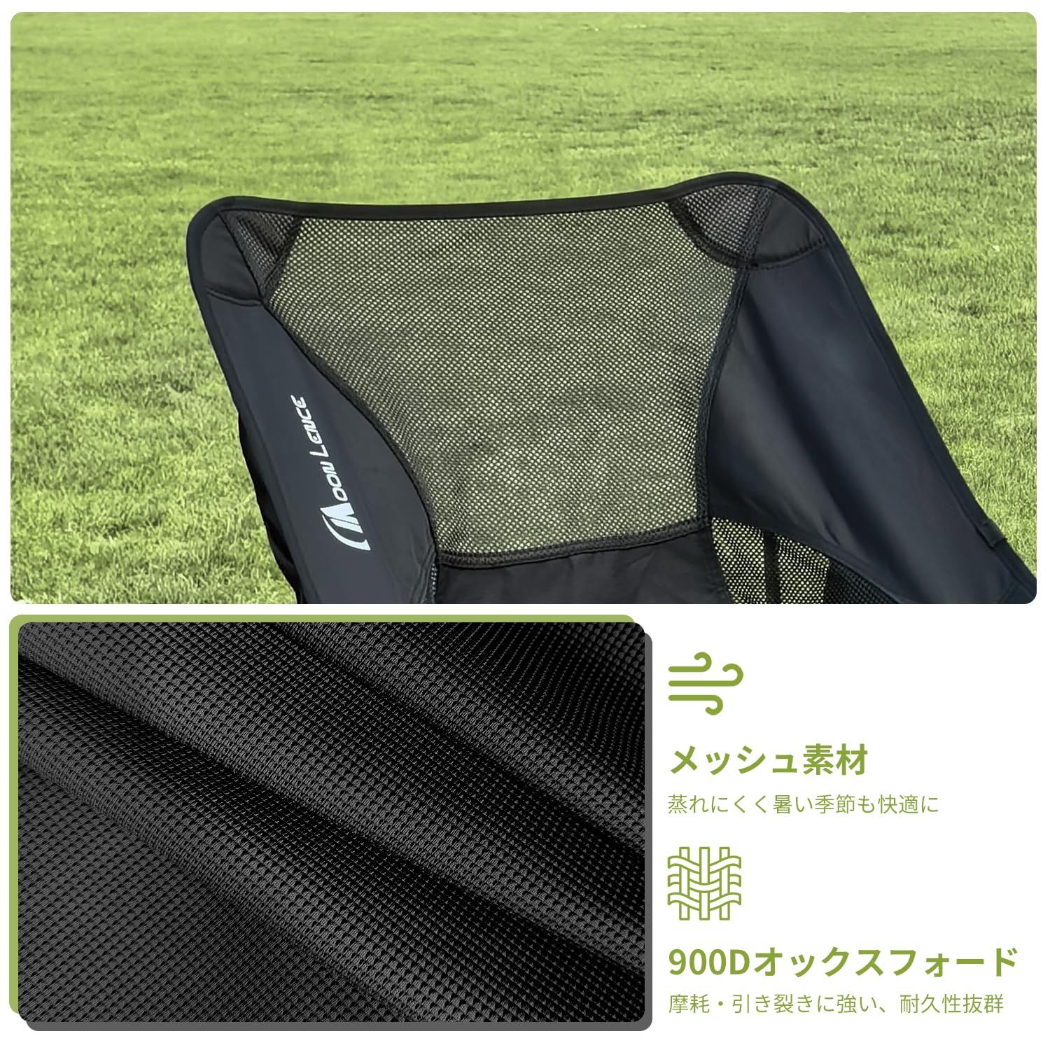 【優れた耐久性&通気性のキャンプ椅子】 フレームには高強度アルミ合金、シートには900Dオックスフォード+メッシュ生地を使用。耐荷重150kgで、大人も安心して使えます。通気性抜群で夏場も快適!