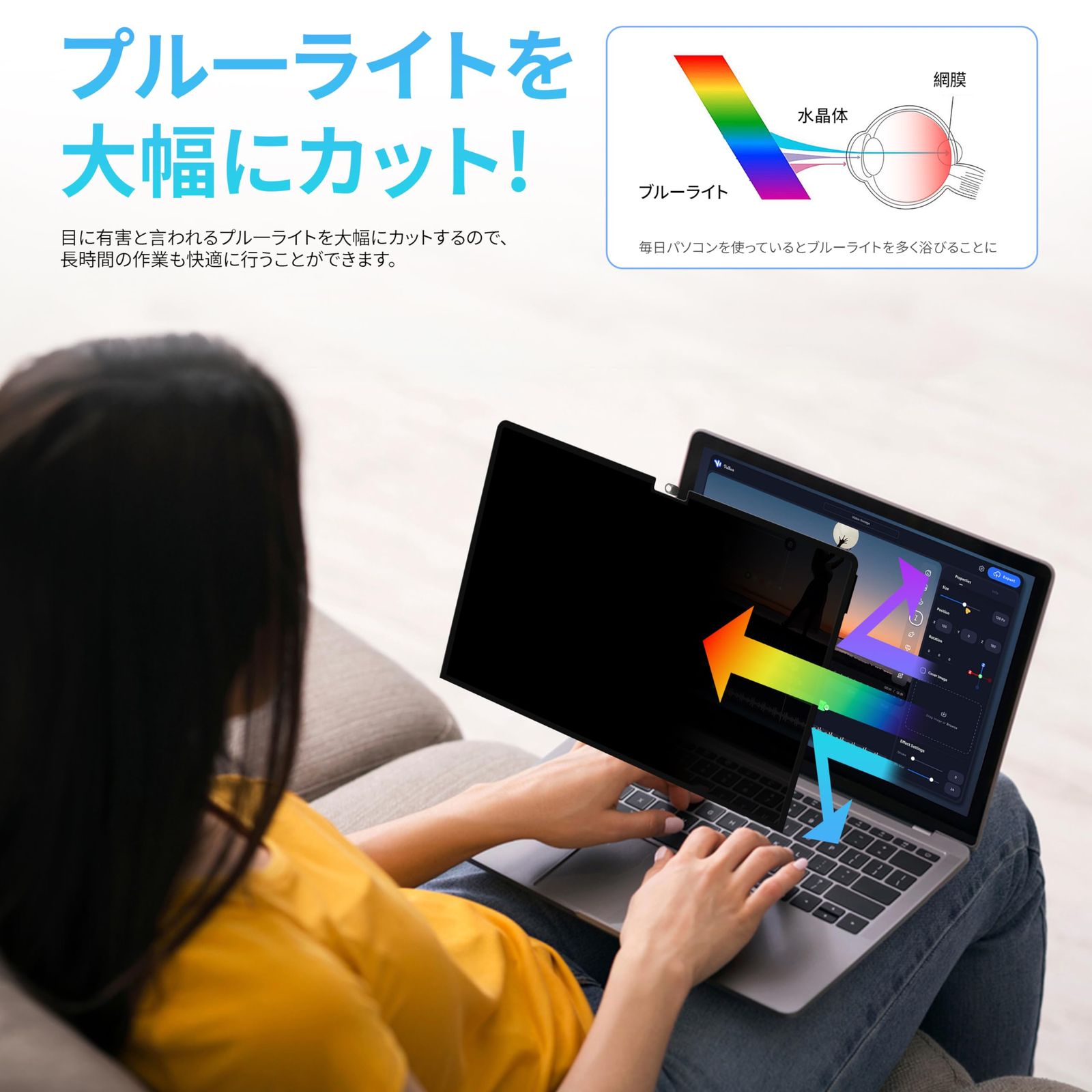 【ブルーライトカット&反射軽減】ブルーライトを浴びすぎて、ドライアイや眼精疲労、悪化すると頭痛や睡眠障害など「デジタル時差ボケ」になる可能性が高いです。本Macbook pro 14 プライバシーフィルターはブルーライトを約59%遮断し、紫外線も99.9%をカットすることによって、長時間のパソコン作業される方を有害光線から目を守ります。お客様のMacbook pro 14にぴったり合うブルーライトカットフィルムです。