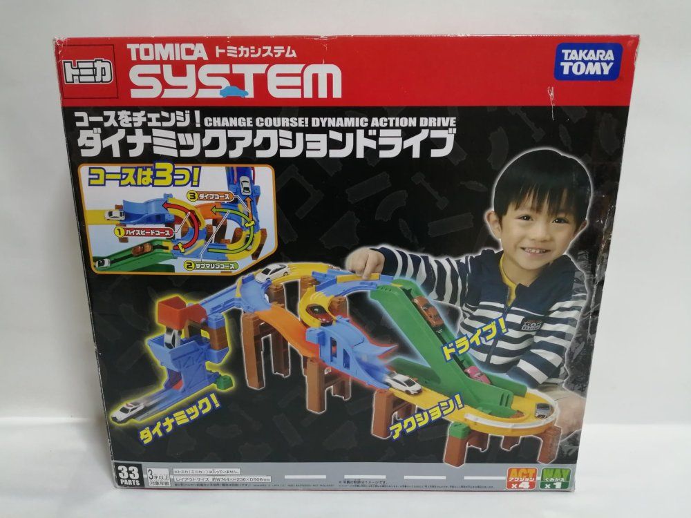 トミカの走行コースが、立体合流どうろで1つに結ばれる2つの自動循環コースと、コース外にトミカが飛び降りるダイブどうろに至るコースの3通りあります。