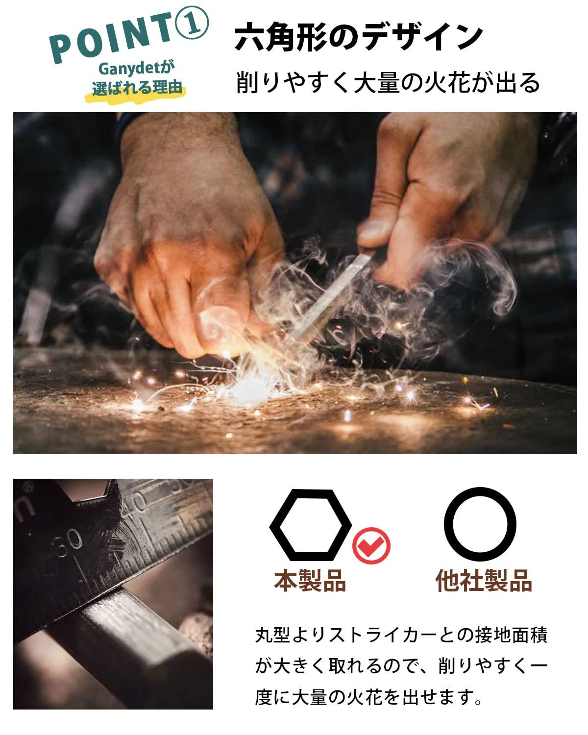【着火しやすい】ロッド形状が六角形なので、丸型よりもストライカーとの接地面積が大きく、大量の火花が出ます。全長10cm、直径1cmの大きいサイズもポイントです。ロッドが長いとストロークが長くなり、一度に大量の火花を飛ばせるので火を起こしやすくなります。初心者の方には「長めのもの」がおすすめです。