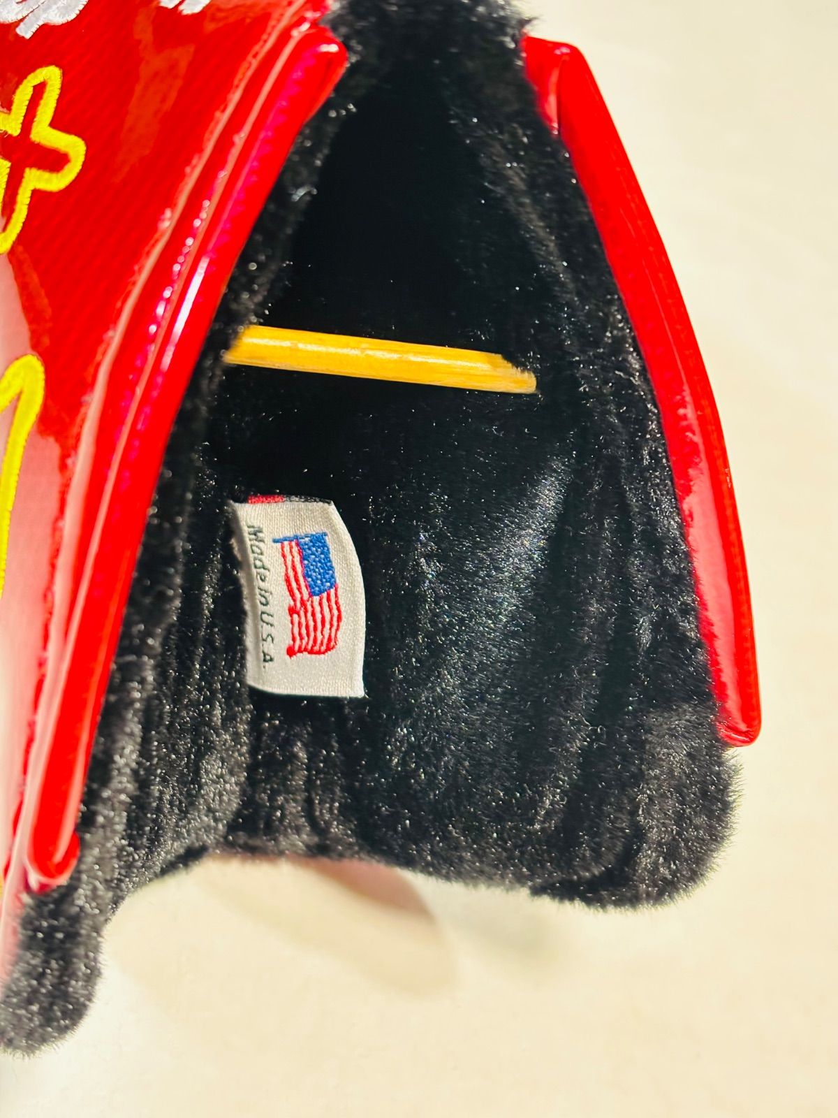 カーボン調エナメル生地で作られており強い光沢感のあるエナメル生地に高級感ある刺繍が施されています