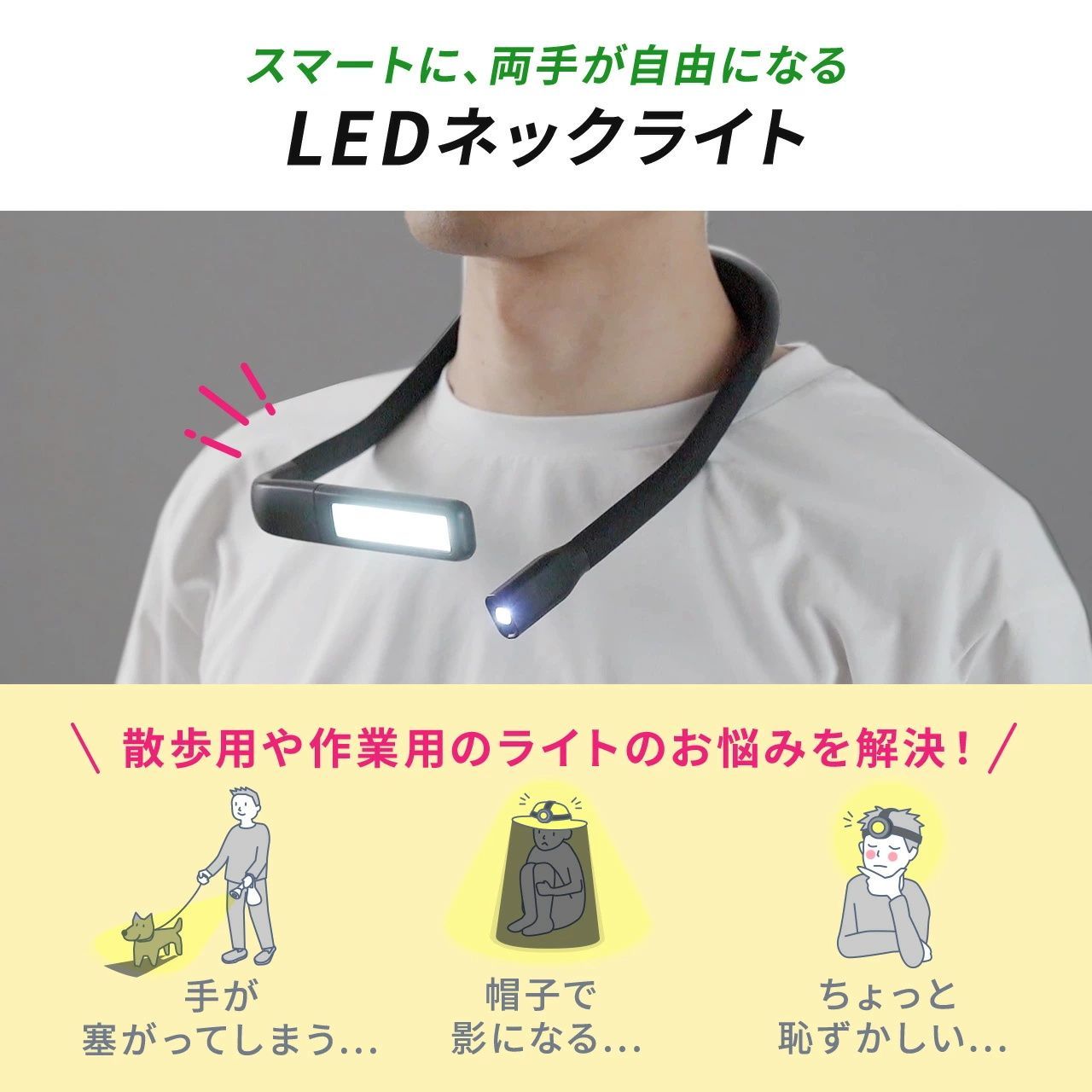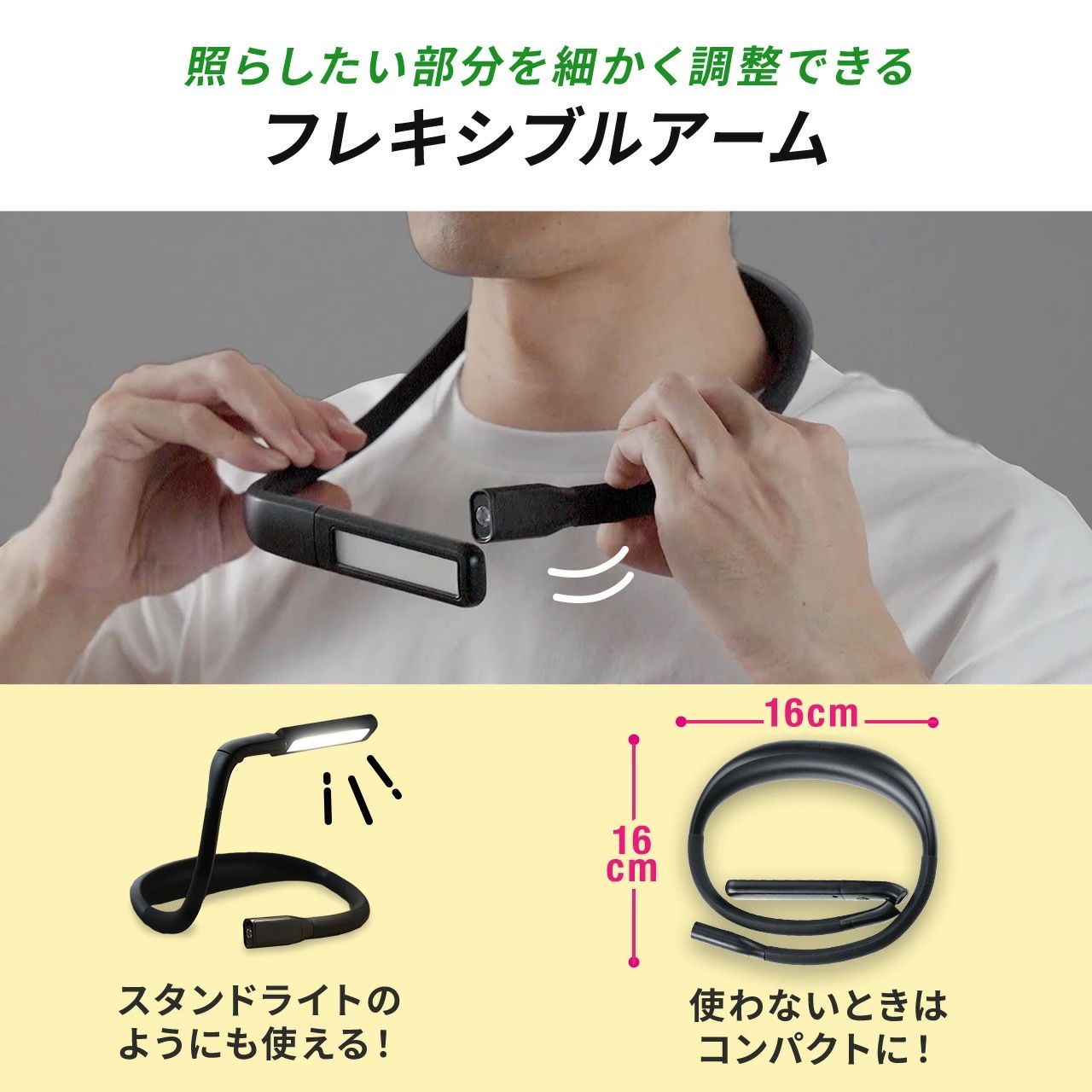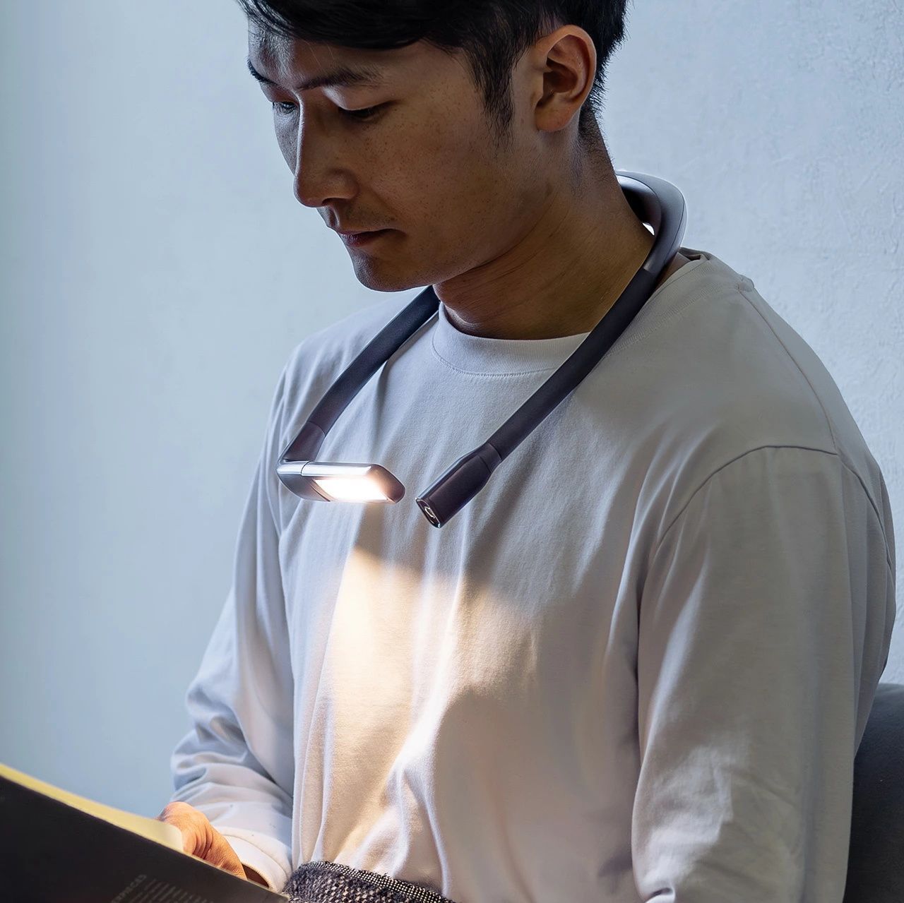 首に欠けてハンズフリーで使用できる、2種類のLEDを搭載した首掛けネックライト。フレキシブルアームで自由な向きに明かりを調整可能。最大180ルーメンで、IPX4の防水規格取得。