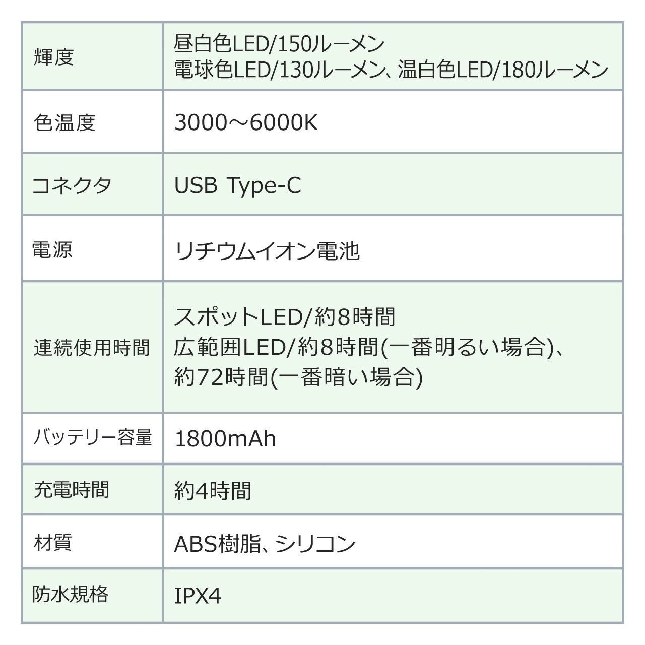 ■連続使用時間:スポットLED/約8時間、広範囲LED/約8時間(一番明るい場合)、約72時間(一番暗い場合)
