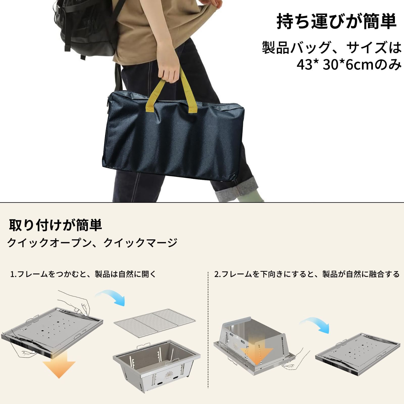 【幅広い用途】ビーチ、バーベキュー、キャンプ、公園、庭、釣り、花見など。また、室内でも使用できます。専用の収納バッグ付きで、IH調理器も対応です。持ち運びも設置も簡単です。