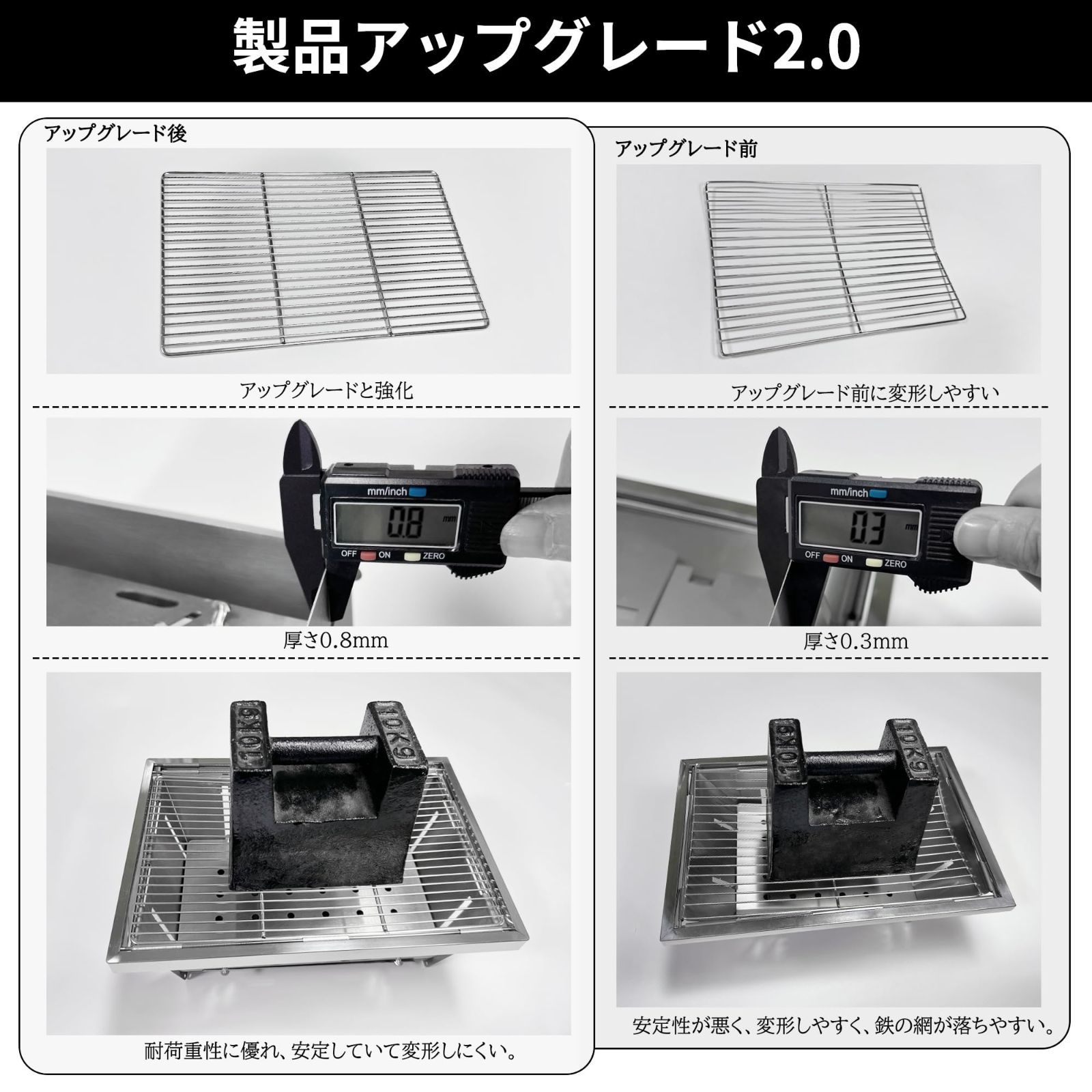 【材質】 折りたたみグリルの本体は430ステンレス鋼で作られ、430ステンレス鋼を使用することができ、耐熱性があり、変形しにくい。グリル側のフレームは201ステンレス鋼で作られ、優れた反射特性、非常にスタイリッシュです。グリルネットは304ステンレス製。