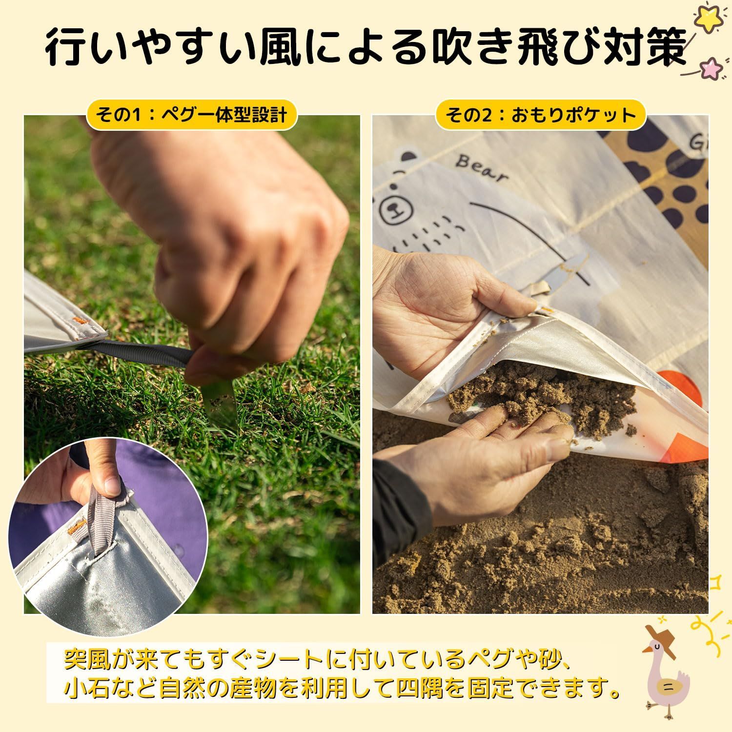 便利な本体とペグ一体型:??四隅にコンパクトなペグが付属、「ペグだけ忘れちゃった!」なんて事態を避けられます。四隅の重りポケットとペグでしっかり固定できます!