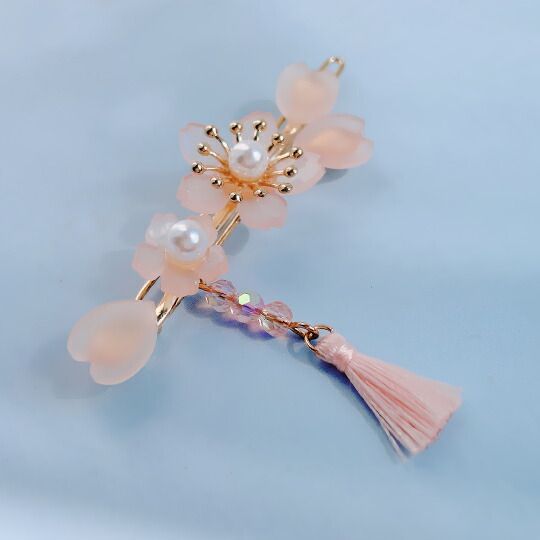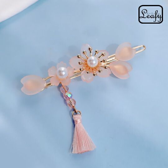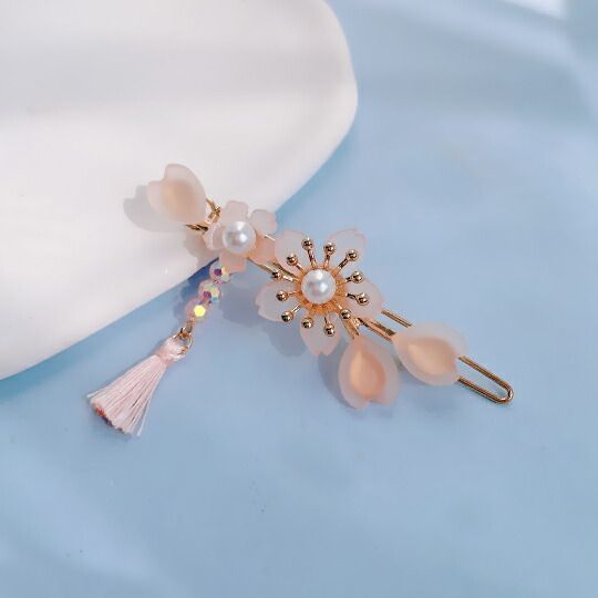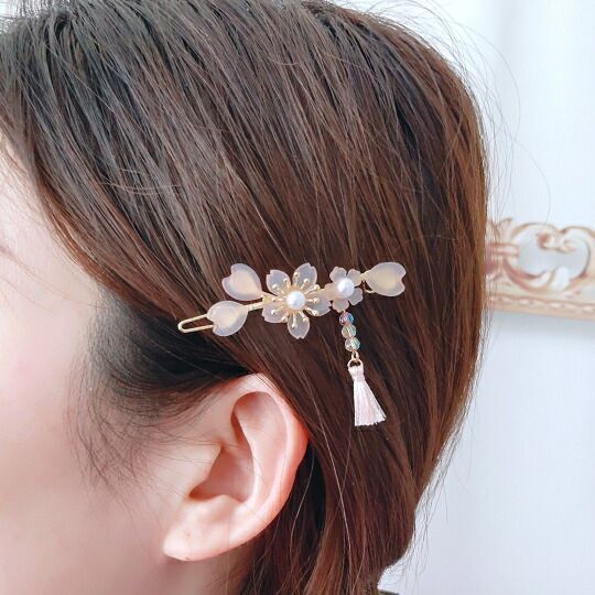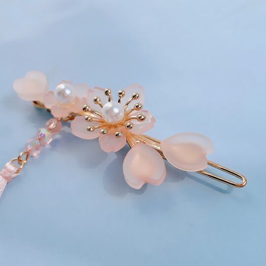 中央に輝くパールが、上品な華やかさを添えます。淡いピンクカラーが春の装いや、和装(浴衣など)にぴったり。